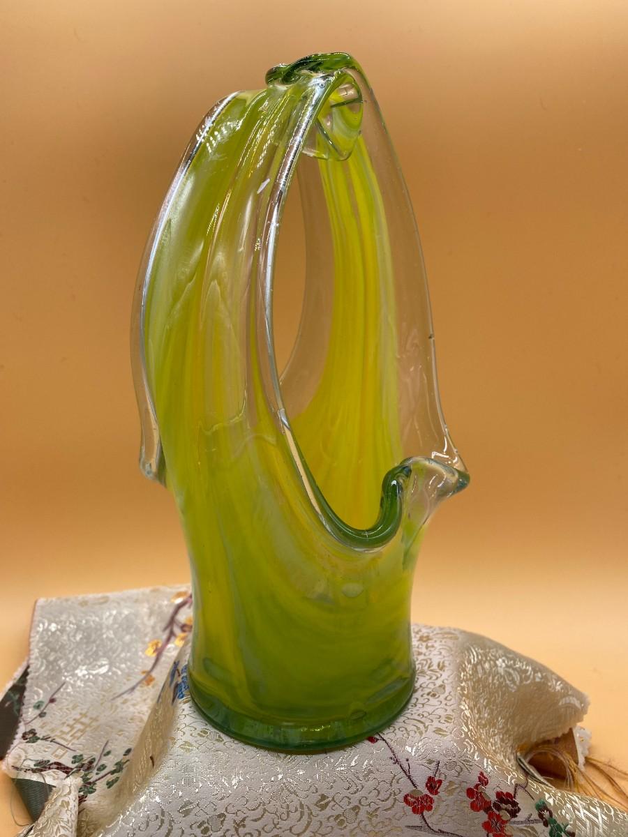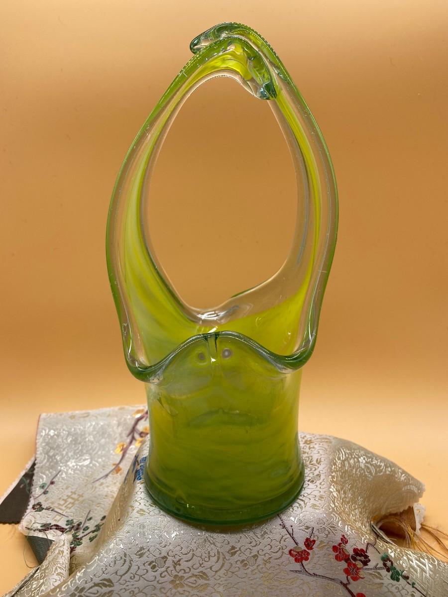 Beautiful pale green blown glass vase in a basket style, no makers mark.