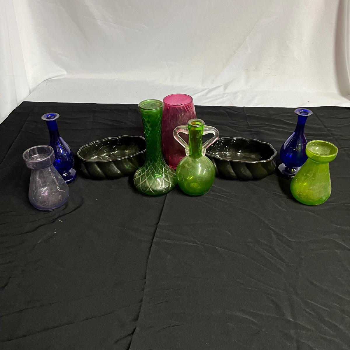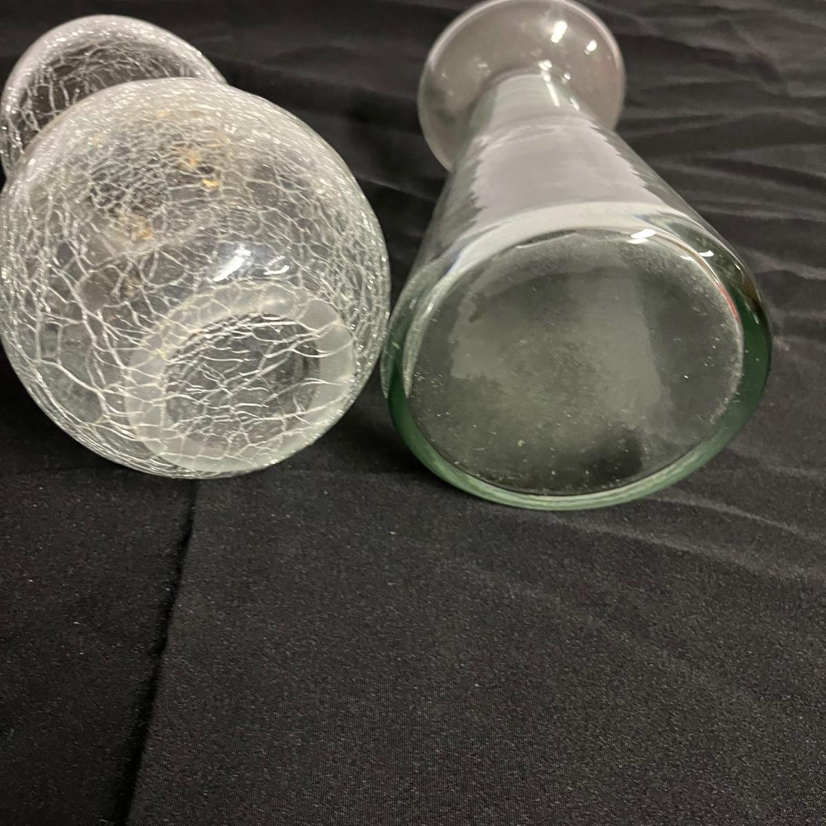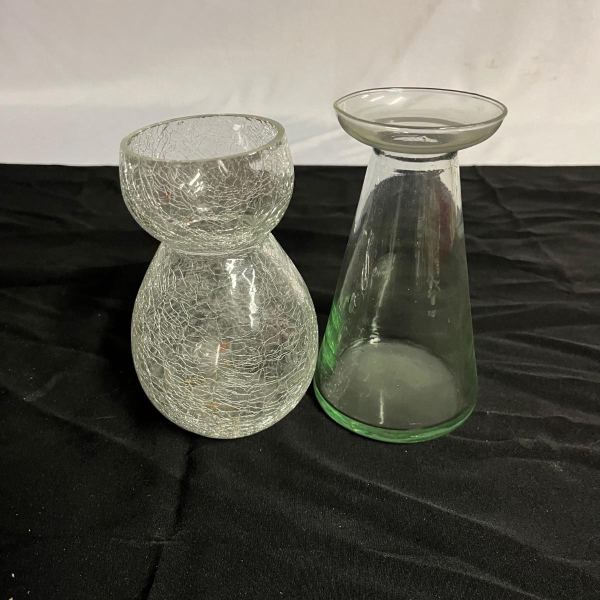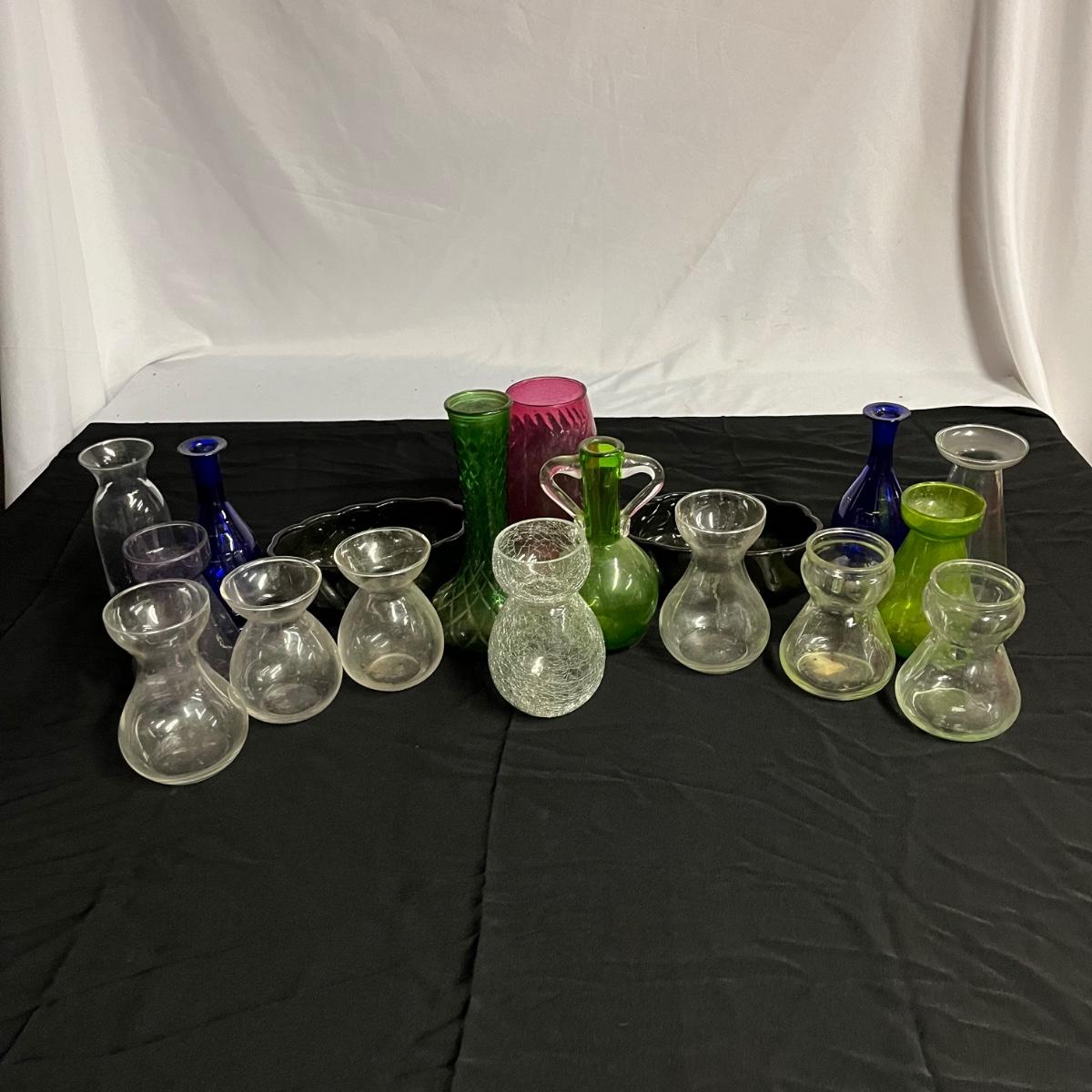 Lot includes two blue and one green blown glass vase, six clear bulb vases, purple and green bulb vases, crackled glass vase and more.