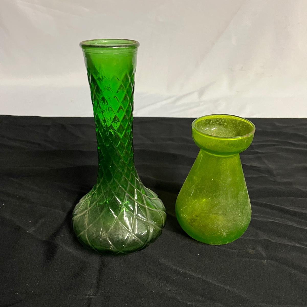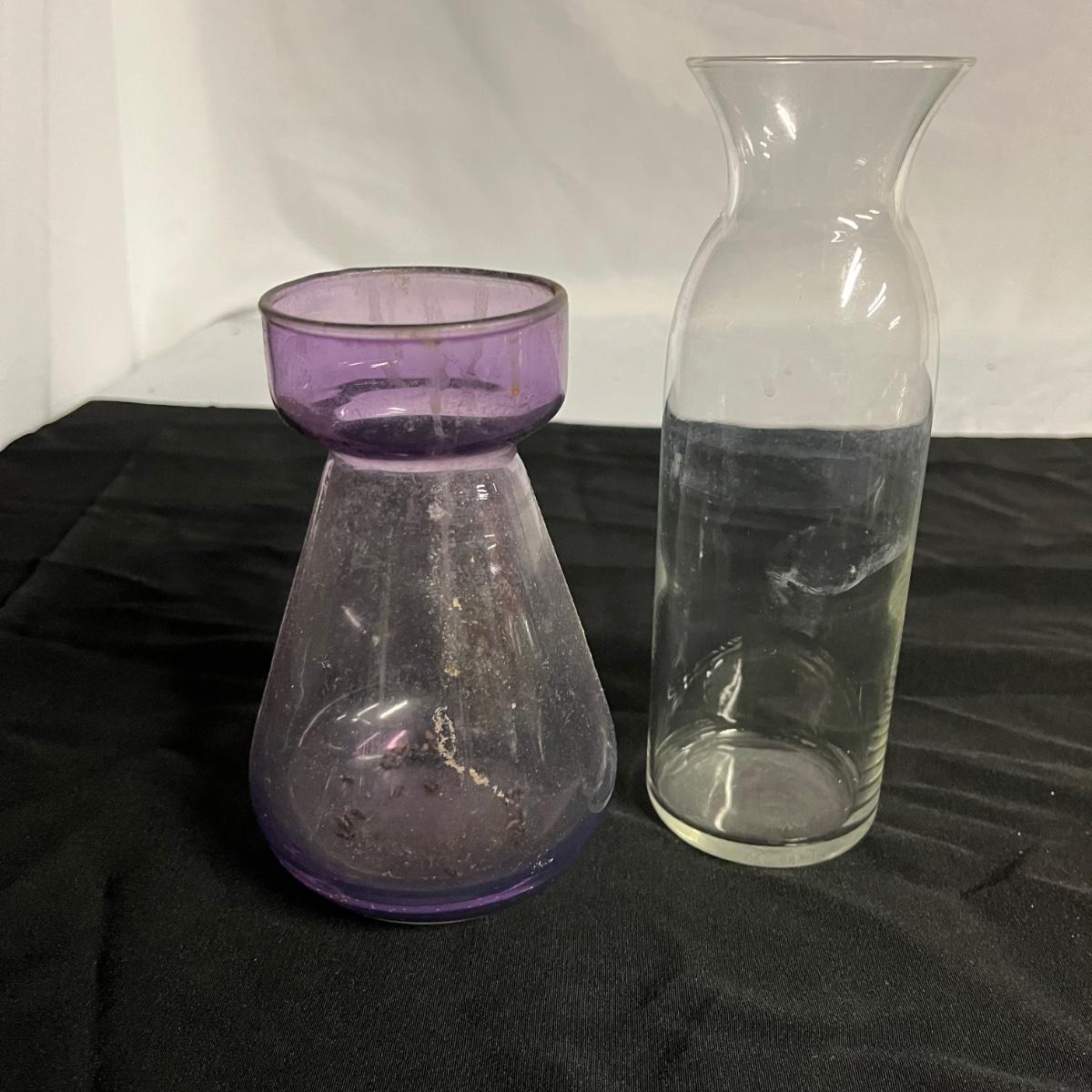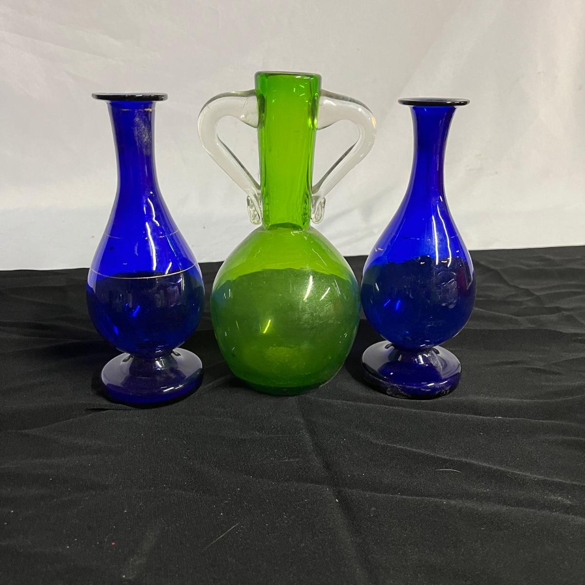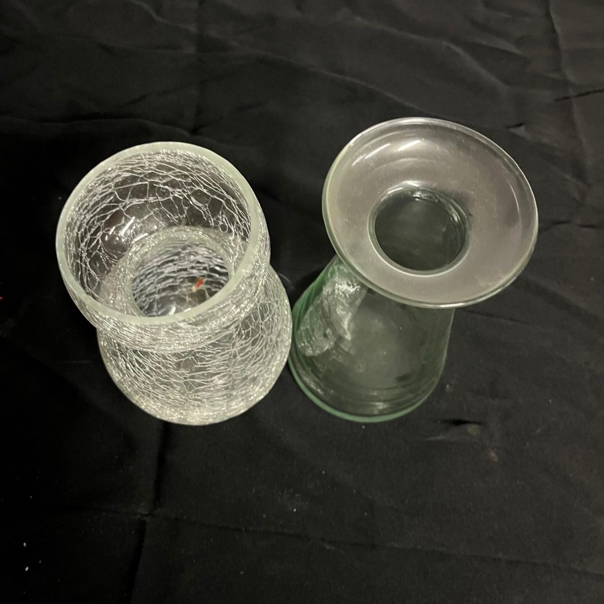 Lot includes two blue and one green blown glass vase, six clear bulb vases, purple and green bulb vases, crackled glass vase and more.
