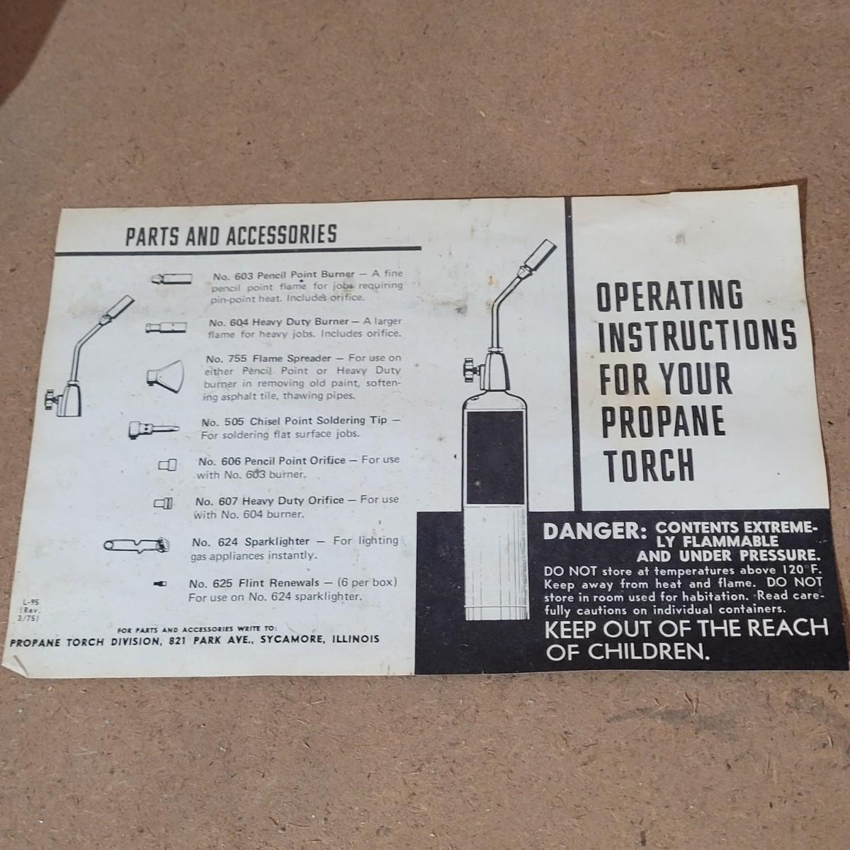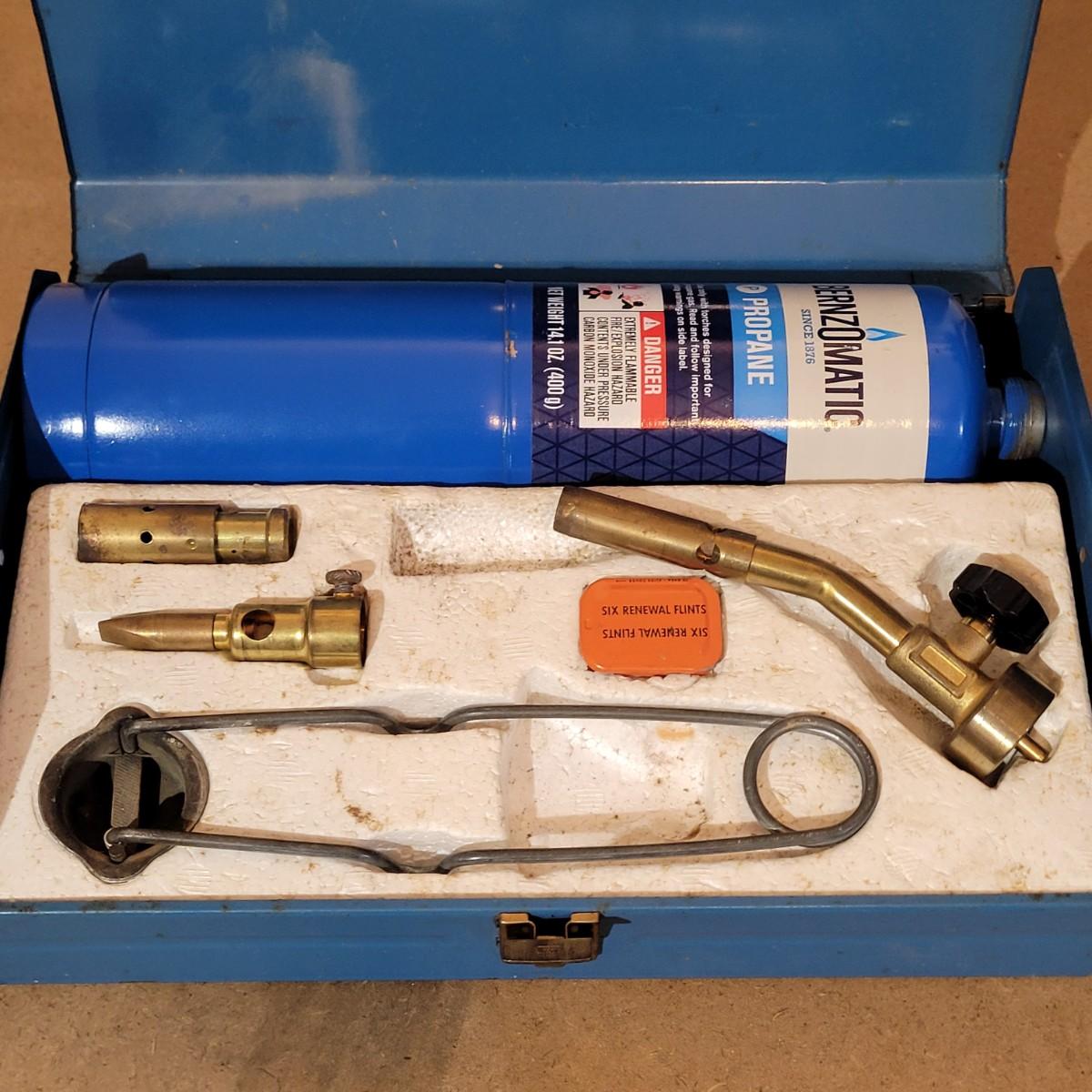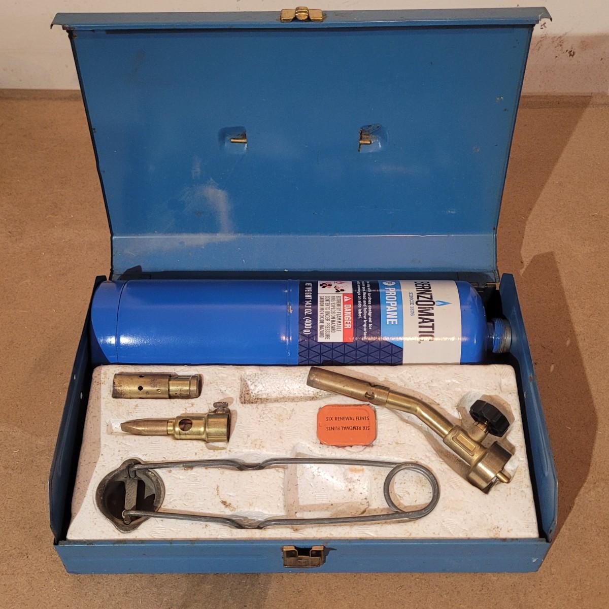 Bernzomatic propane blowtorch kit with carrying case. Torch ignited when tested. Includes various nozzles and attachments. Also includes flint and steel with extra flints. Case is made from metal and measures 11" x 8" x 4"H and contains original paperwork.