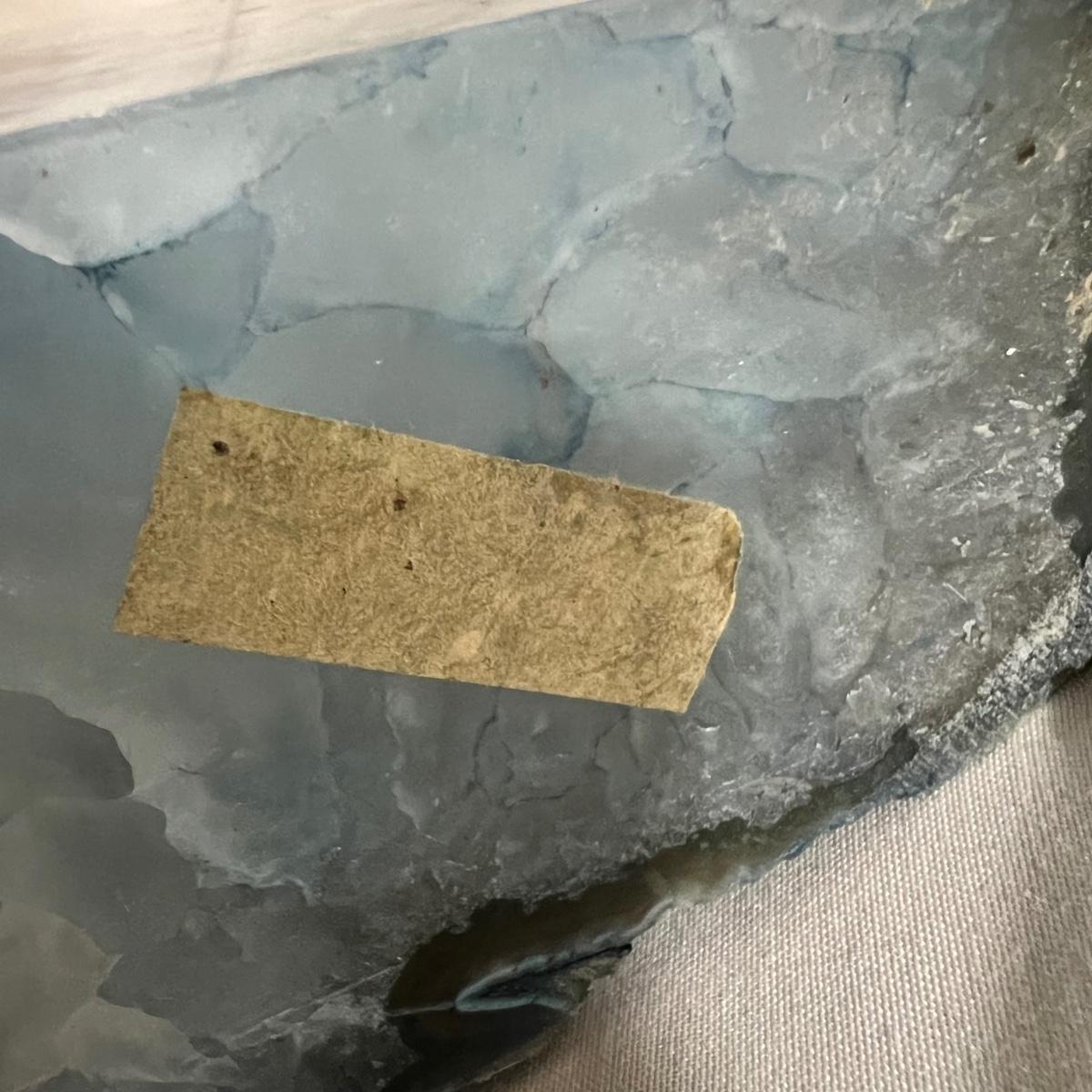 This stunning pair of agate bookends appear to have been expertly cut down the middle to reveal a dramatic interior of crystalline quartz with banding in shades of blue, ivory, and grey. One has a faded sticker on the bottom, any marking is no longer visible. Each measure approximately 3” x 3.5” x 6.5”H.