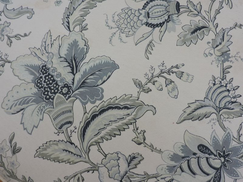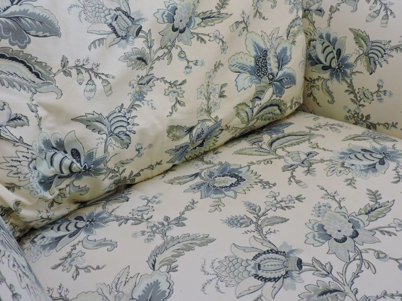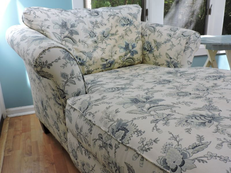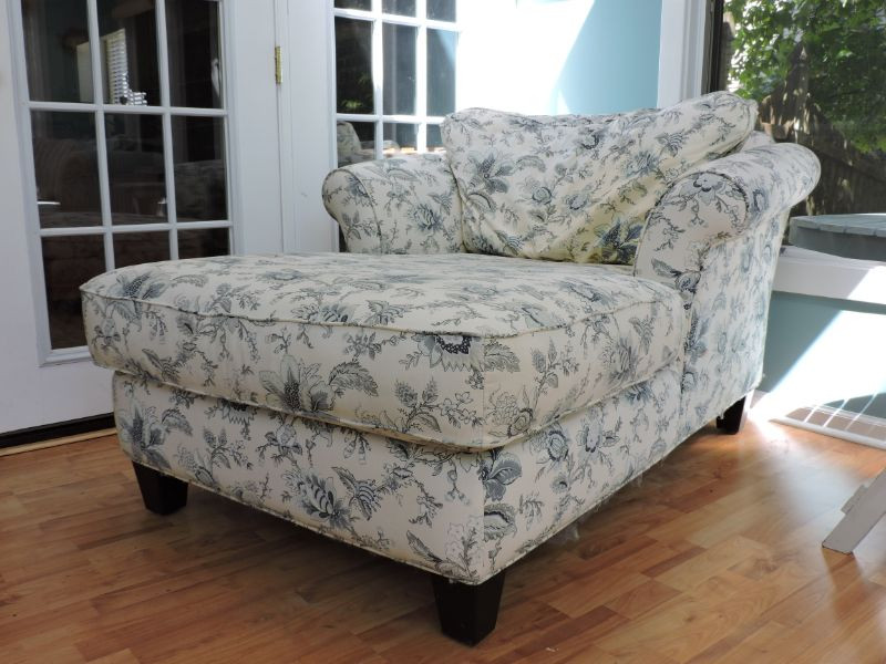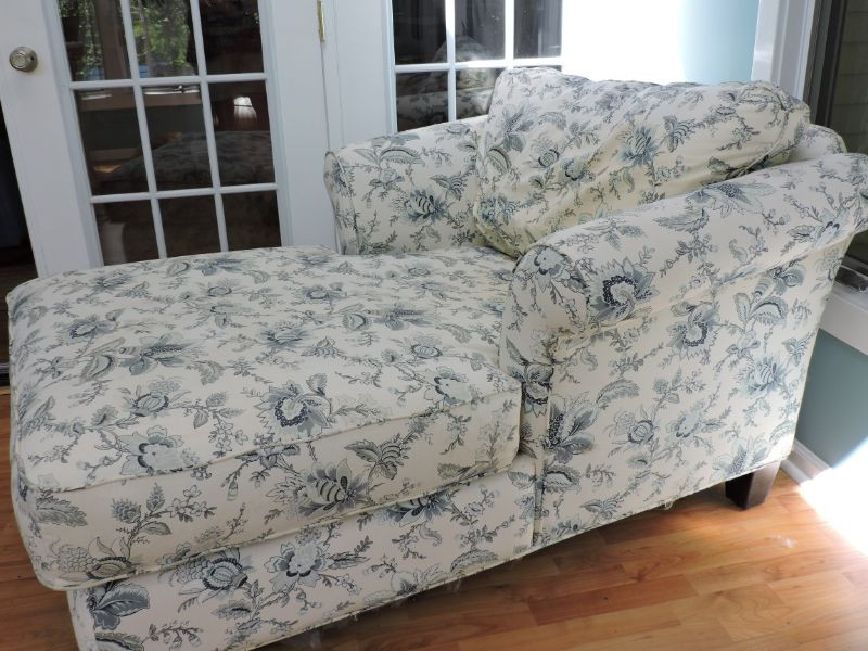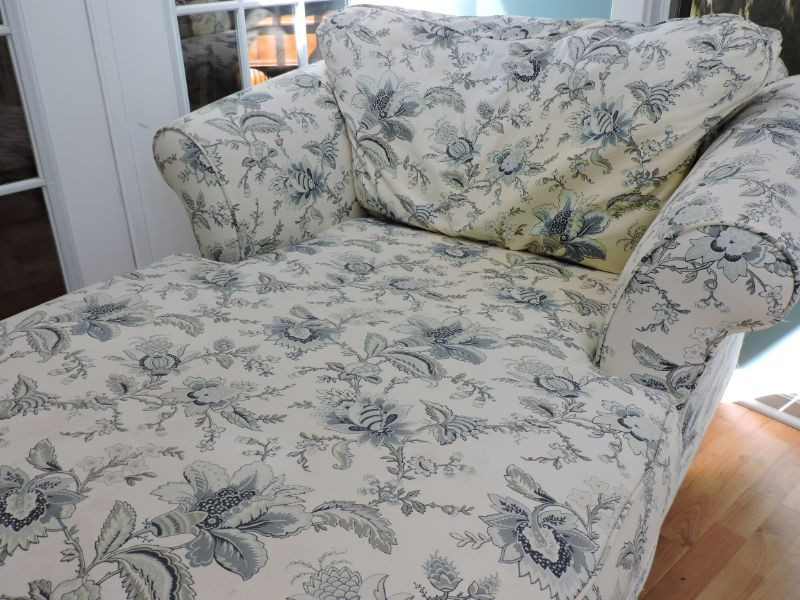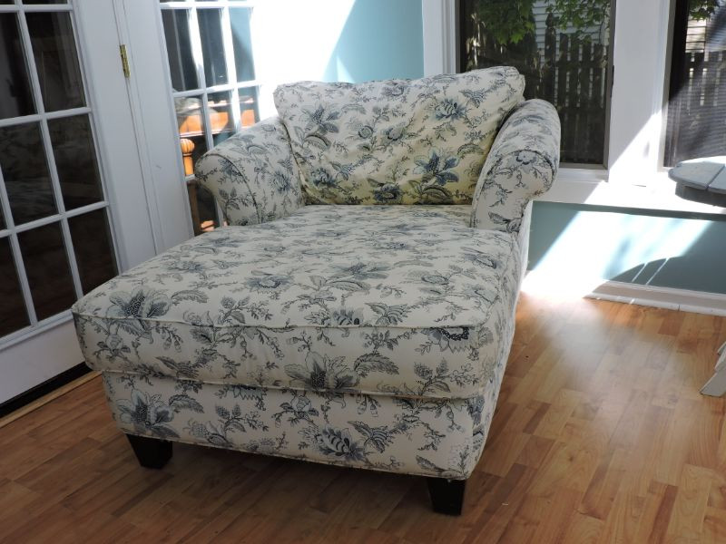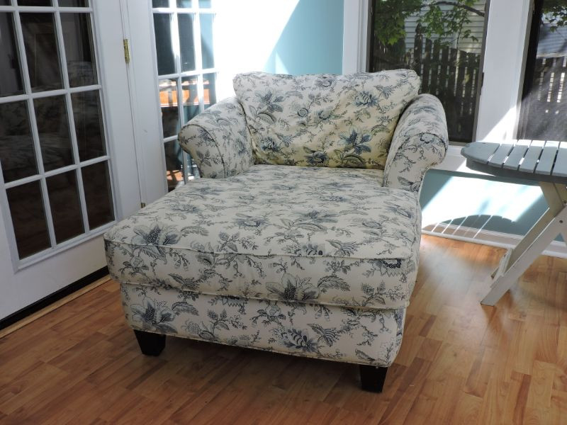 Beautiful 66"x 46"x 32" Jacobean floral lounge chair would look wonderful in your sunroom or bedroom. Cream background with pale blue and grey Jacobean floral motif. Needs a good cleaning, but so soft and comfy!