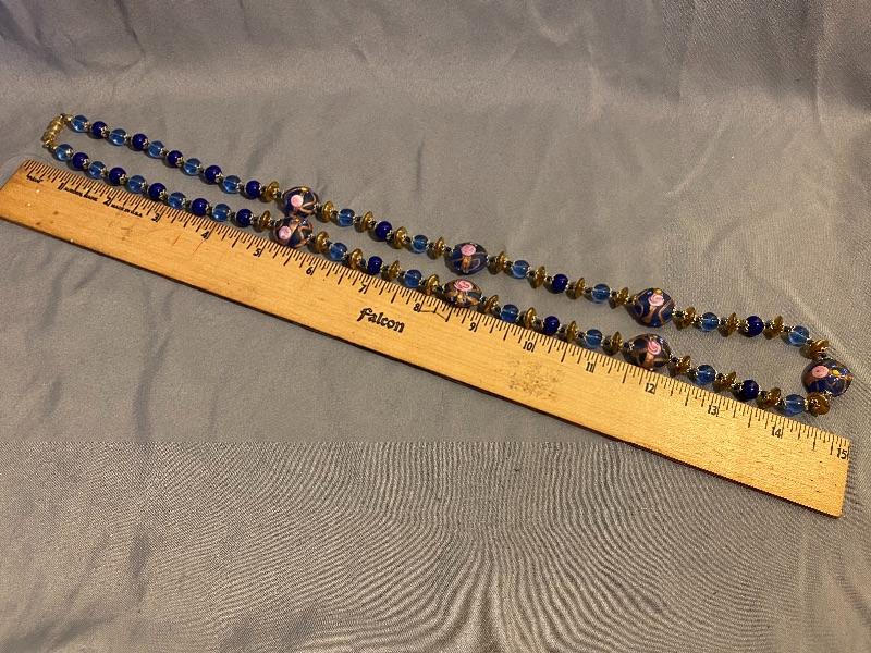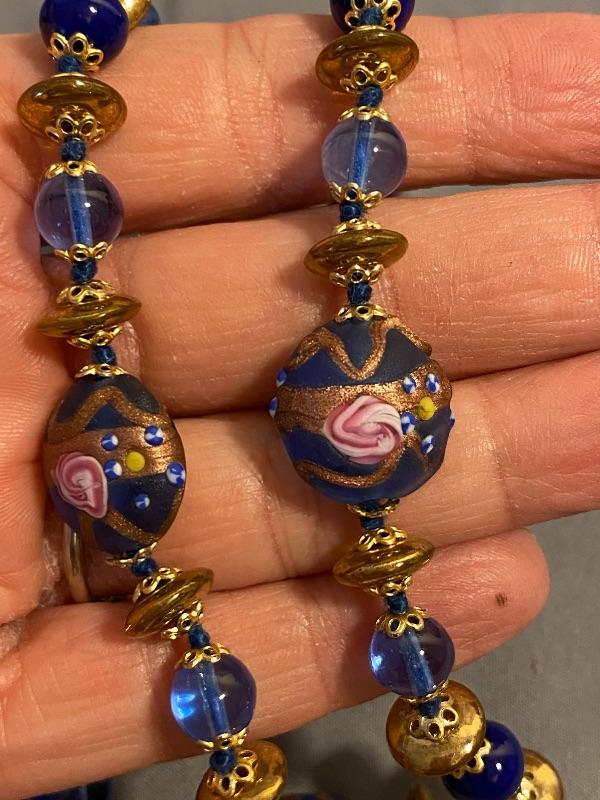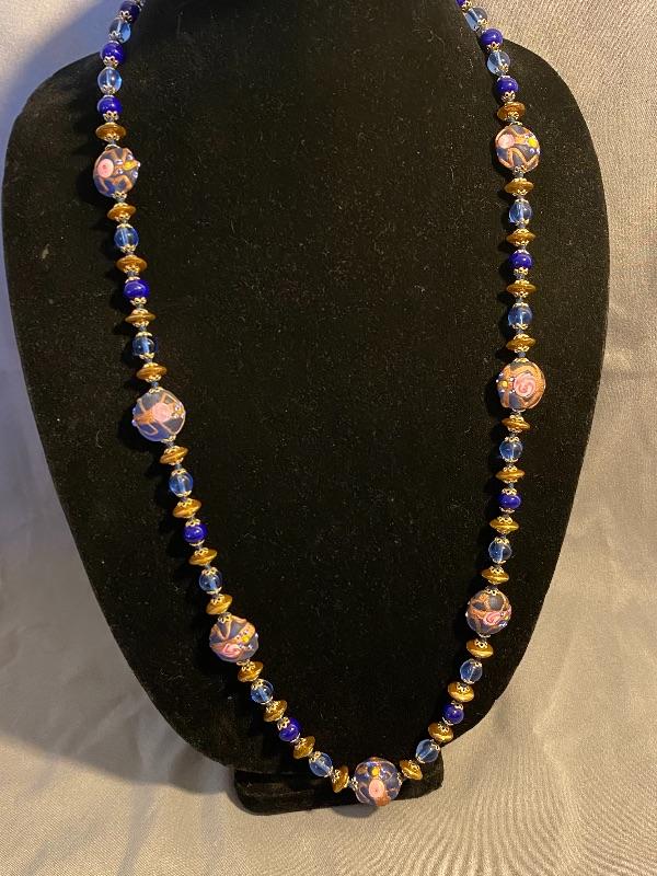 Blue and gold beaded necklace. Multishades of blue with oblong gold beads. Larger blue beads with pink flowers added. Screw together clasp. About 15" length.
