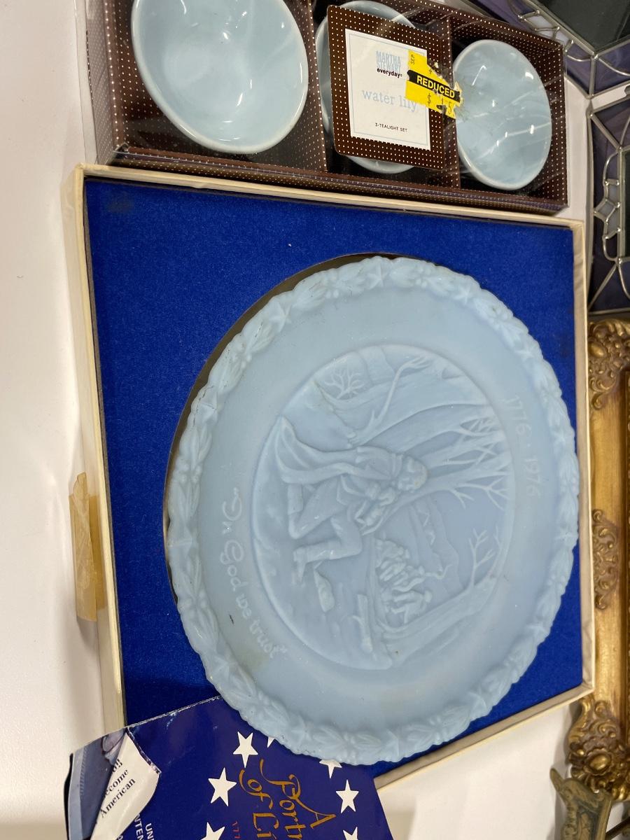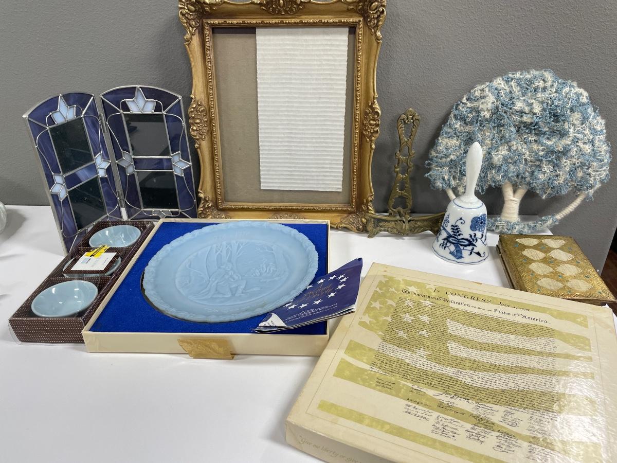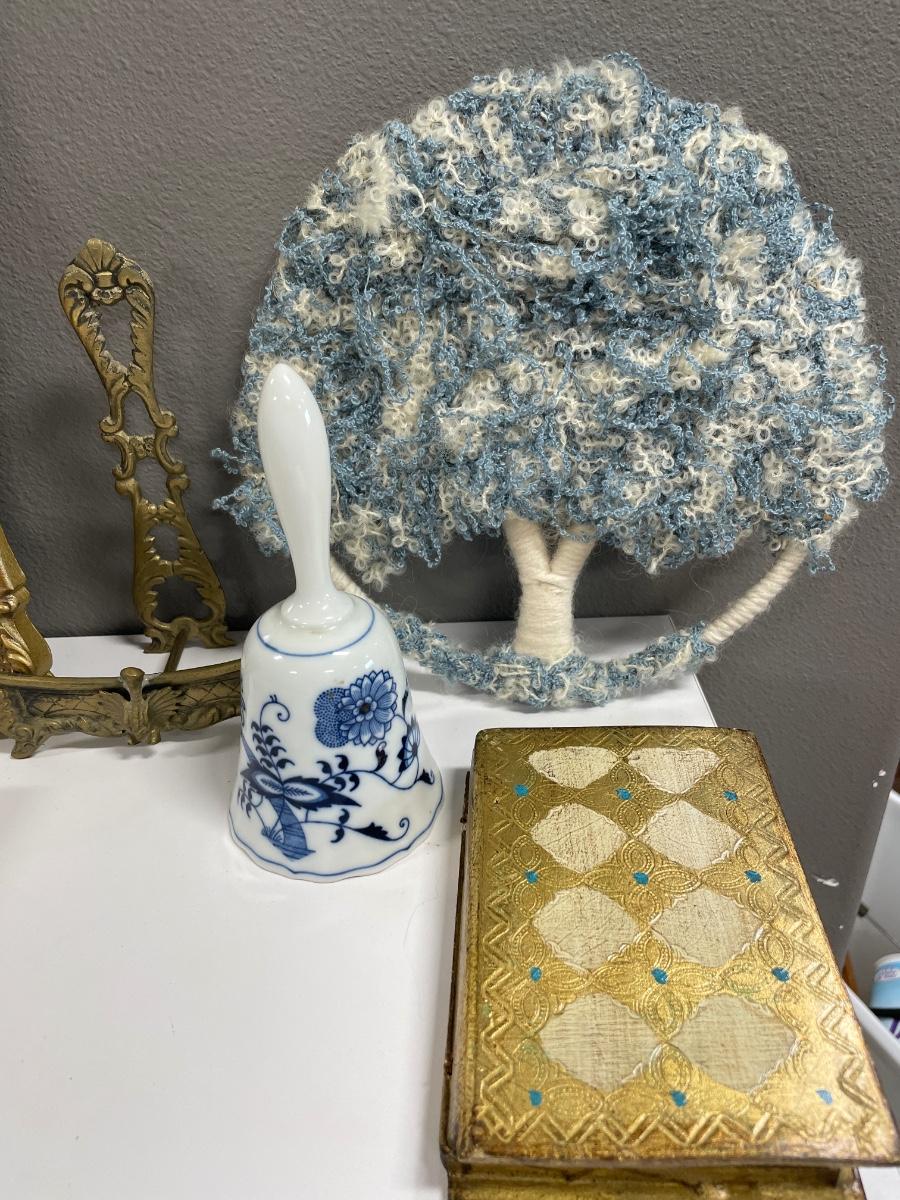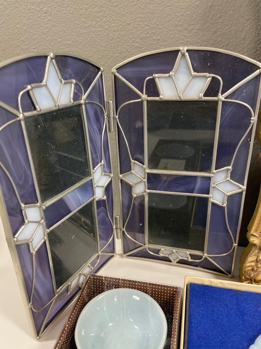 Stained glass, water lily cups, wood box, tree, bell, frame