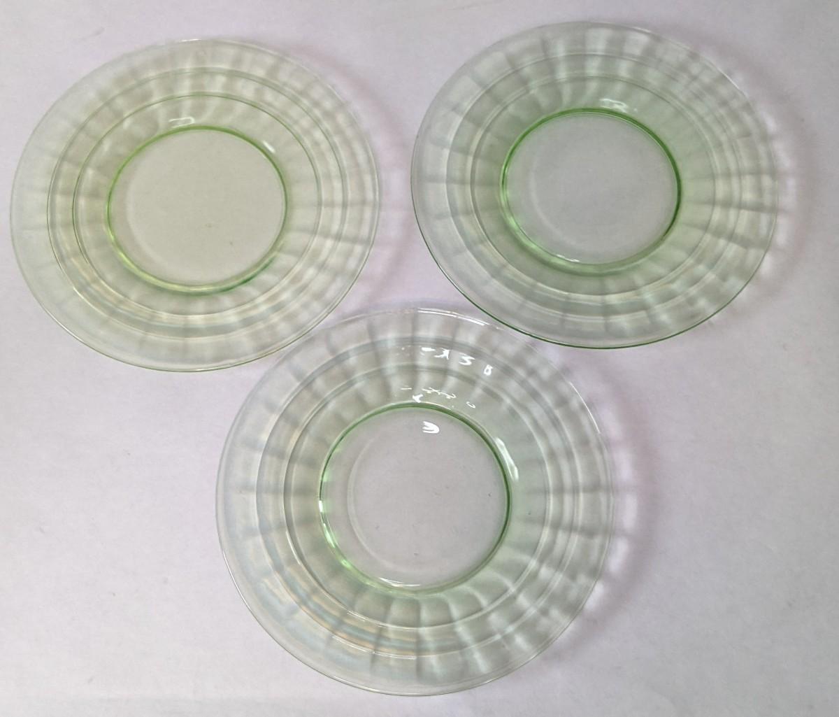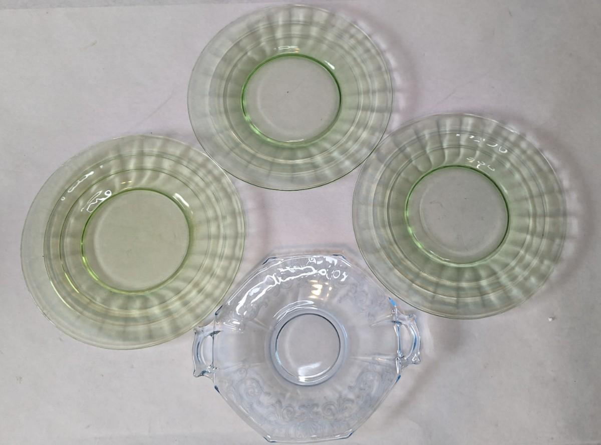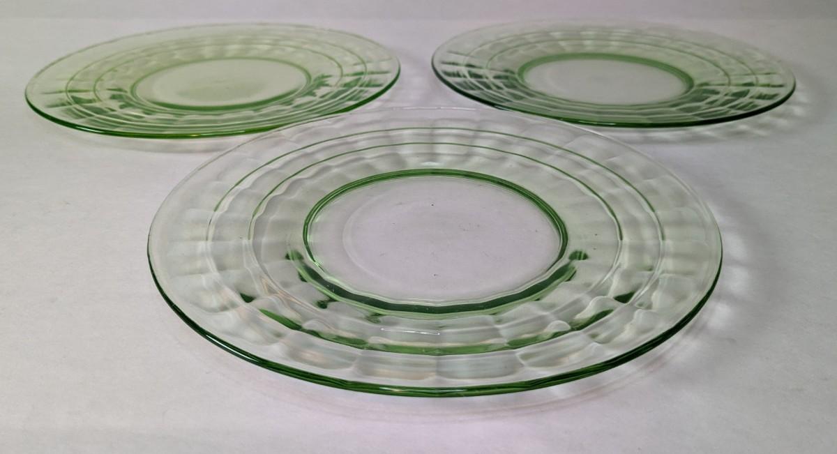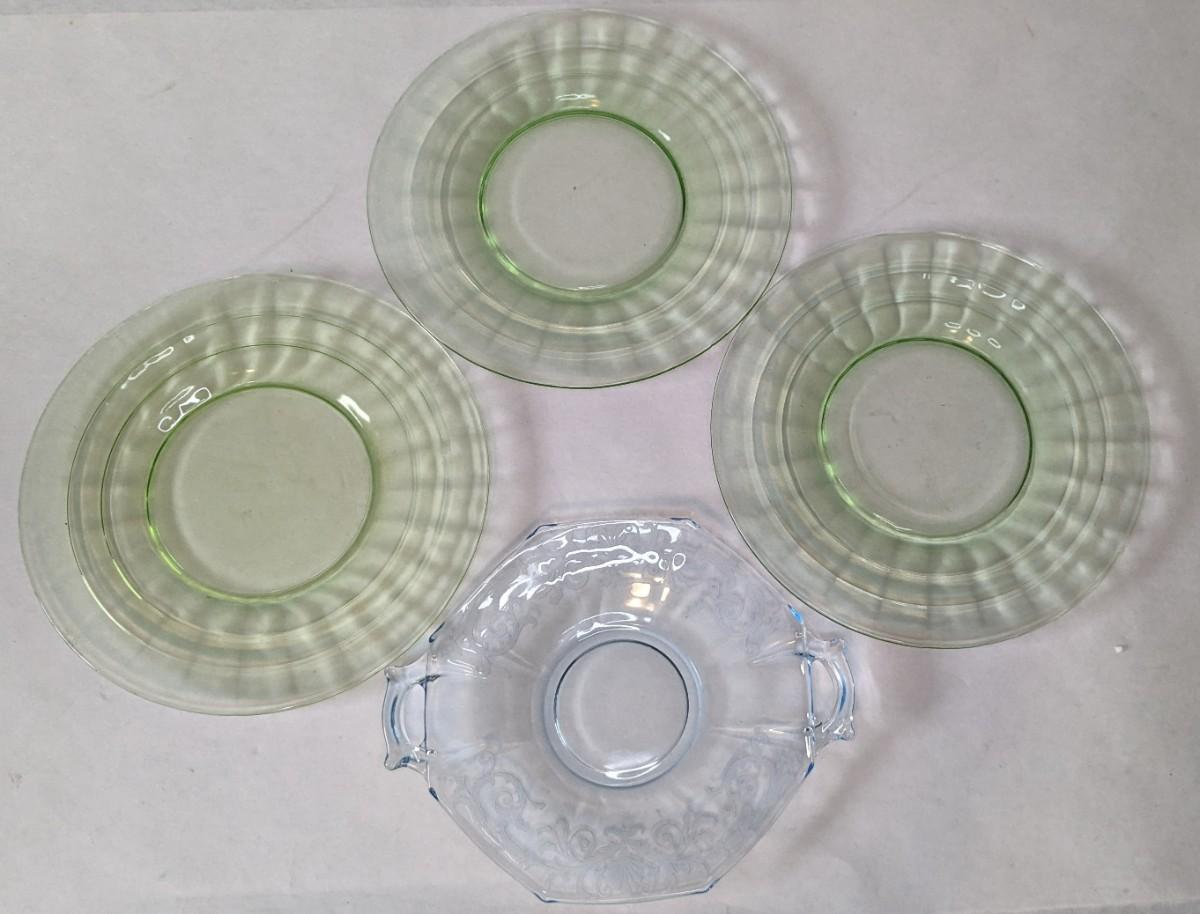 (3) Optic Green uranium glass 8.25" salad plates and 8" x 6 5/8" etched handle plate, presumed Fostoria. All pieces are in excellent condition and quite lovely!