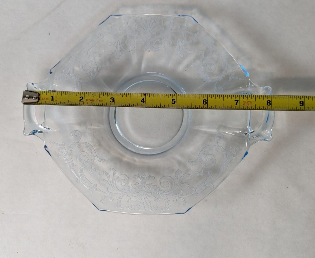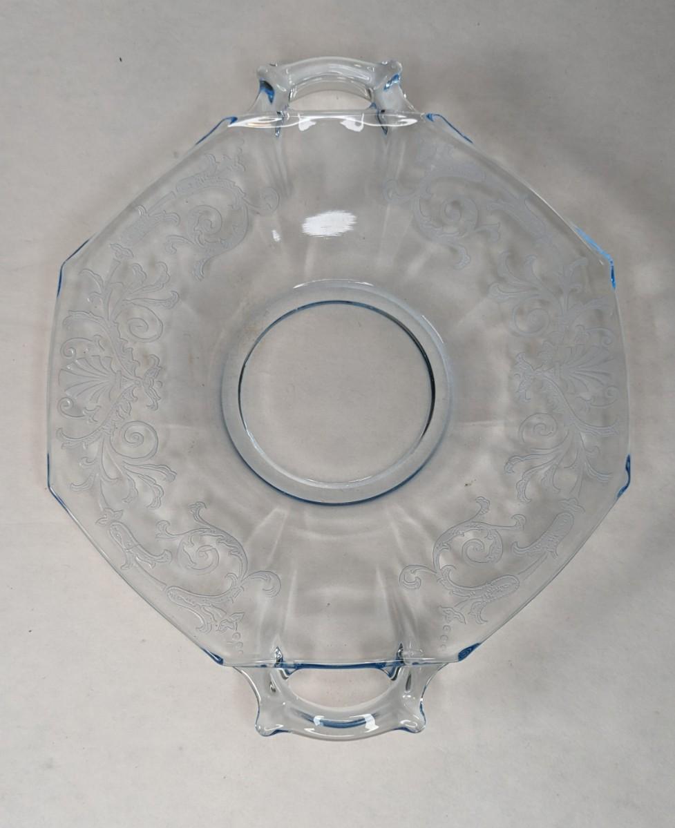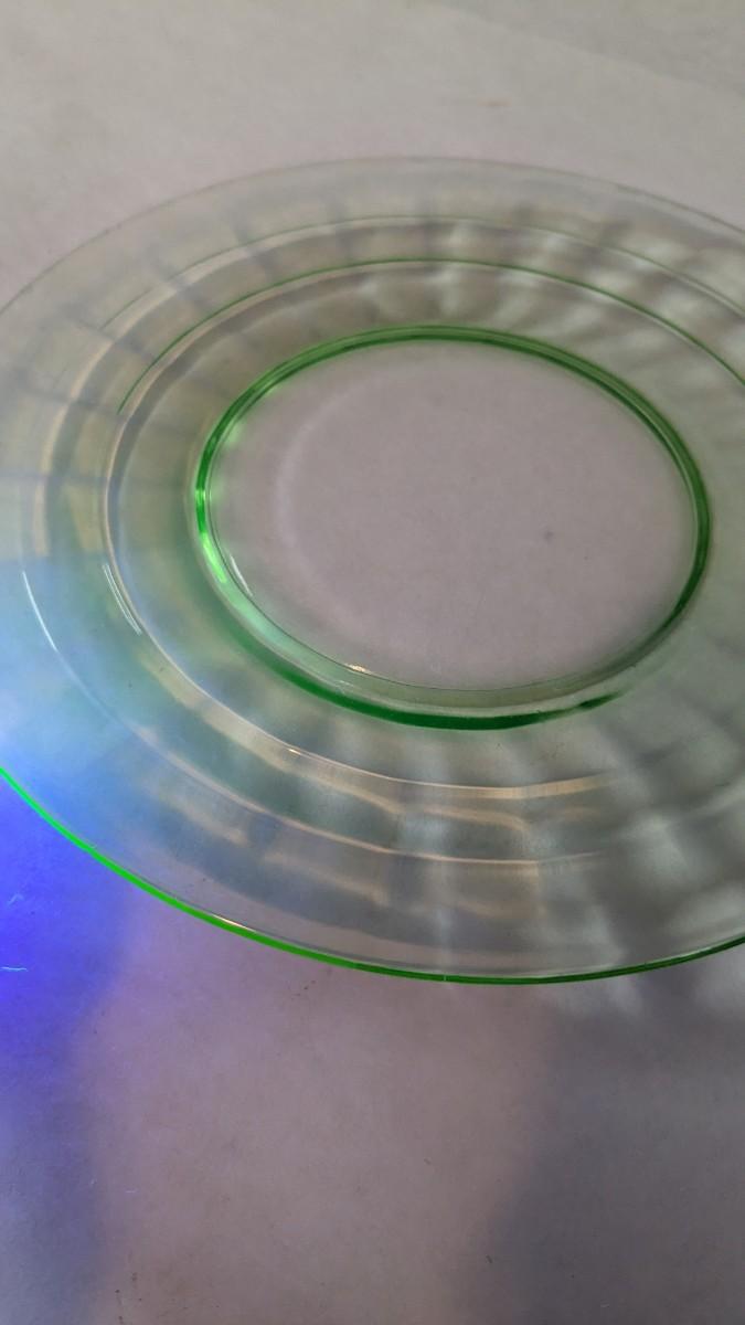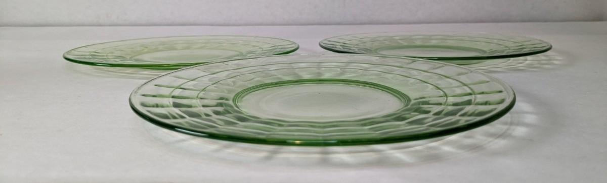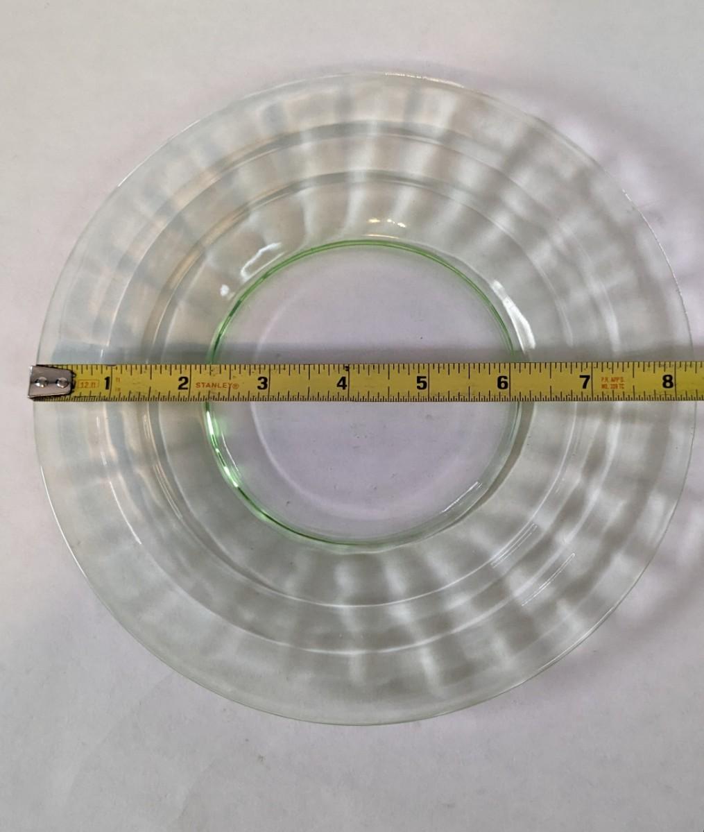 (3) Optic Green uranium glass 8.25" salad plates and 8" x 6 5/8" etched handle plate, presumed Fostoria. All pieces are in excellent condition and quite lovely!