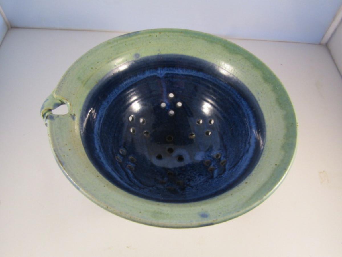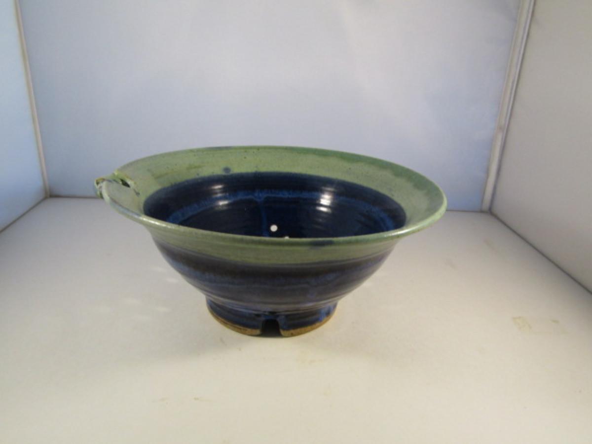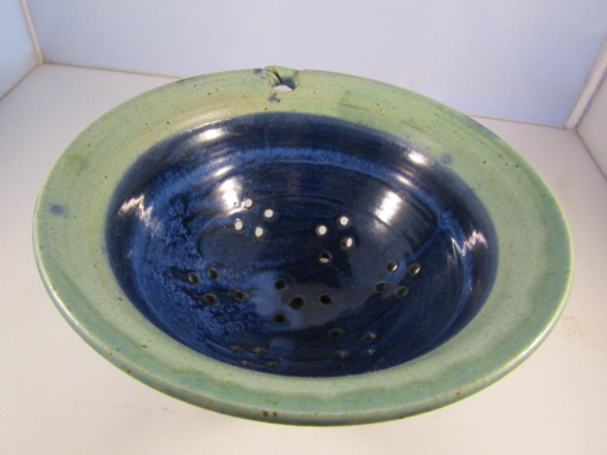 Blue and Green Hand Thrown Pottery Colander- Approx 10" in Diameter