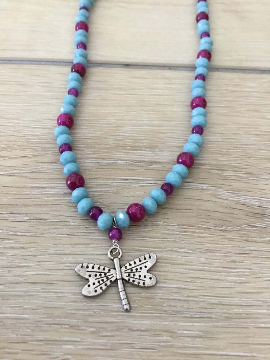 Blue and purple beaded dragonfly necklace