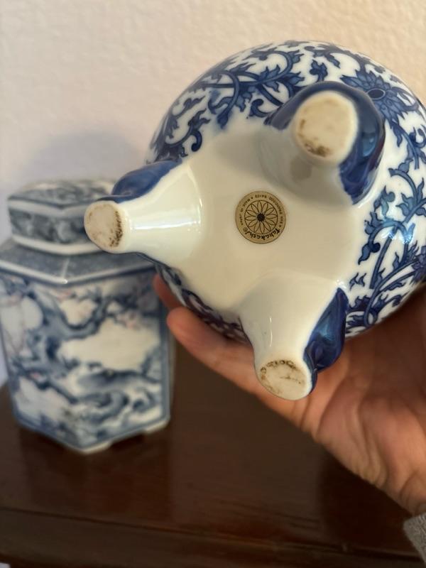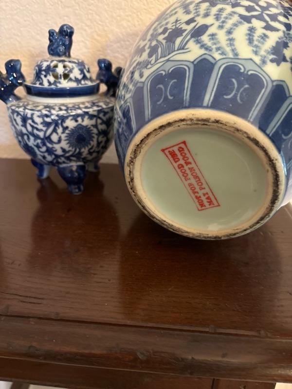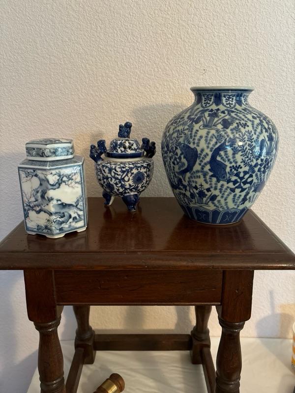Lot 52 - Blue and White Asian Porcelain Ginger Jar, Cherry Blossom Hexagon Jar, and 9" Vase with Koi
