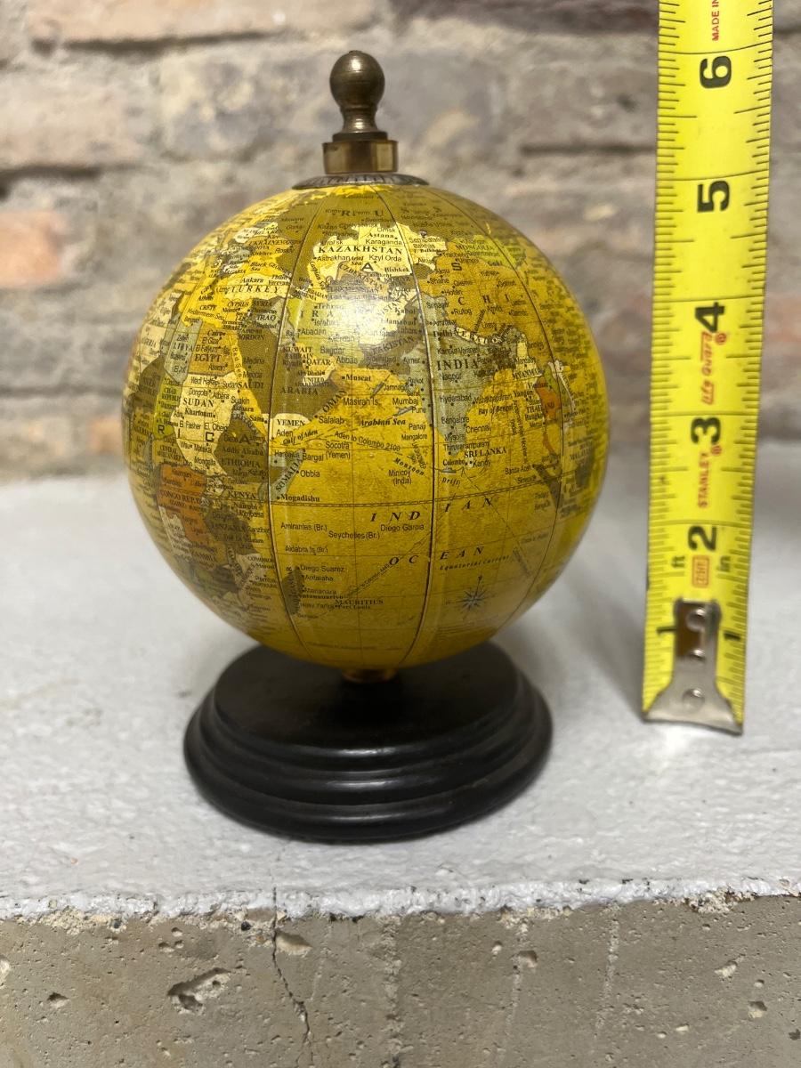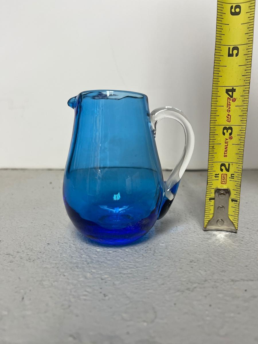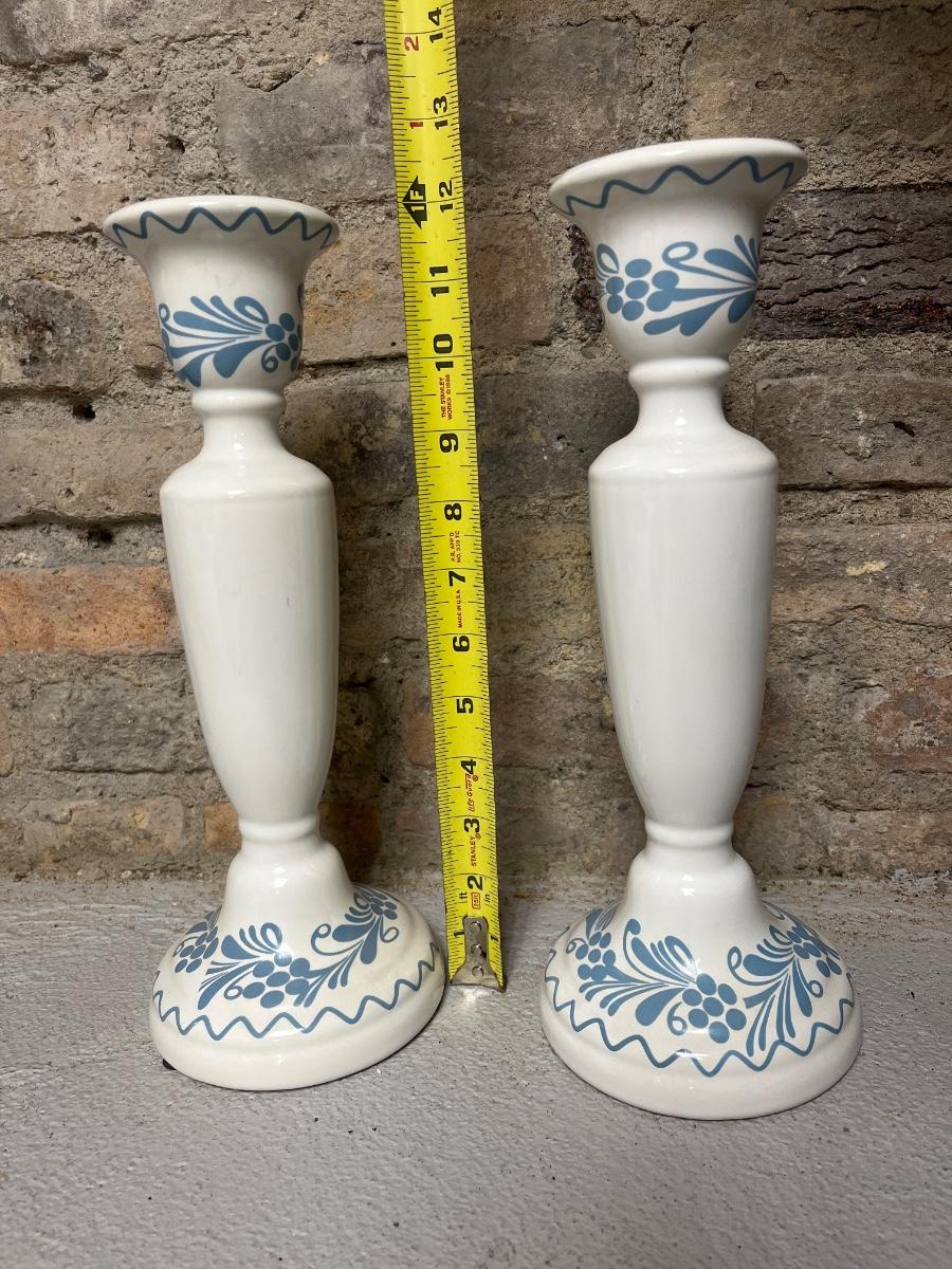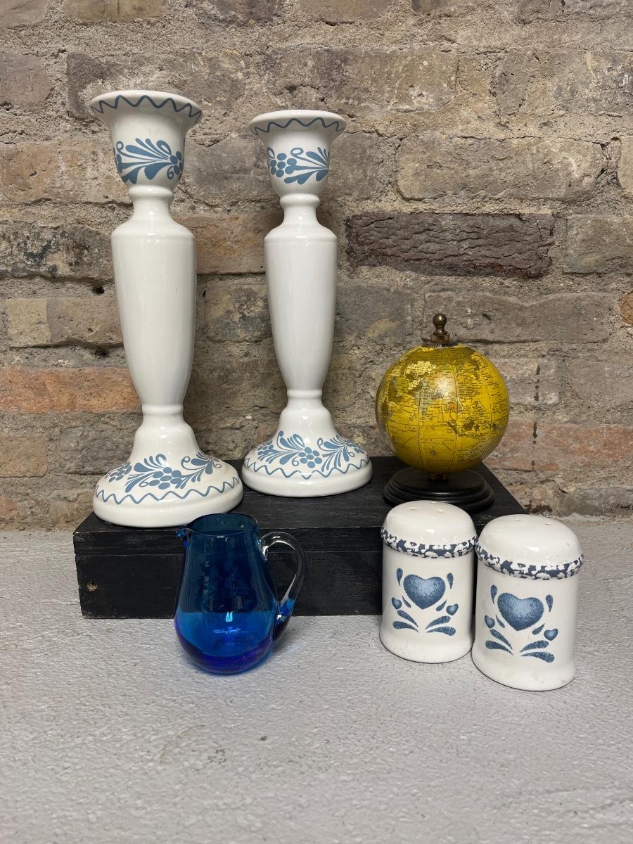 Pair of blue and white candlesticks, small vintage globe, set of salt and pepper shakers and small blue glass pitcher (Pilgrim?)
