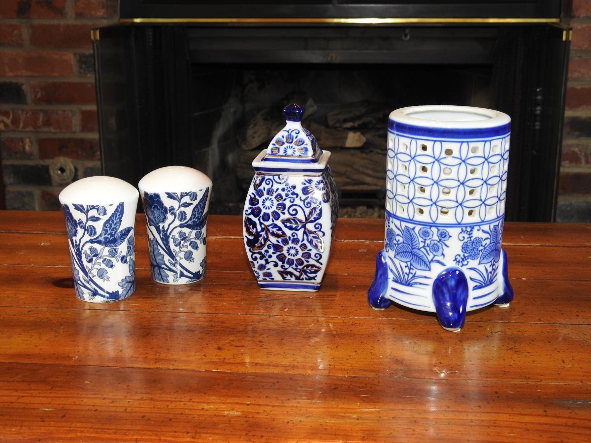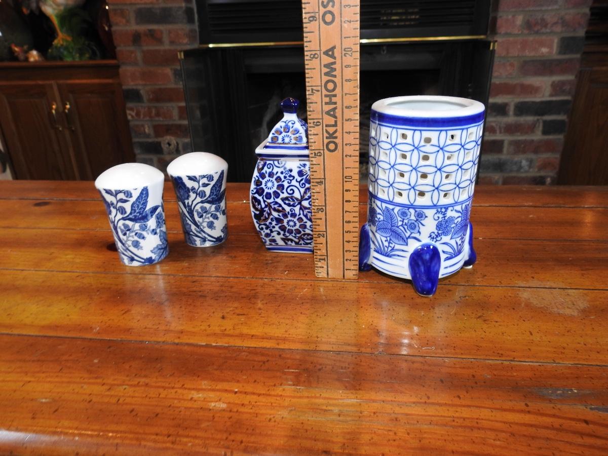 Salt and pepper shakers, ginger jar, and vase. Trio Of blue and white beauties for your enjoyment. Good used condition.