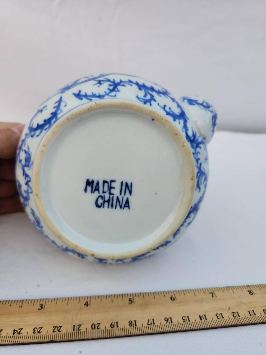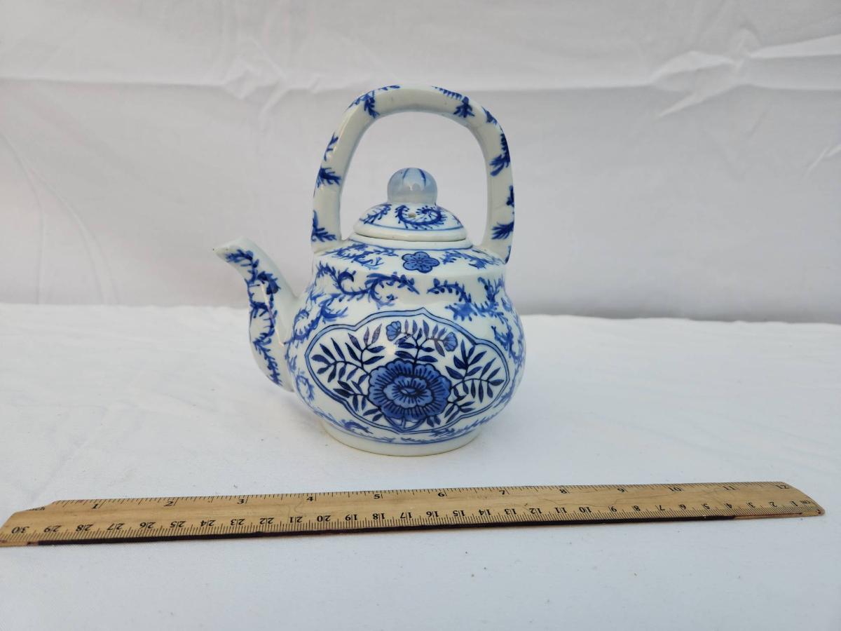 A ceramic teapot featuring a blue and white floral design and a handle at the top. The bottom is marked 'Made in China.' The teapot has a removable lid and appears to be medium in size with measurements evident against the included ruler.