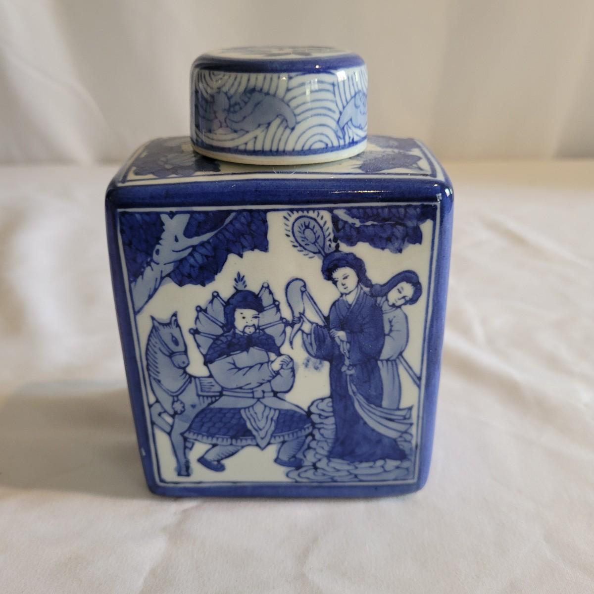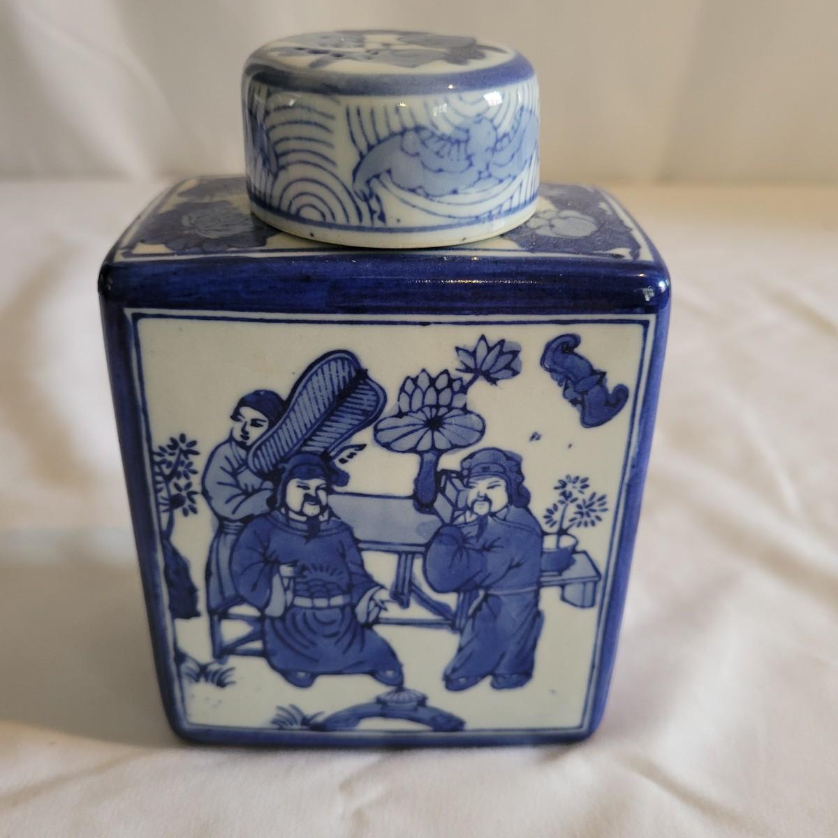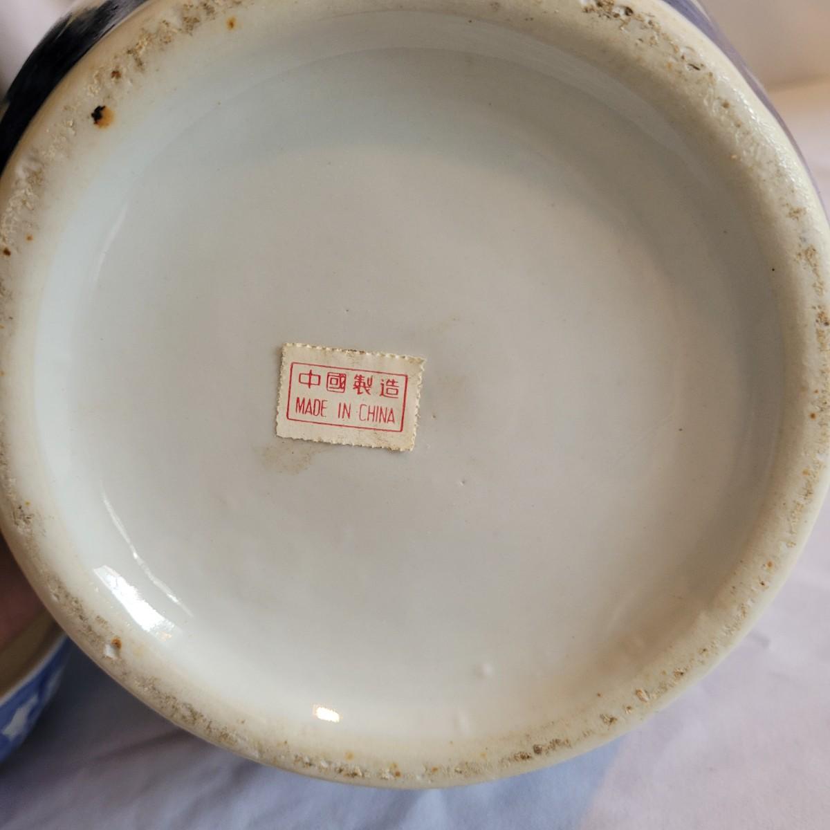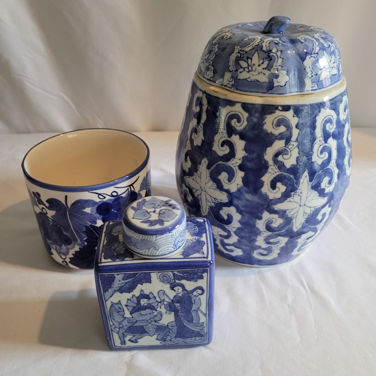 This auction is for three pieces of Chinese style porcelain pieces. The first and largest piece is a gourd shaped ginger jar. It features a removable lid with stem and exhibits floral patterns. The second piece is a tea caddy. It also features a removable lid and depicts images of old world Chinese men and women. The third piece is a decorative bowl featuring images of grapes and leaves. The largest piece measures 7" x 7" x 10"H.