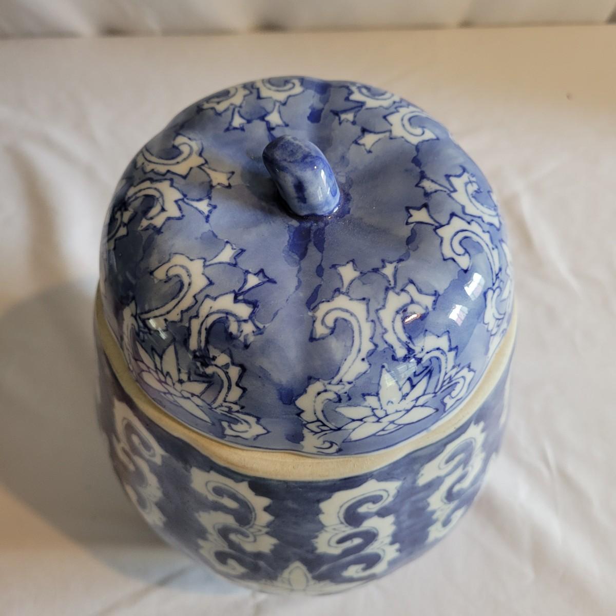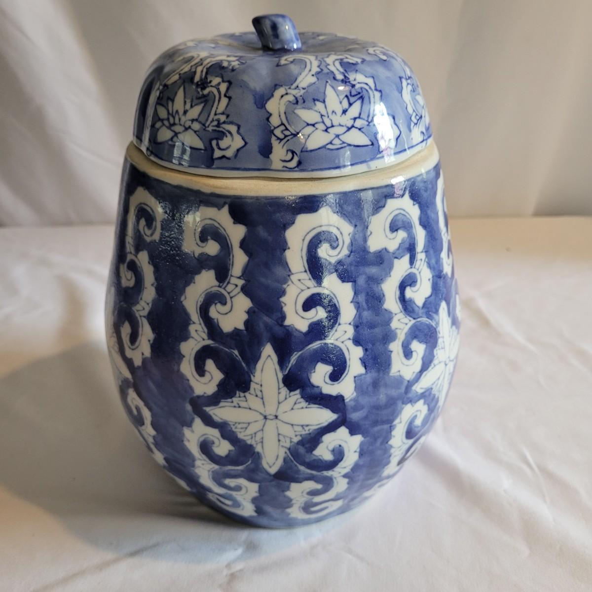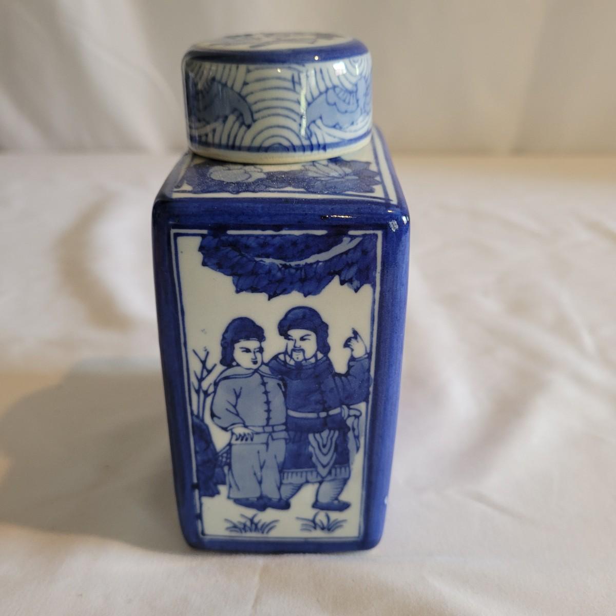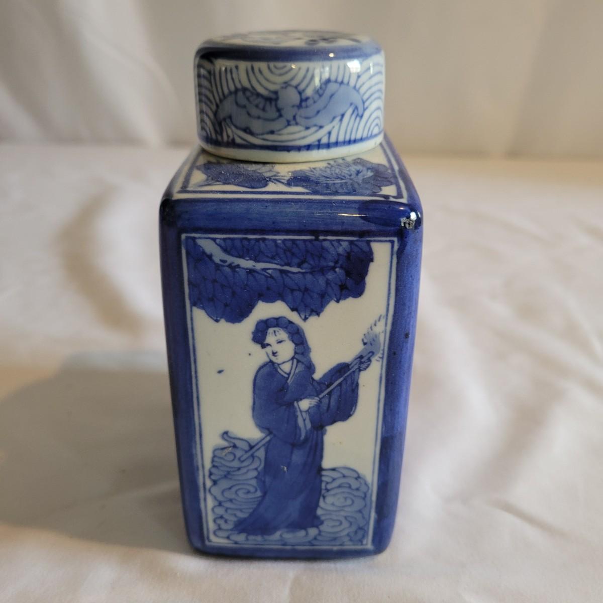 This auction is for three pieces of Chinese style porcelain pieces. The first and largest piece is a gourd shaped ginger jar. It features a removable lid with stem and exhibits floral patterns. The second piece is a tea caddy. It also features a removable lid and depicts images of old world Chinese men and women. The third piece is a decorative bowl featuring images of grapes and leaves. The largest piece measures 7" x 7" x 10"H.