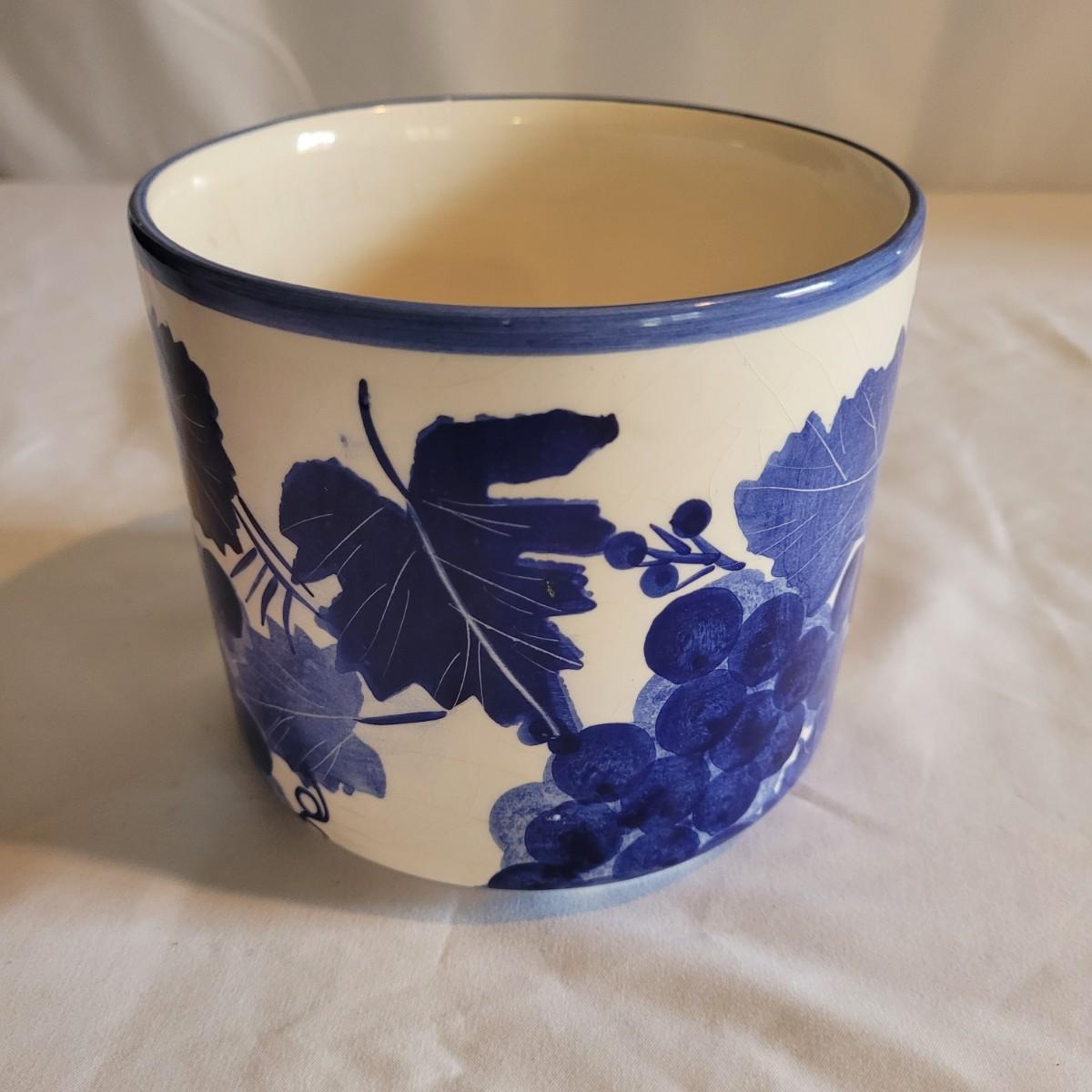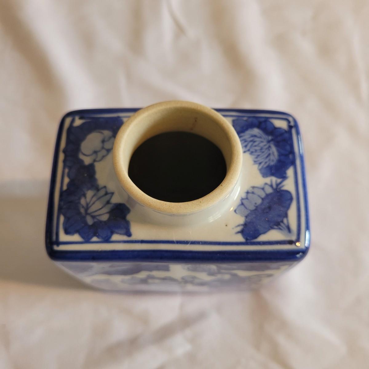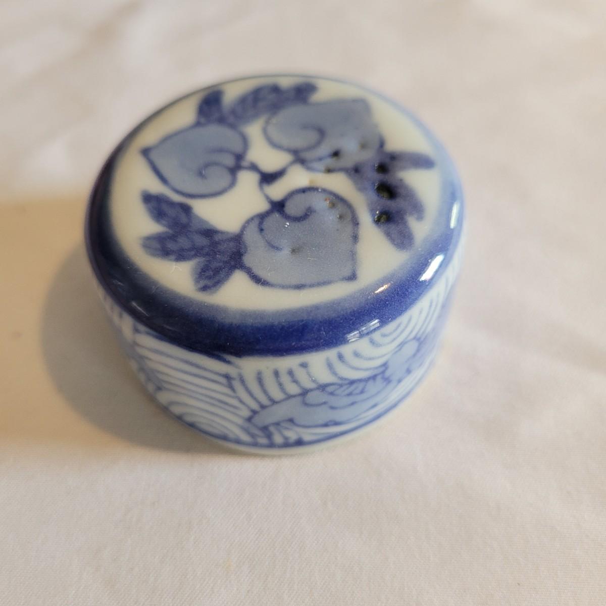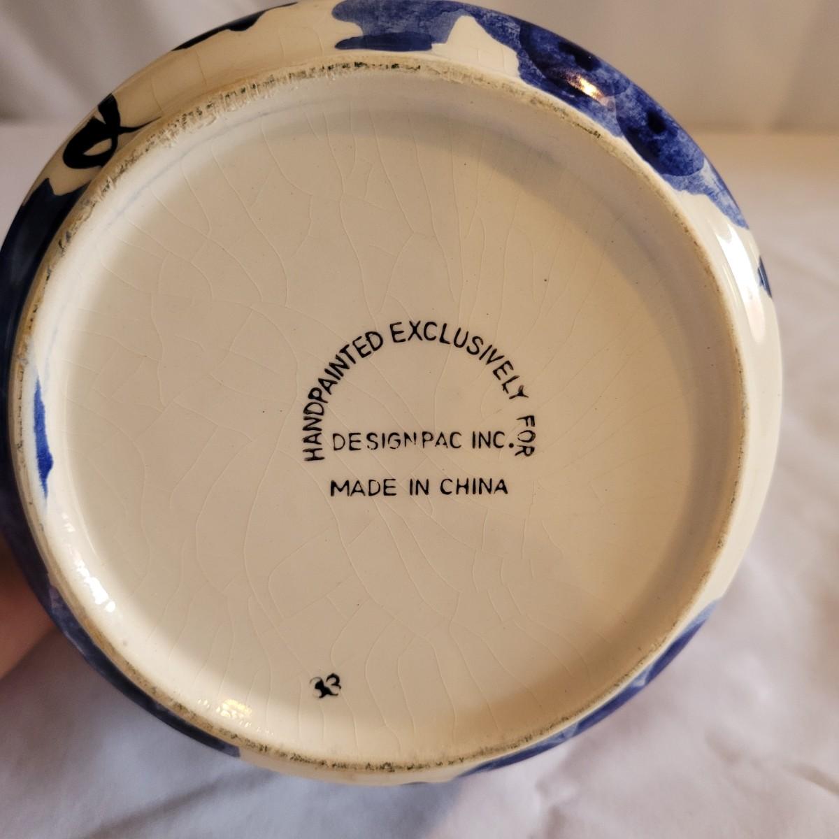 This auction is for three pieces of Chinese style porcelain pieces. The first and largest piece is a gourd shaped ginger jar. It features a removable lid with stem and exhibits floral patterns. The second piece is a tea caddy. It also features a removable lid and depicts images of old world Chinese men and women. The third piece is a decorative bowl featuring images of grapes and leaves. The largest piece measures 7" x 7" x 10"H.