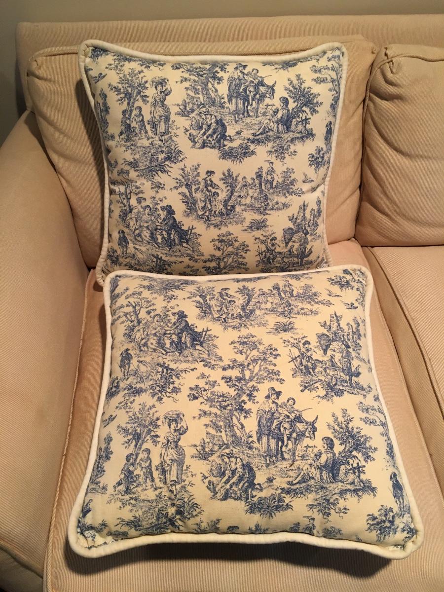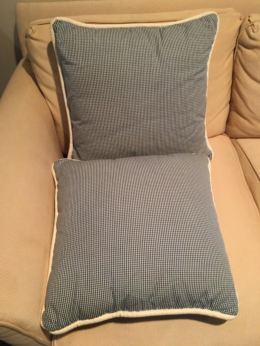 Pair of corded trim pillows with contrastingfabric back