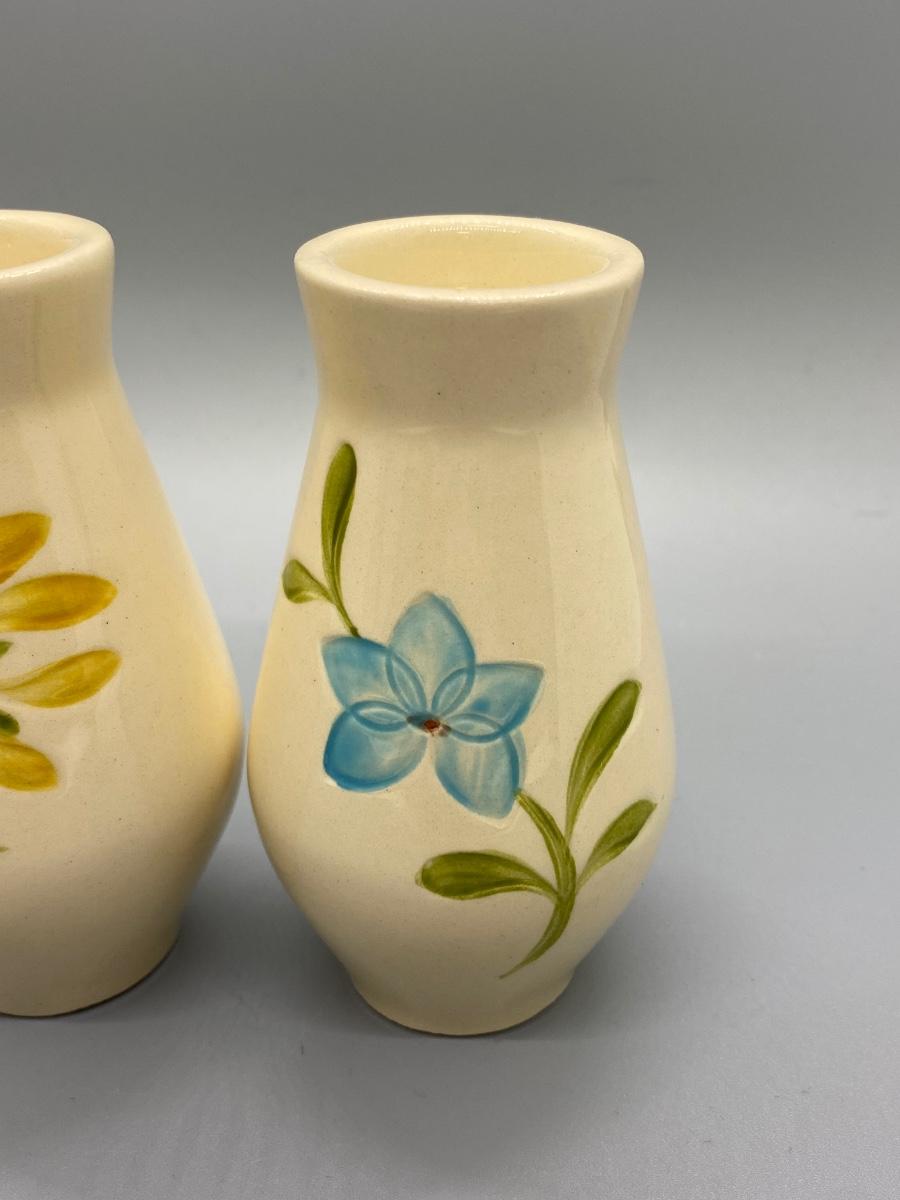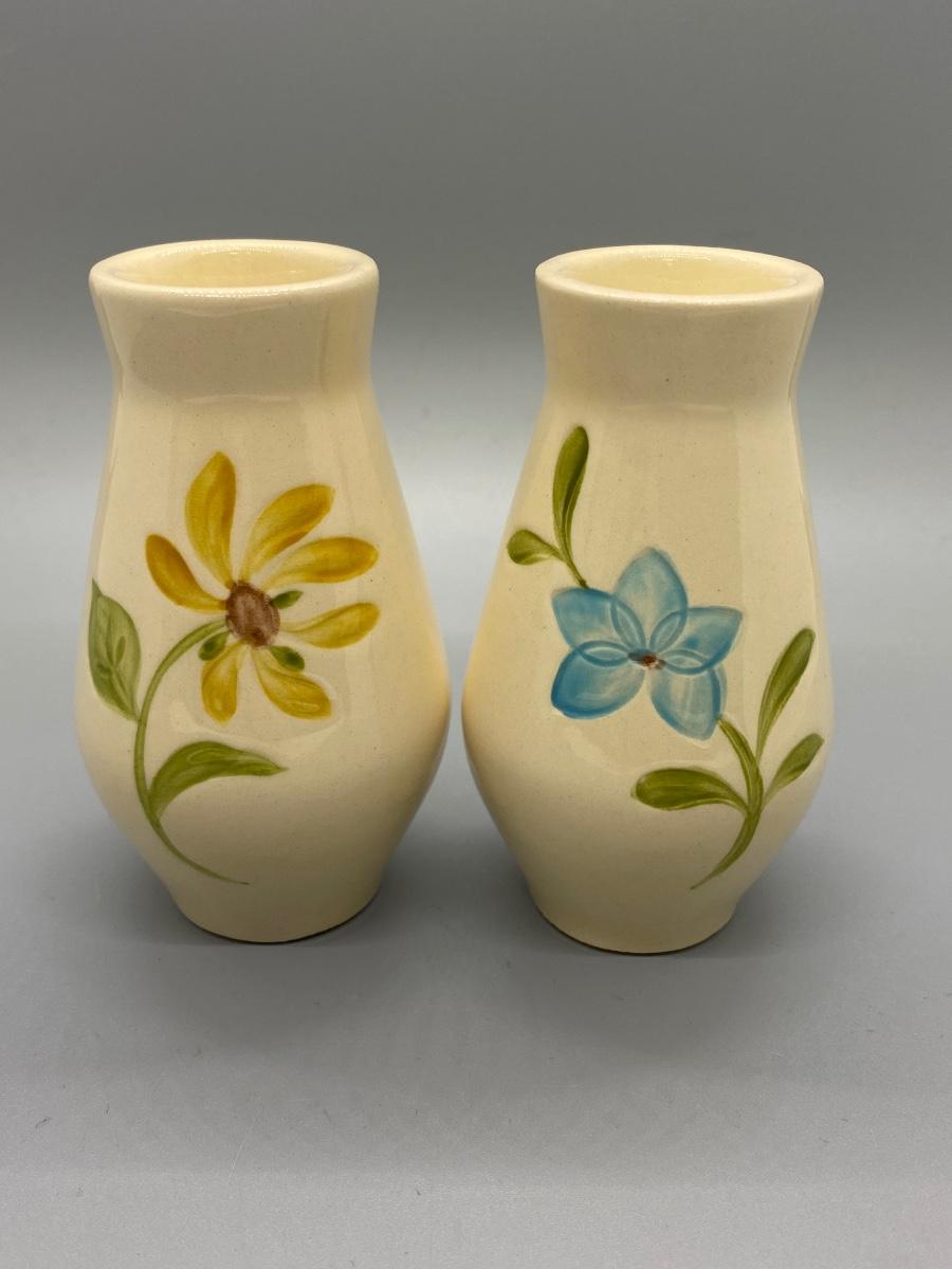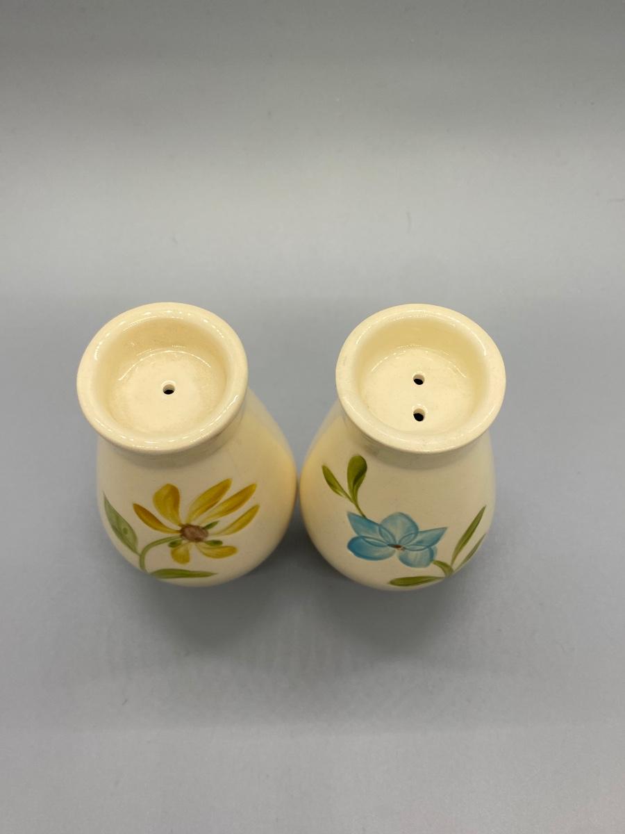 Floral ceramic salt & pepper shaker set. Unbranded. Flowers are imprinted in the ceramic, one painted yellow, one painted blue. In good condition.
