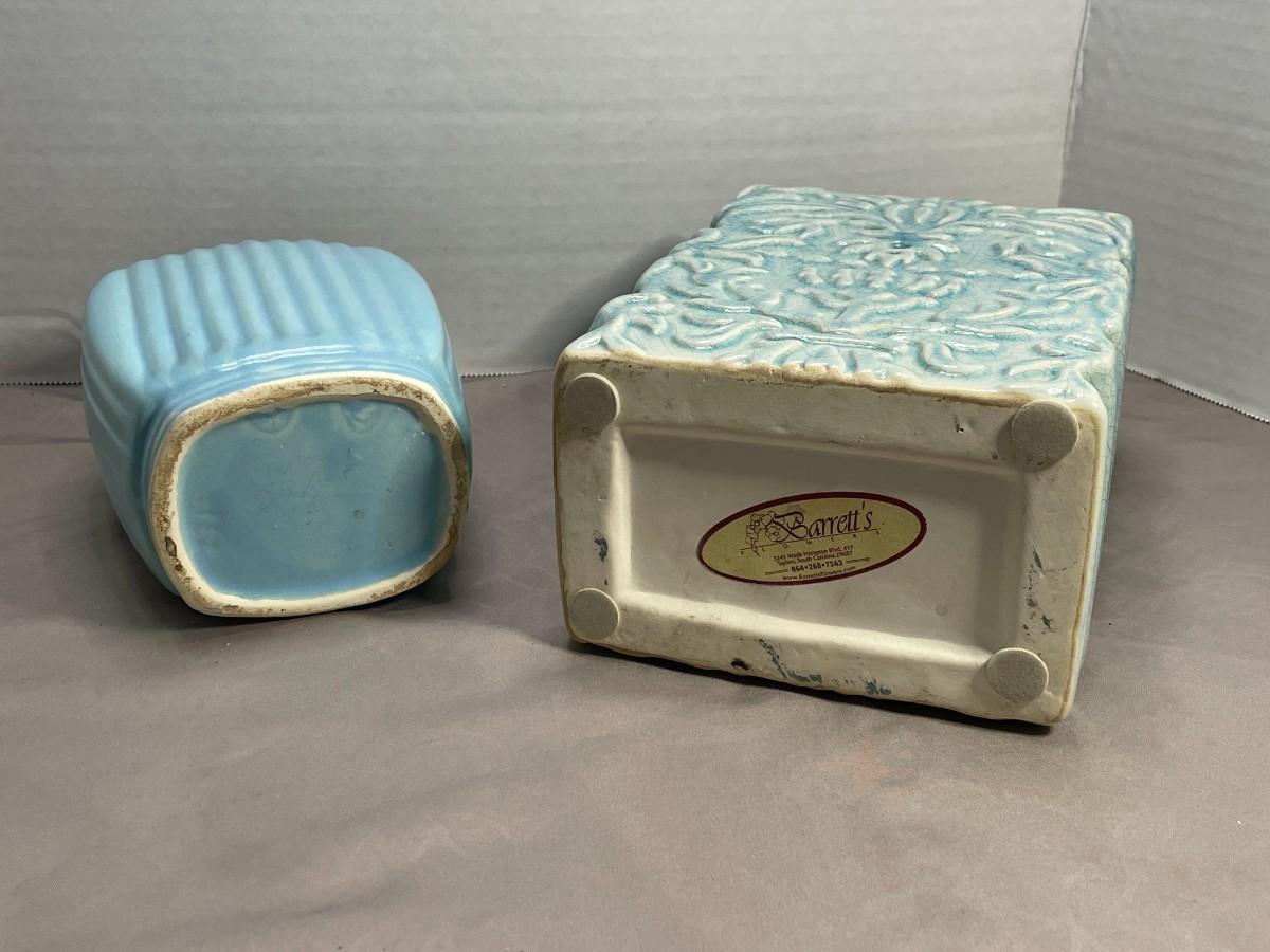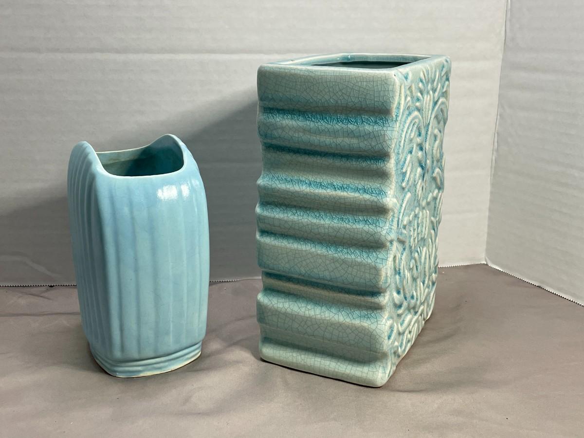 The ribbed vase does not have any identifying marks, but it is a USA Pottery type of quality and style. The taller piece is identified only as Barrett's Floral. Both are in excellent condition and measure about 6 inches and 8 inches respectively.