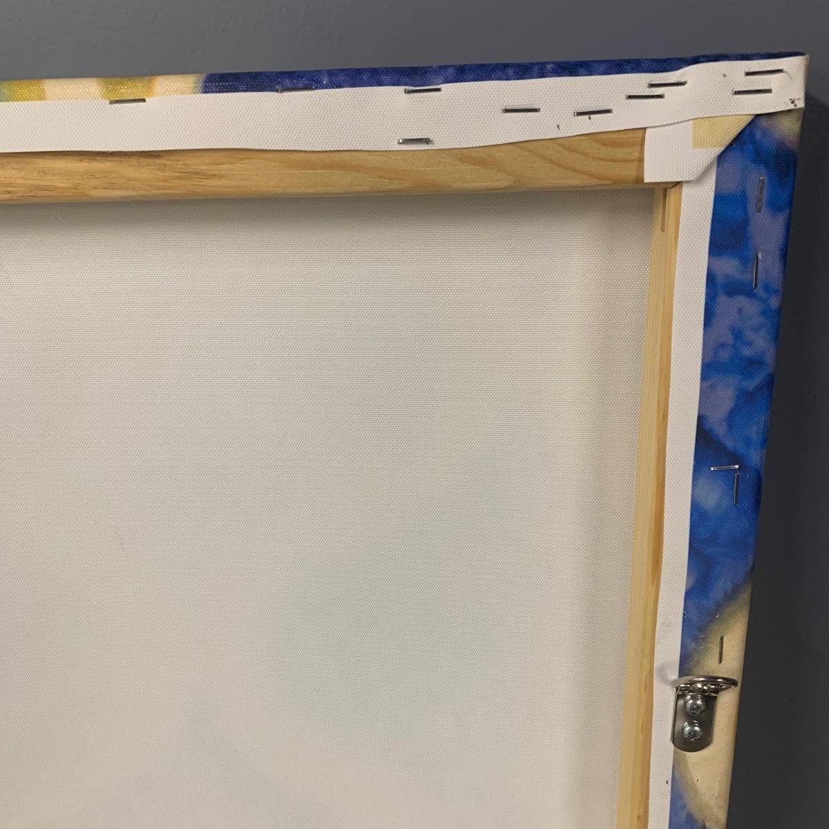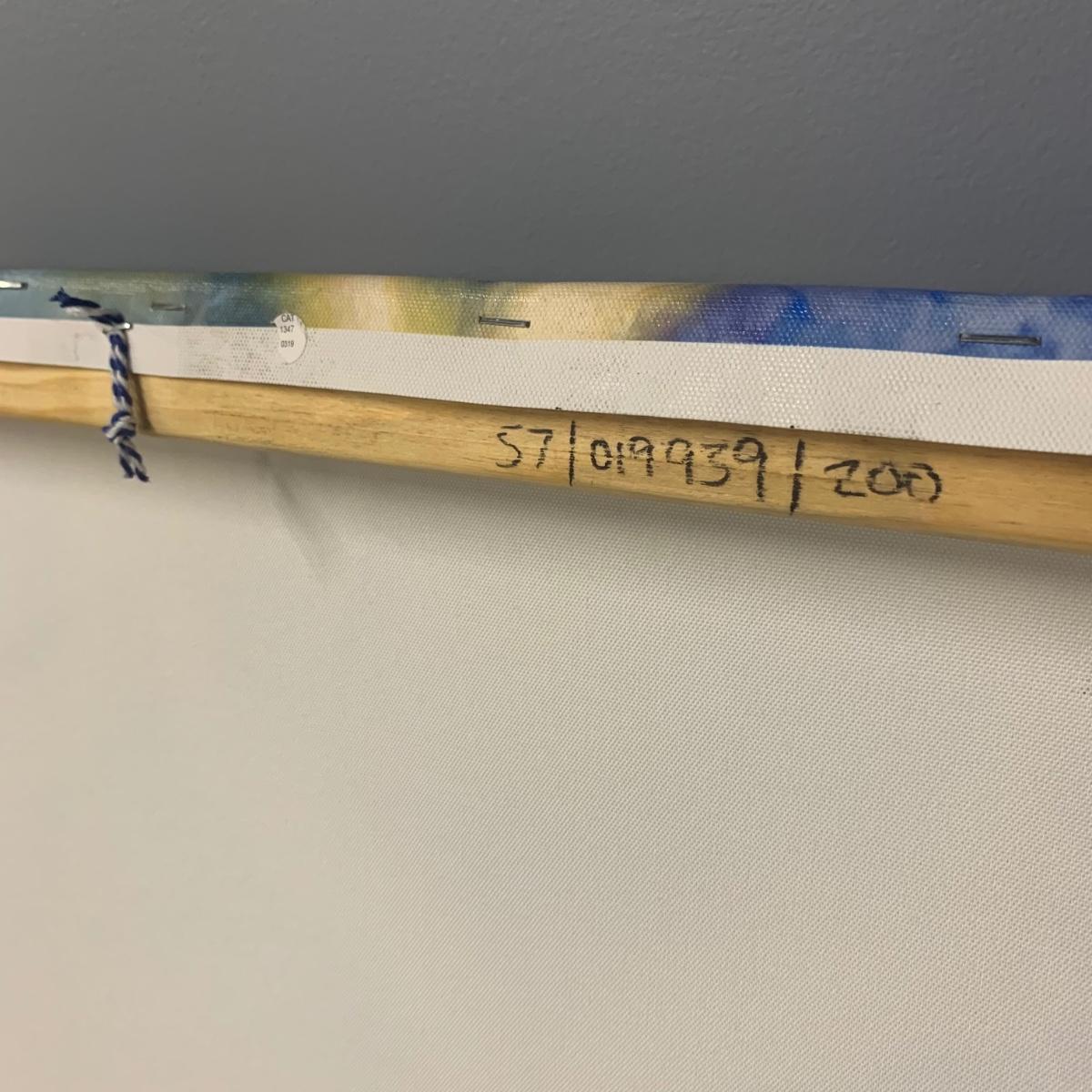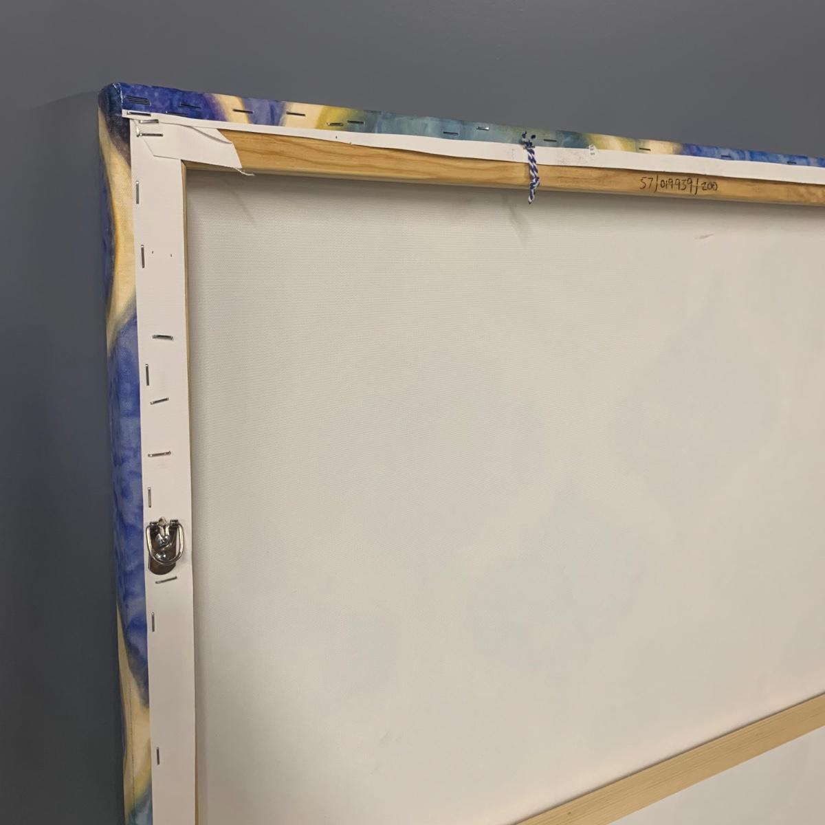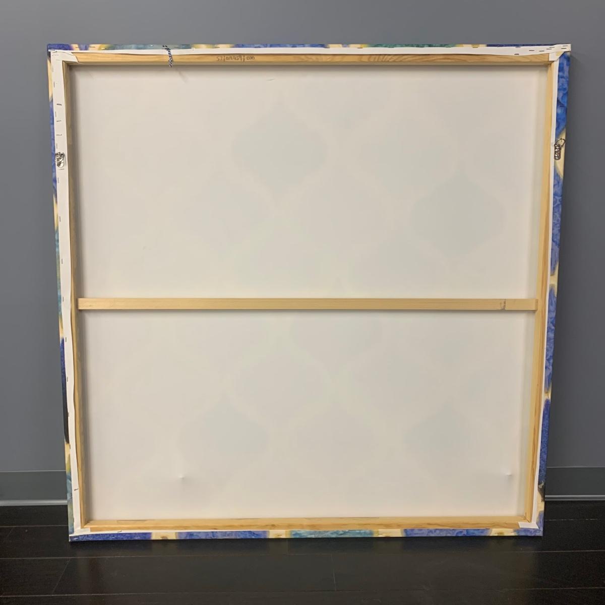 This large wall-hanging art piece measures 48” x 48” x 1.5". It is a print and has a plastic feel to the canvas. The art is attached to a wooden frame that has two sturdy metal hooks for hanging on the wall. There is one small blemish on the top edge of the print that appears to be paper stuck to the surface, which likely will be easy to remove. Shipping Available. Shipping Art can be costly please call UPS store at 828-252-6930 for quote.