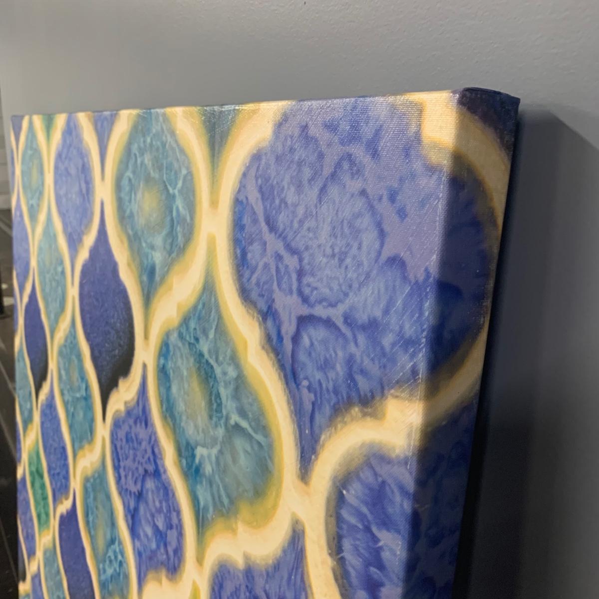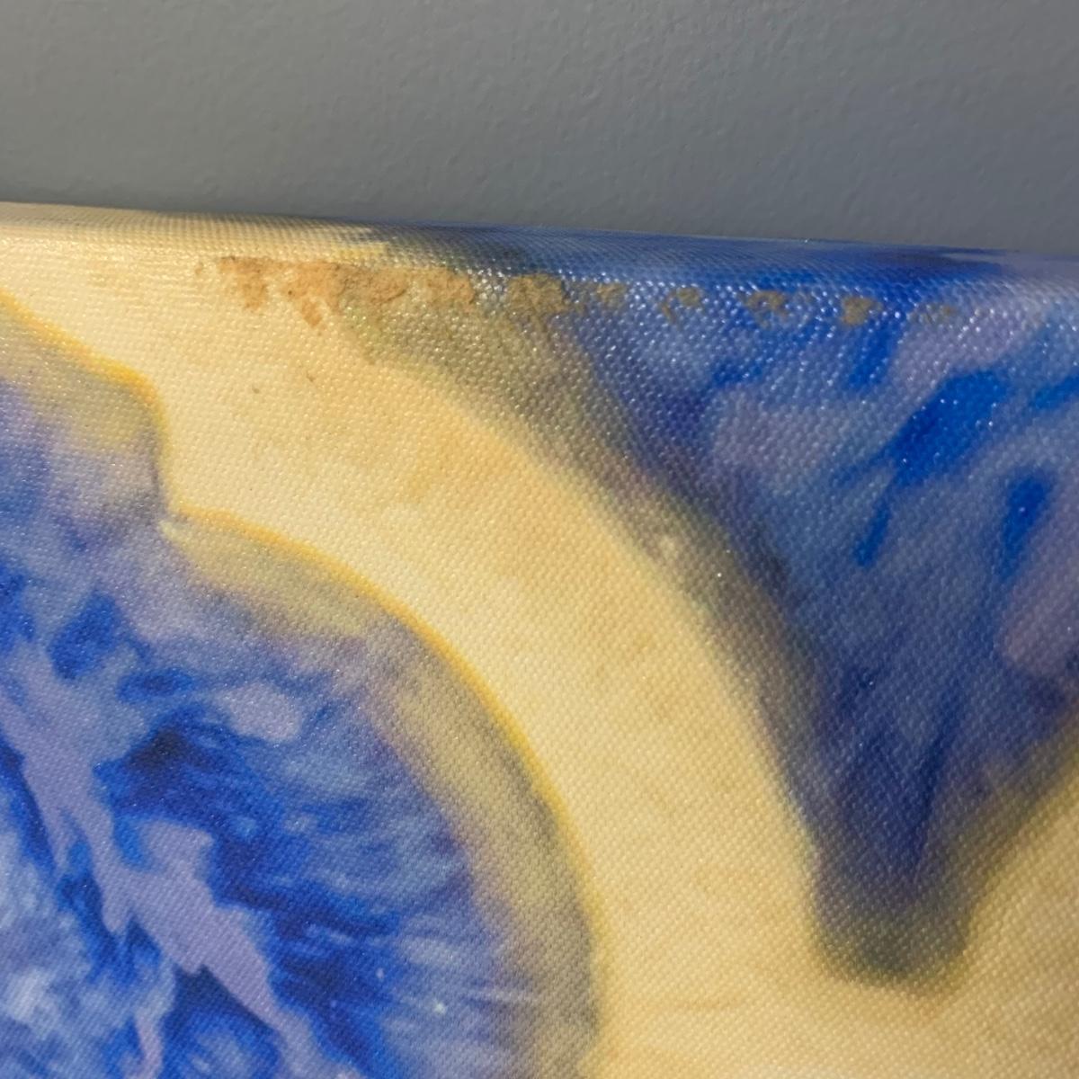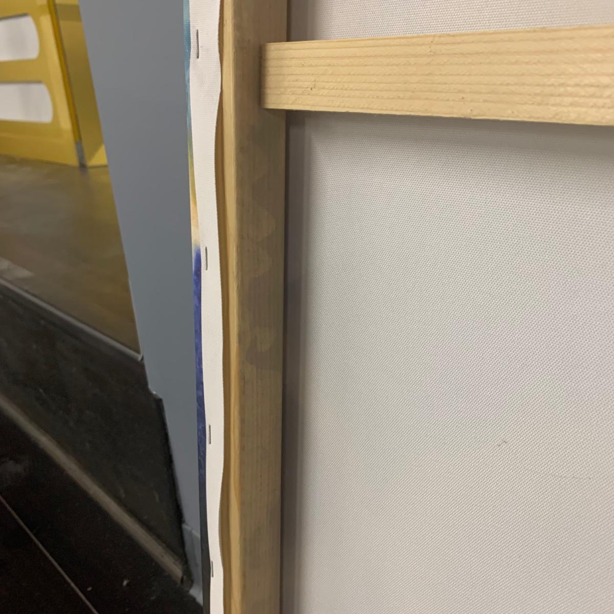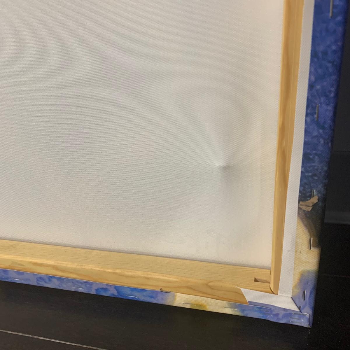 This large wall-hanging art piece measures 48” x 48” x 1.5". It is a print and has a plastic feel to the canvas. The art is attached to a wooden frame that has two sturdy metal hooks for hanging on the wall. There is one small blemish on the top edge of the print that appears to be paper stuck to the surface, which likely will be easy to remove. Shipping Available. Shipping Art can be costly please call UPS store at 828-252-6930 for quote.