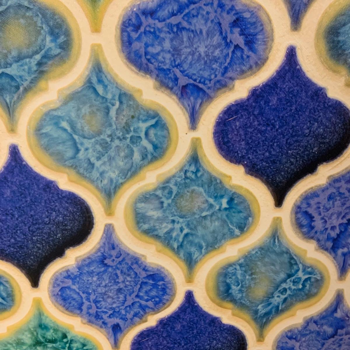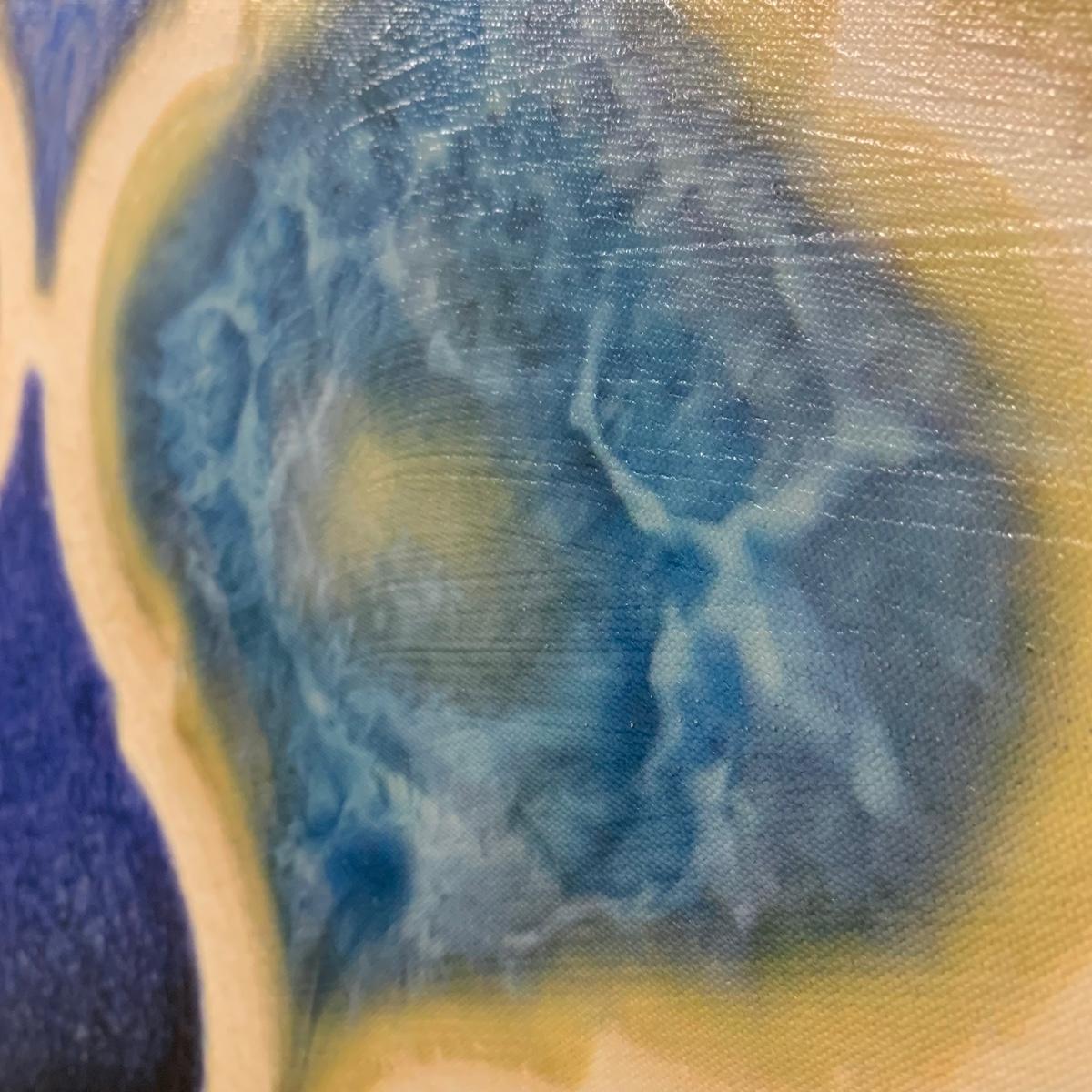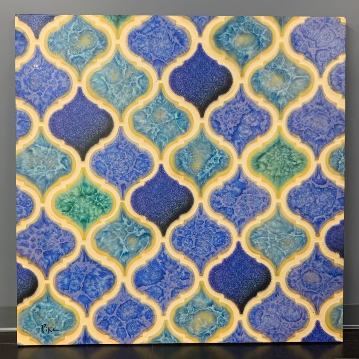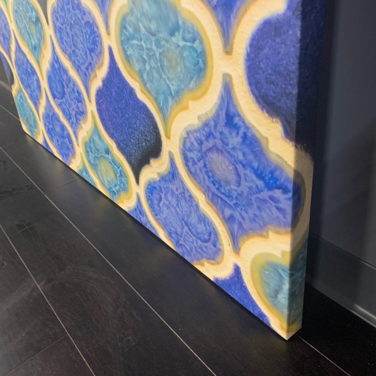 This large wall-hanging art piece measures 48” x 48” x 1.5". It is a print and has a plastic feel to the canvas. The art is attached to a wooden frame that has two sturdy metal hooks for hanging on the wall. There is one small blemish on the top edge of the print that appears to be paper stuck to the surface, which likely will be easy to remove. Shipping Available. Shipping Art can be costly please call UPS store at 828-252-6930 for quote.