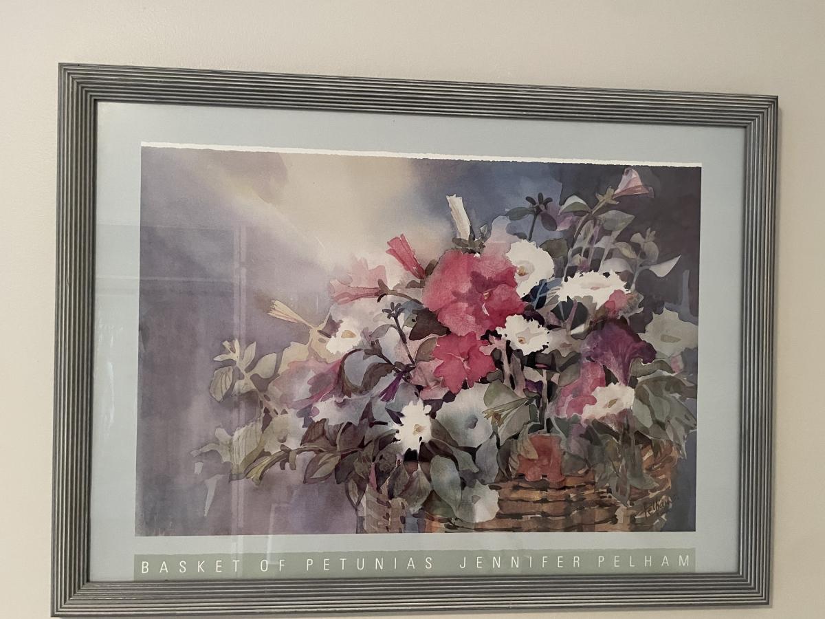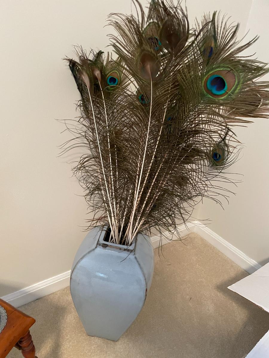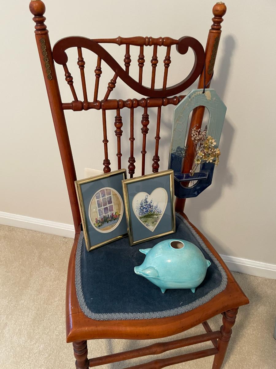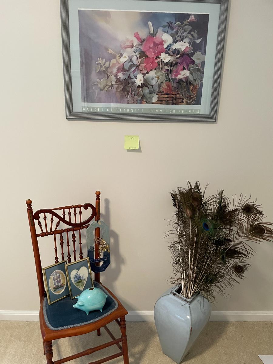 Blue vase with peacock feather, print by Jennifer Pelham, antique chair, piggy bank plus
