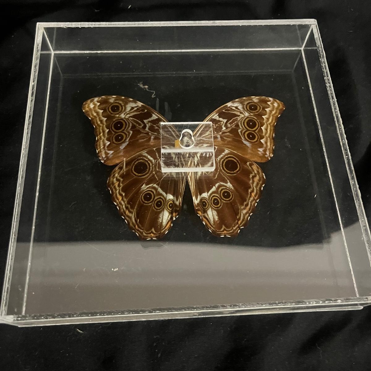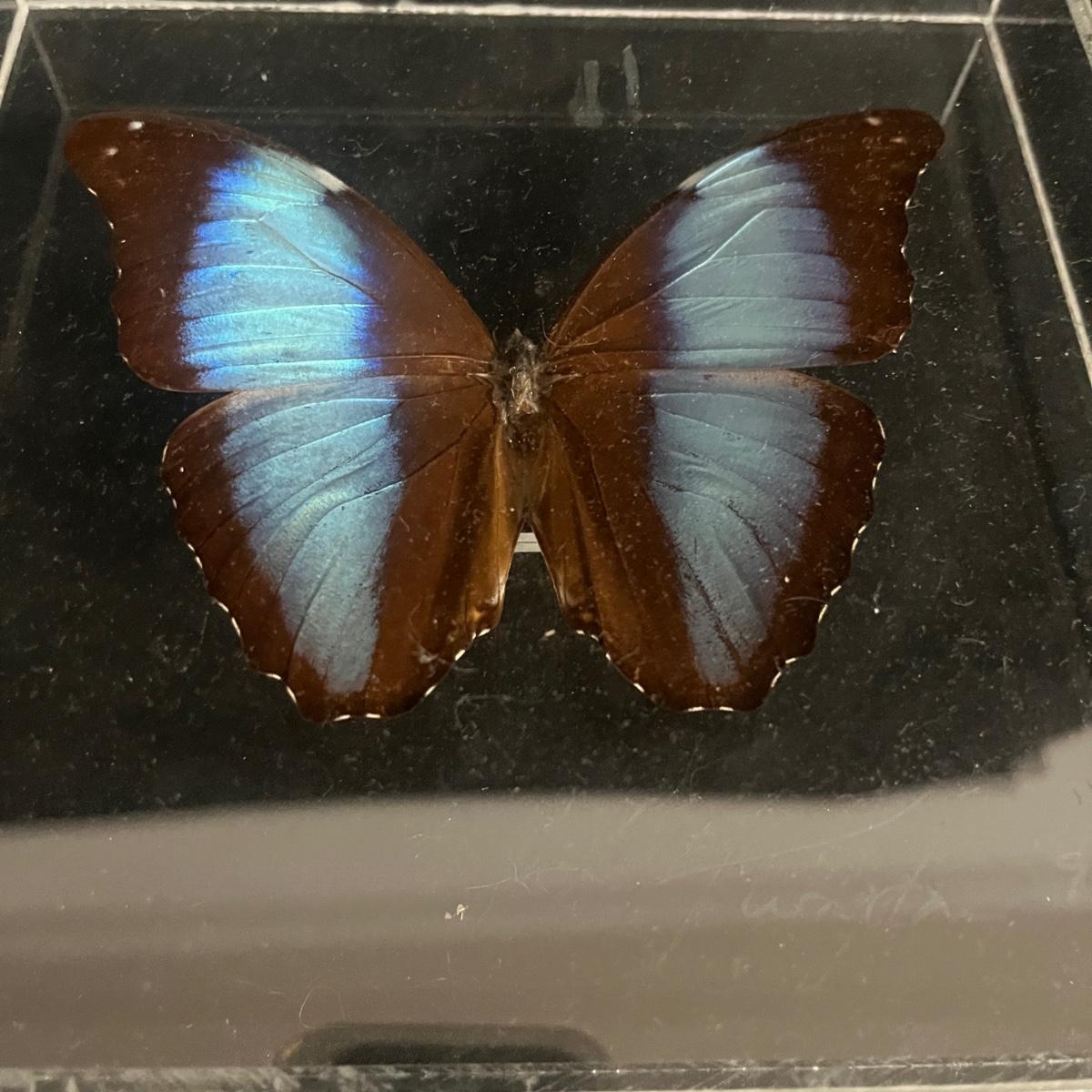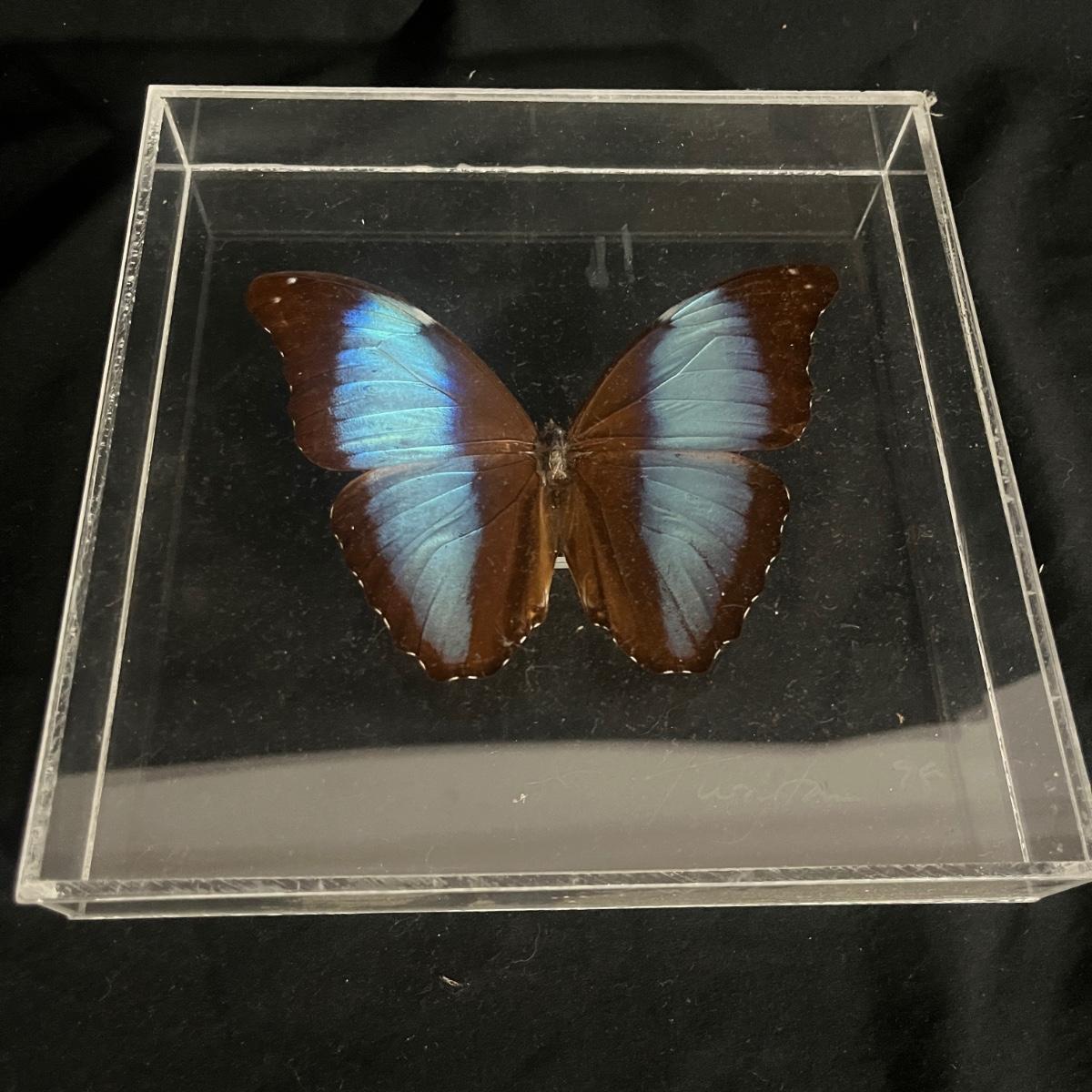 Lot includes a Blue Banded Morpho mounted in a plexiglass display box. Box measures 8” x 1.25” x 8”H.
