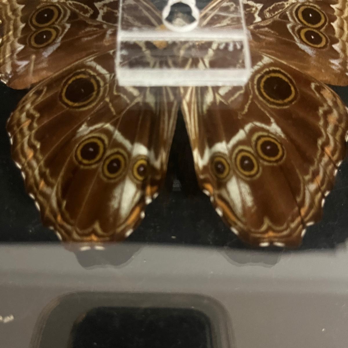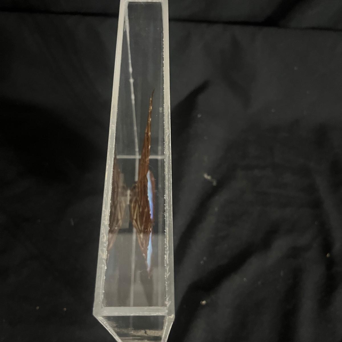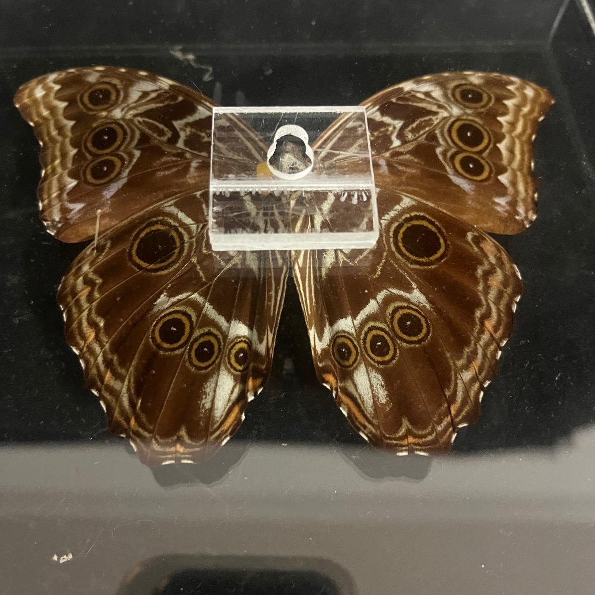 Lot includes a Blue Banded Morpho mounted in a plexiglass display box. Box measures 8” x 1.25” x 8”H.