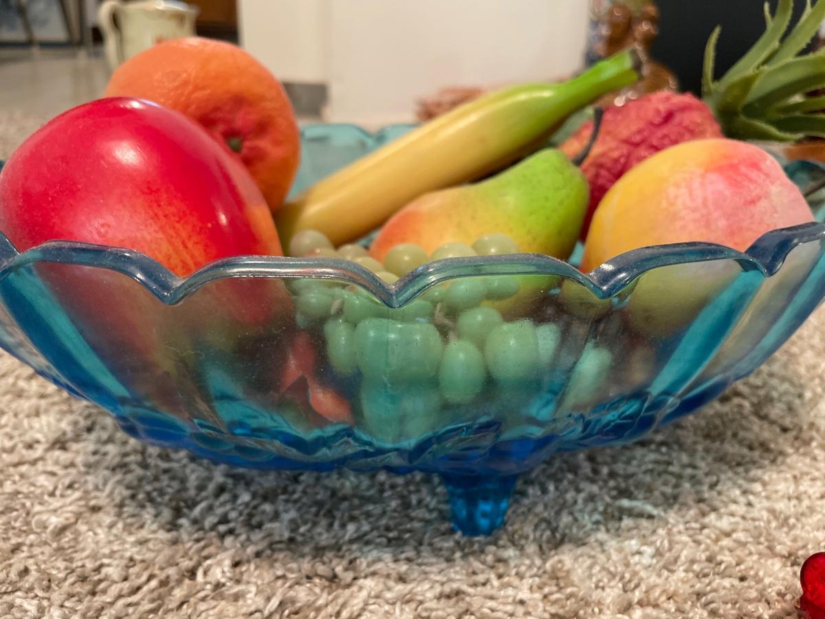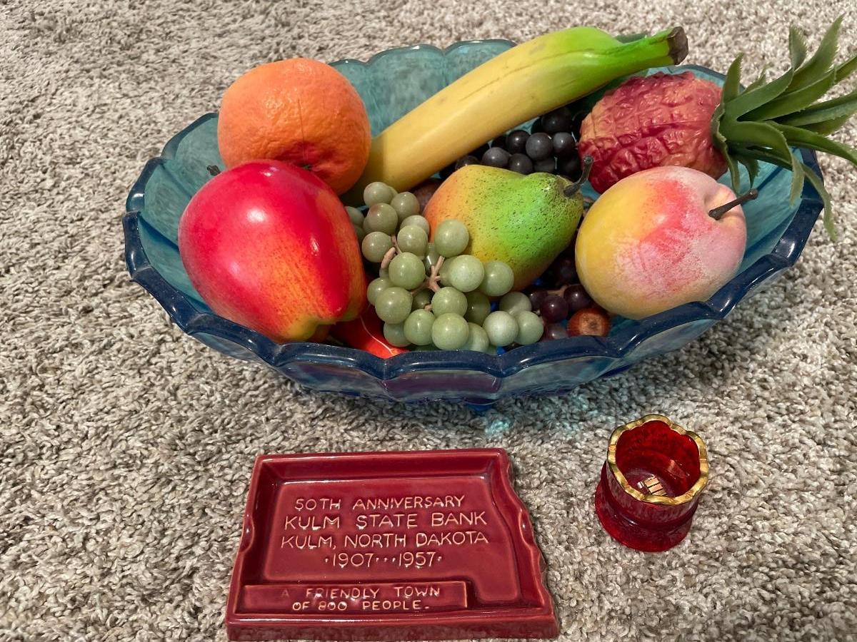 Blue basket with plastic fruit and Kulm items