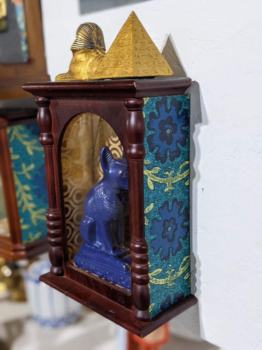 Blue Bastet Cat Shadow Box, Egyptian Sphinx Above, Robin Hackman Artist