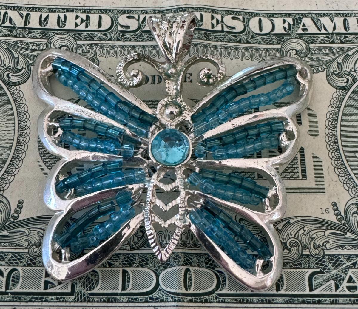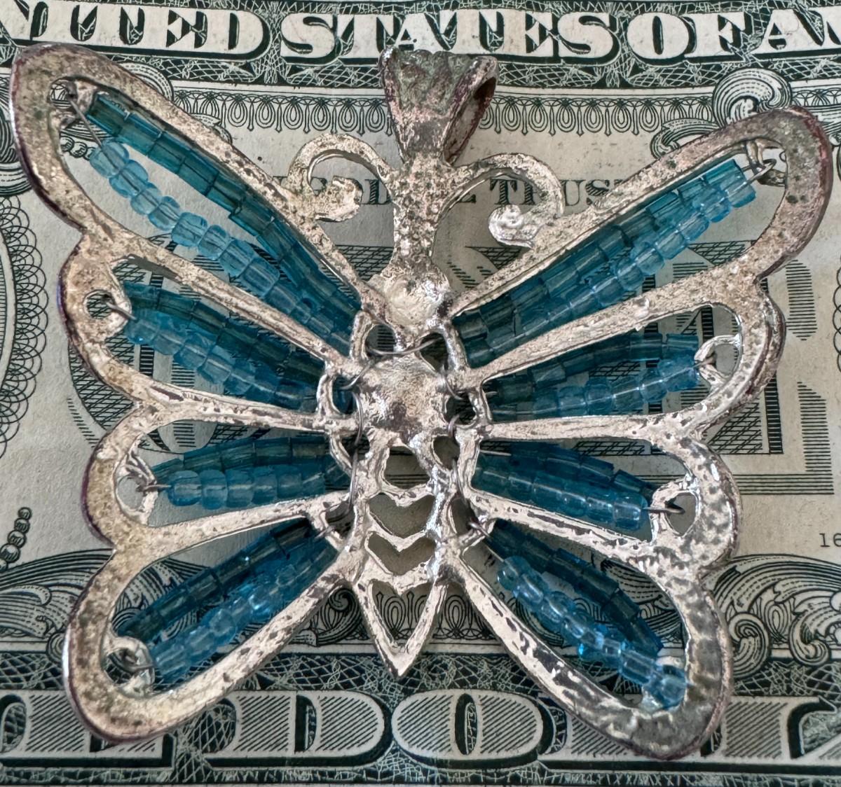 blue beaded butterfly pendant, likely a vintage piece, often found as part of a necklace.