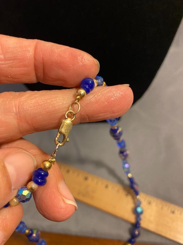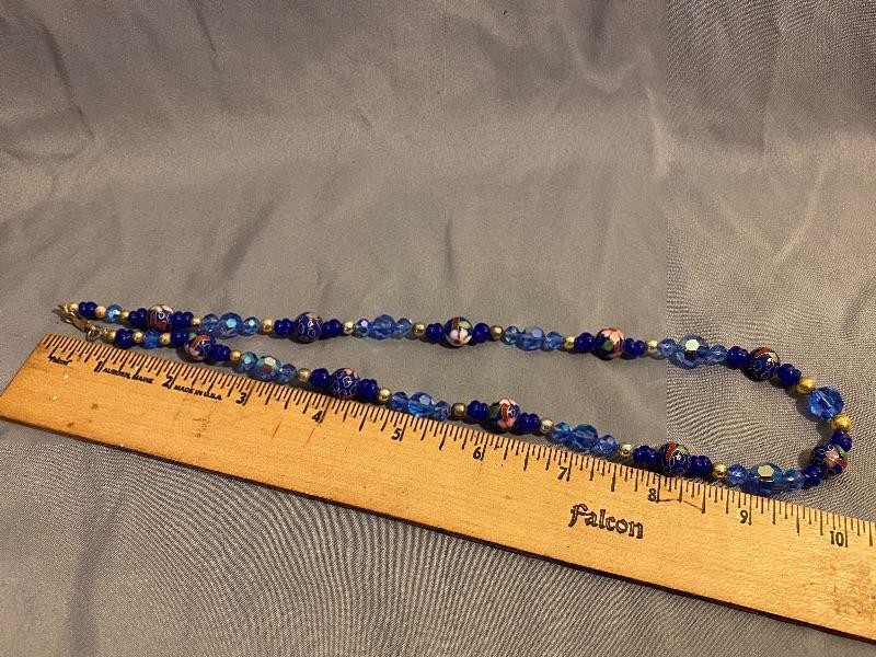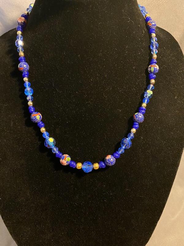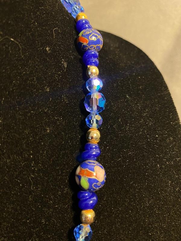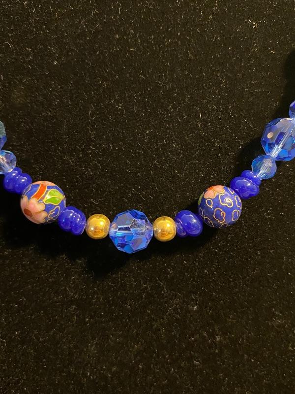 Brilliant blue beaded cloisonne necklace. Faceted glass beads with small cobalt and gold accents. Pink flower cloisonne beads placed in pattern. About 10".