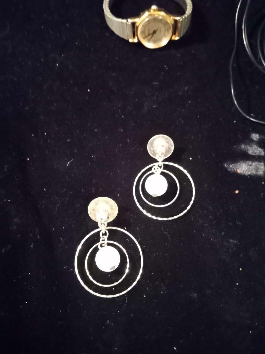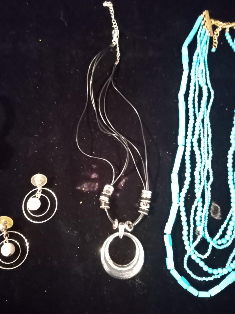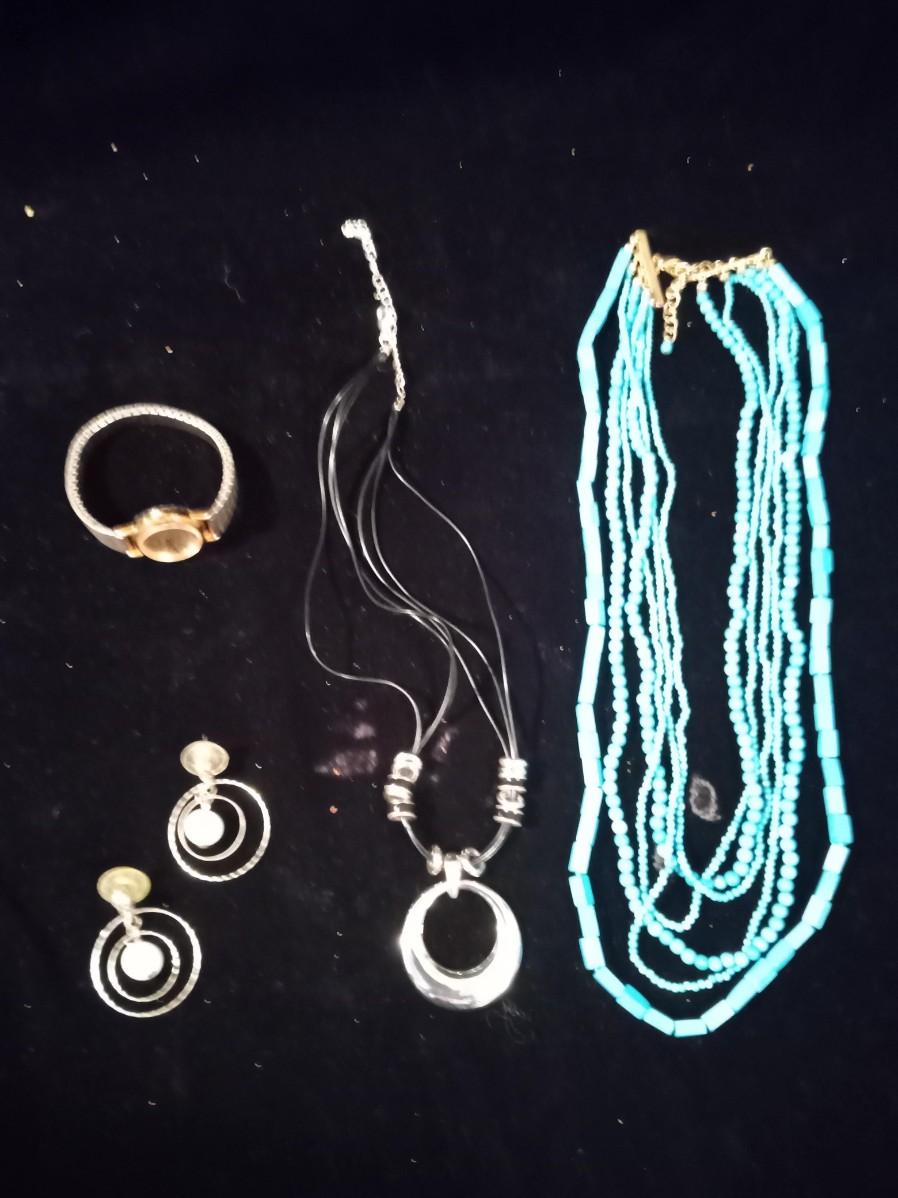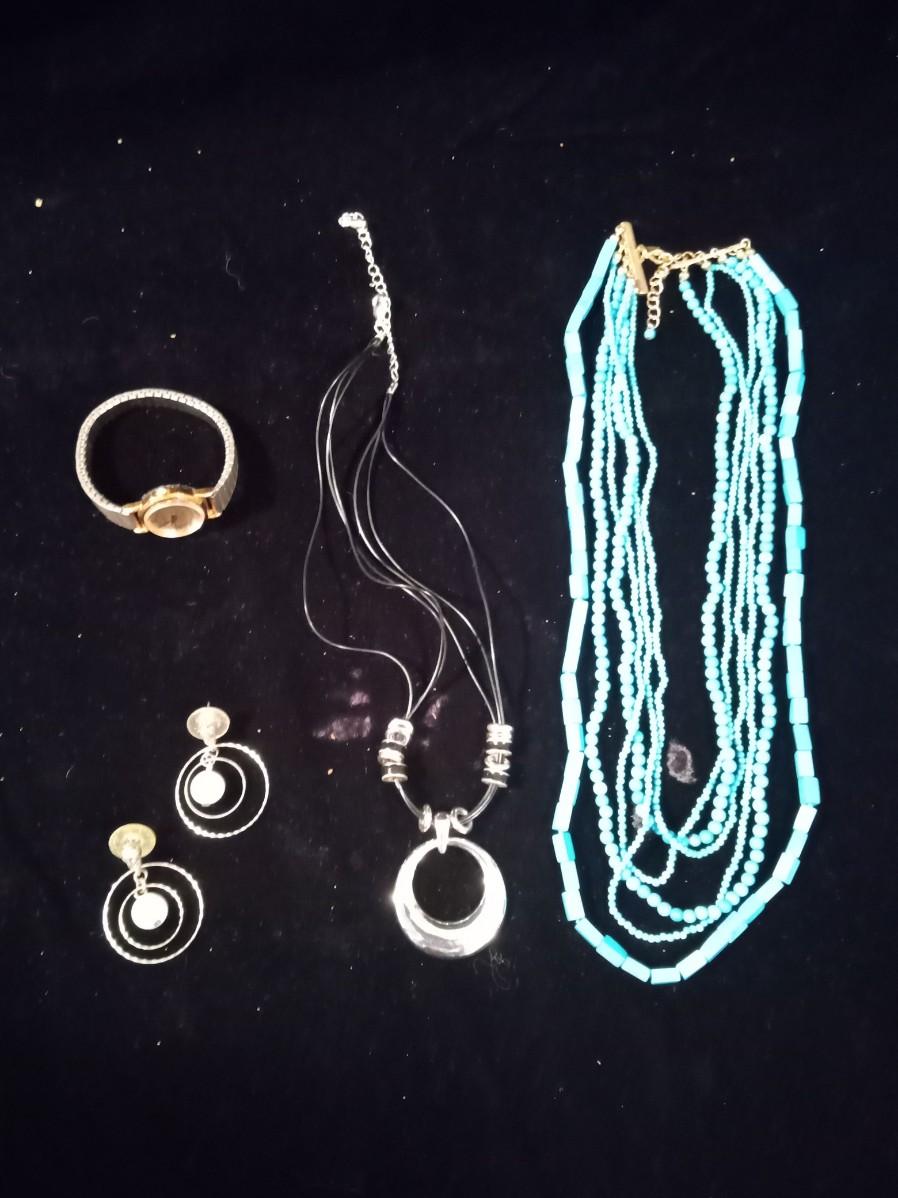 BLUE BEADED NECKLACE WOMEN'S WRIST WATCH THAT WORKS A PAIR OF HOOP EARRINGS AND MORE