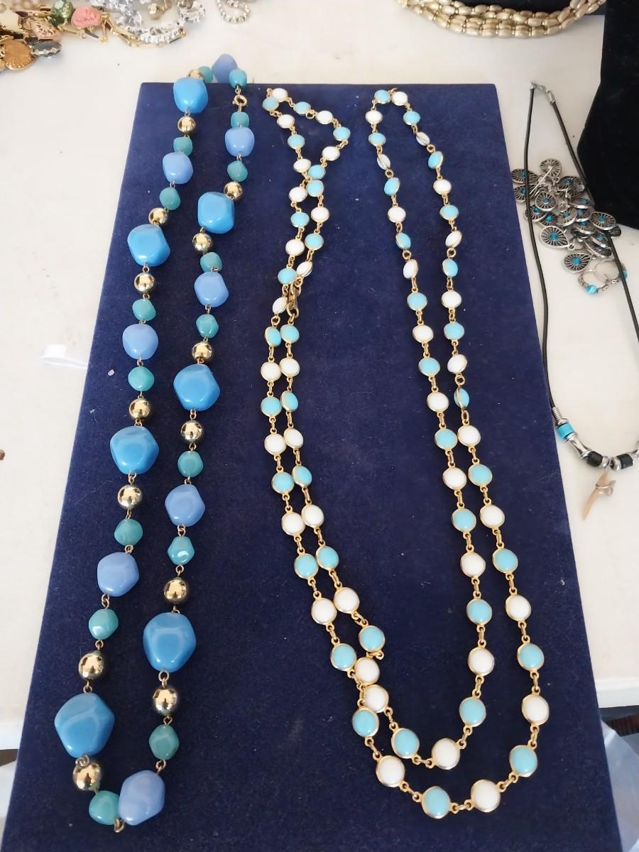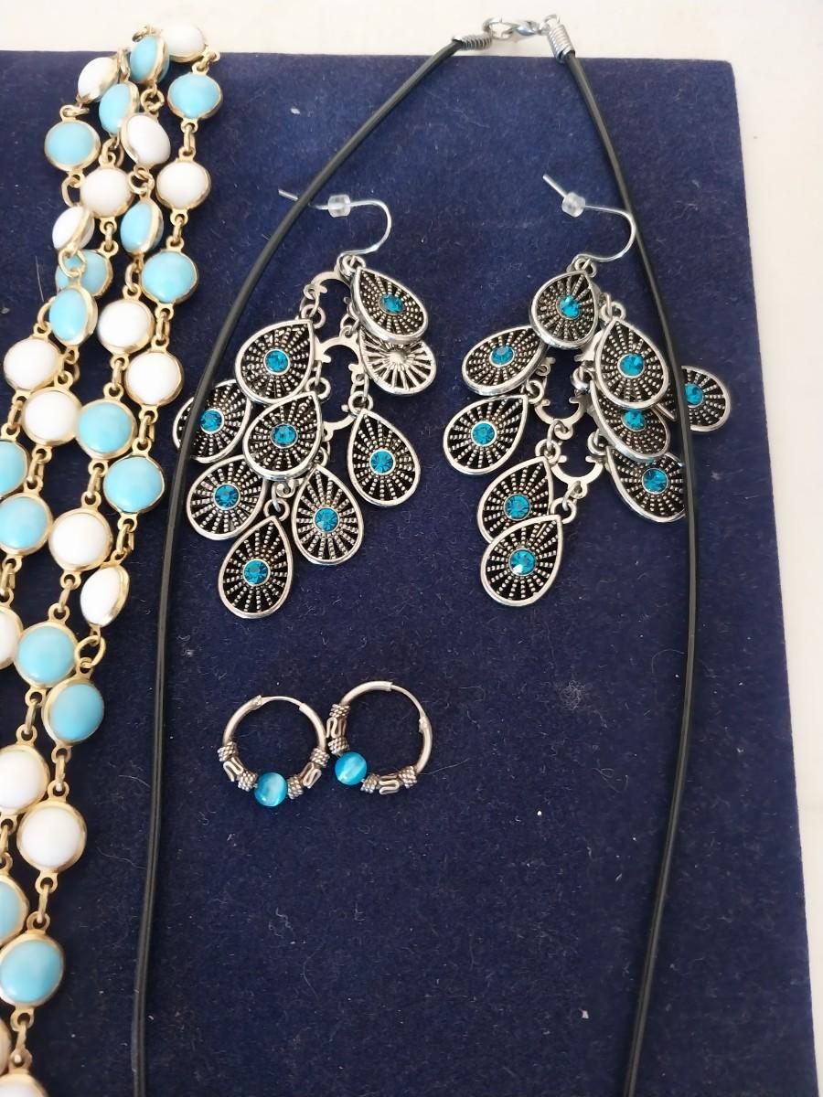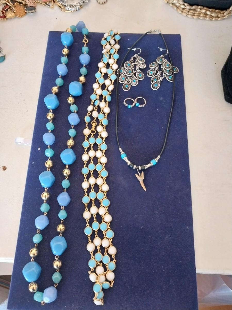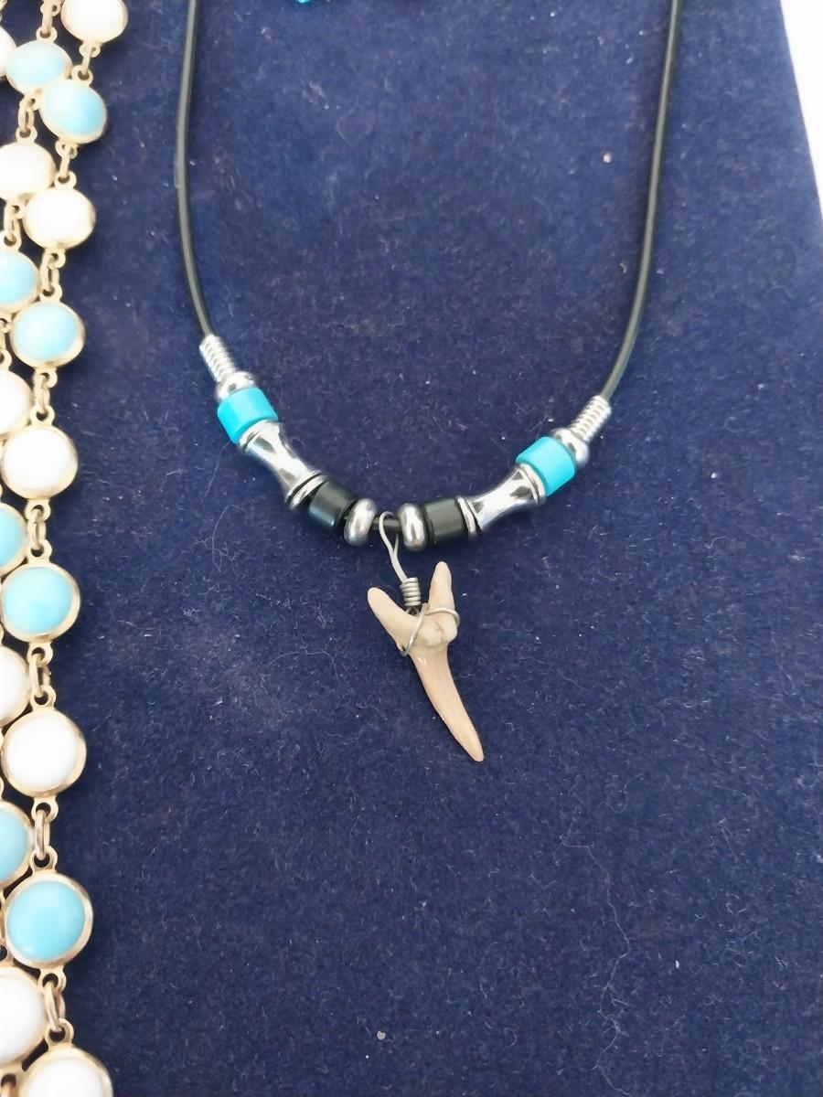 BLUE BEADED NECKLACES-SHARK TOOTH PENDENT AND TWO PAIR EARRINGS