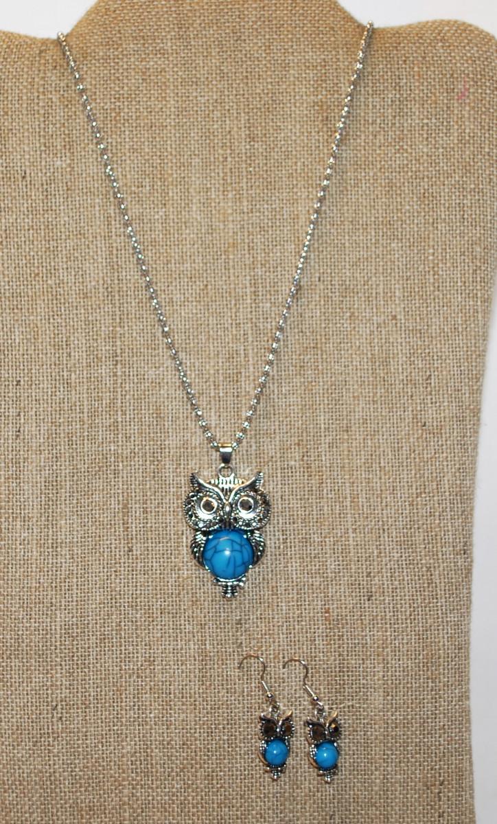 "Blue Belly" Owl PENDANT (1½" x 1") AND Earrings (1" x ½") Set on a Silver Tone Necklace Chain 27" L