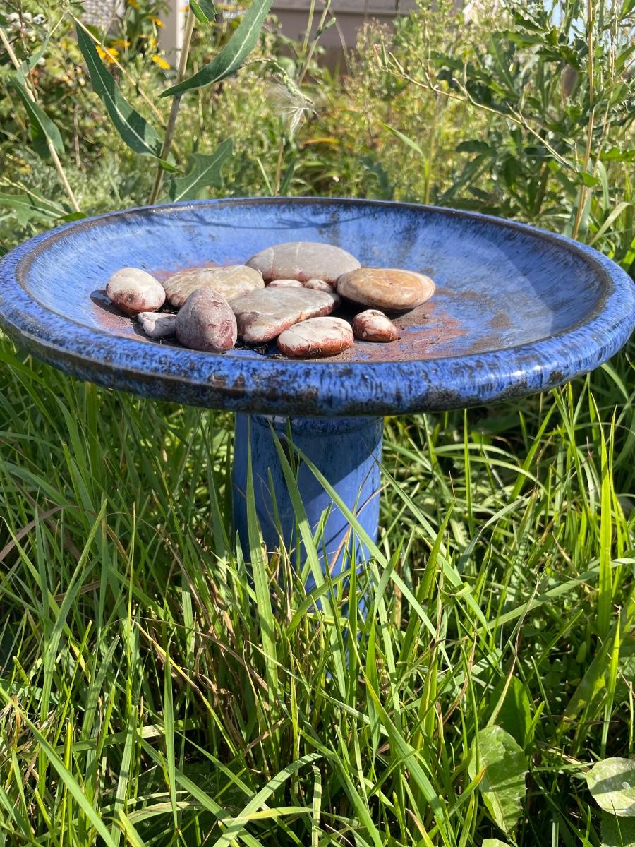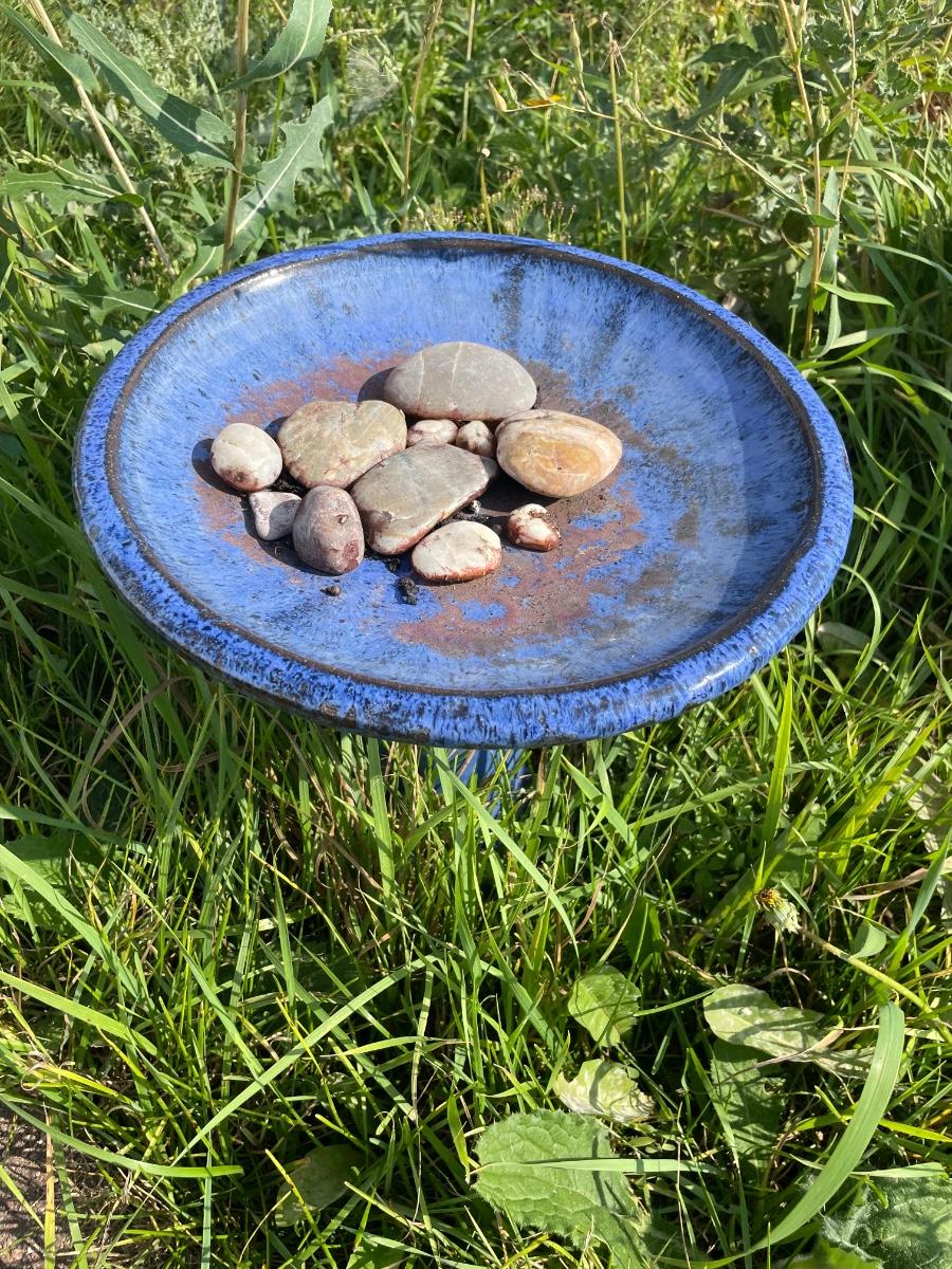Blue bird bath with rocks