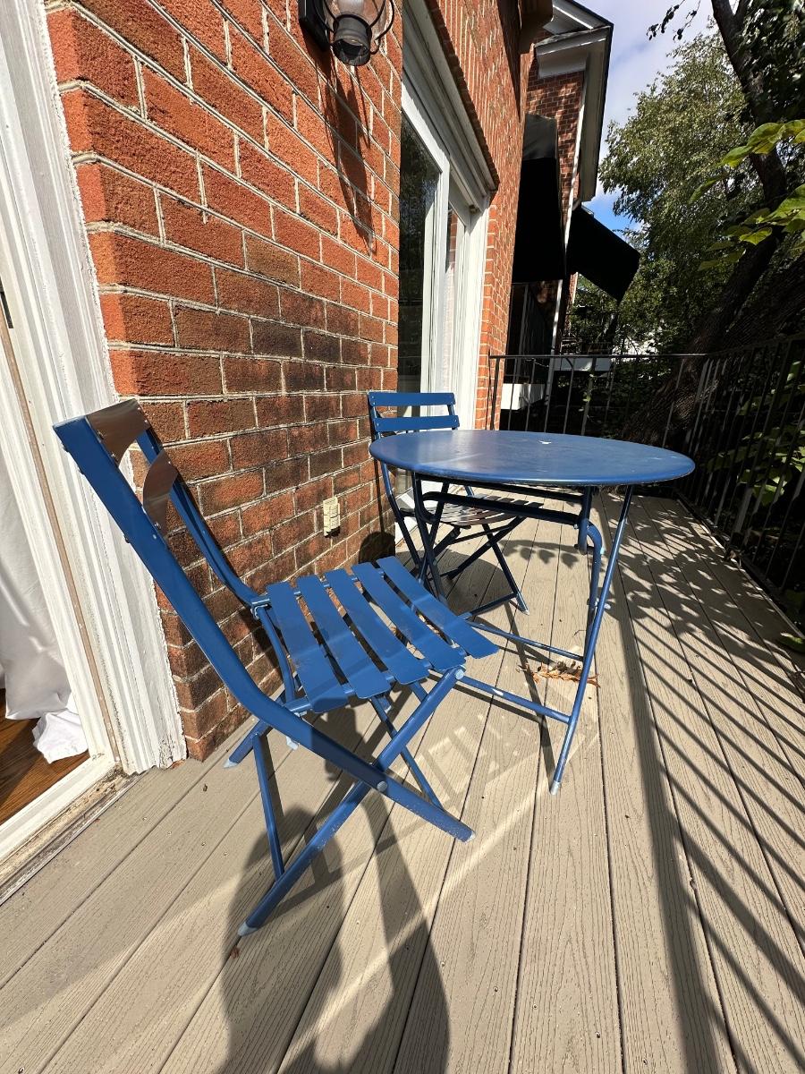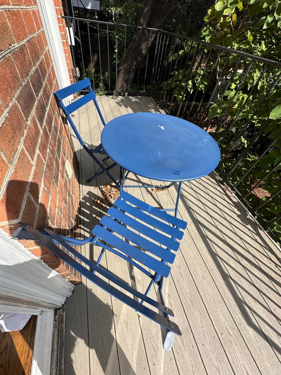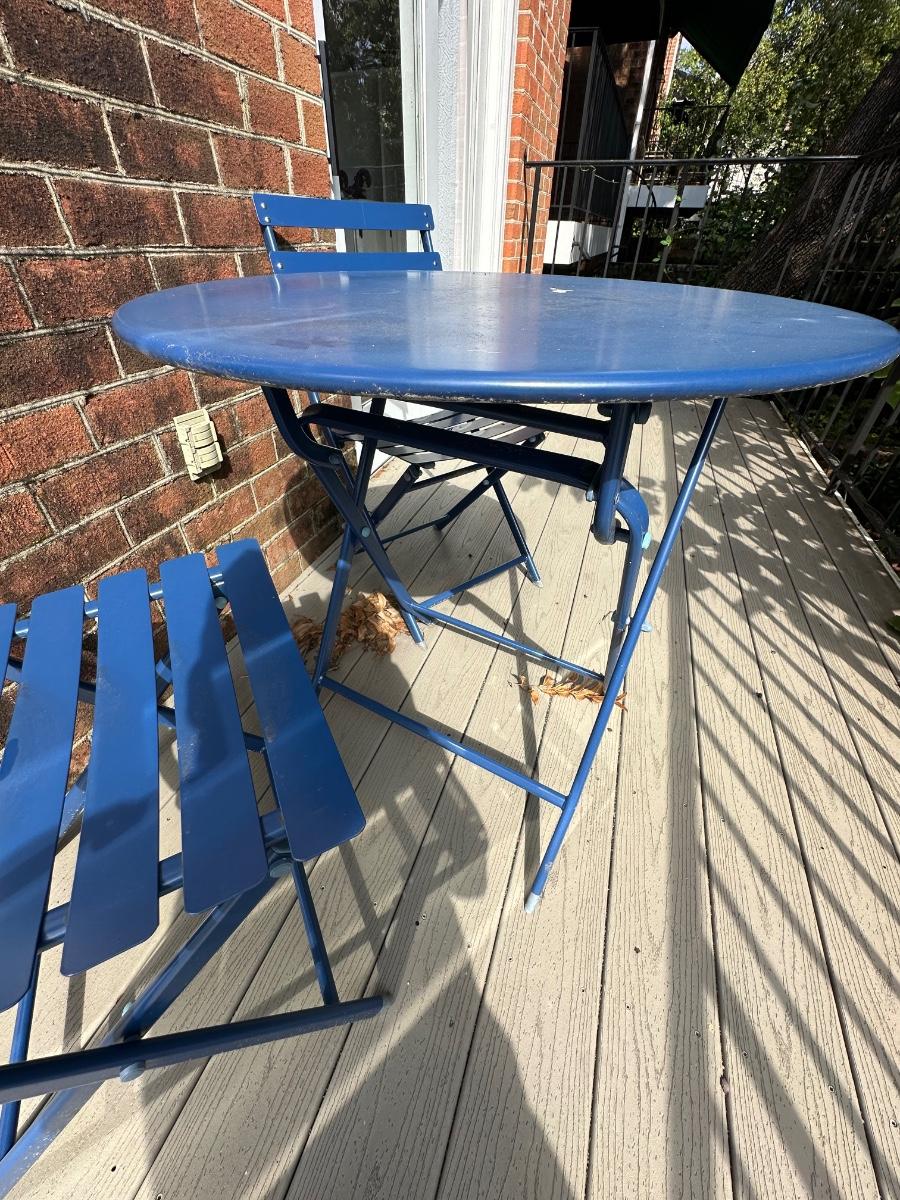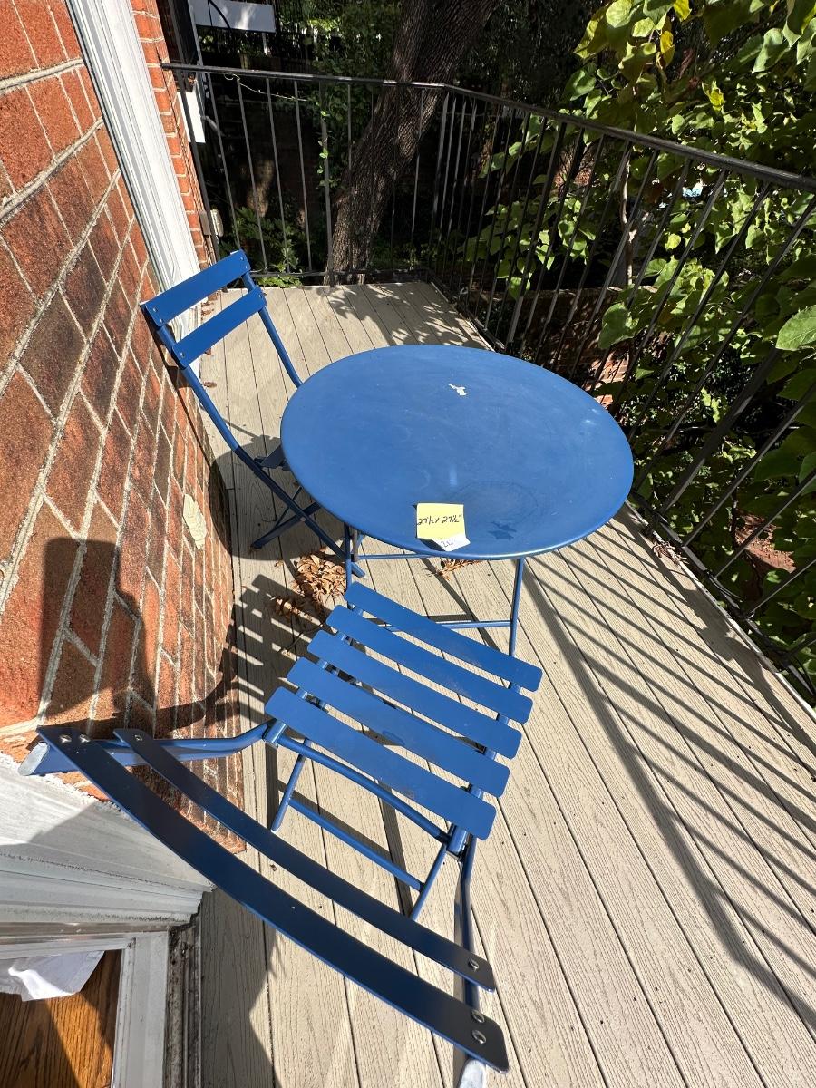 BLUE BISTRO TABLE SET 27 1/2 WIDE 27 1/2 TALL FOLDS FOR EASY STORAGE