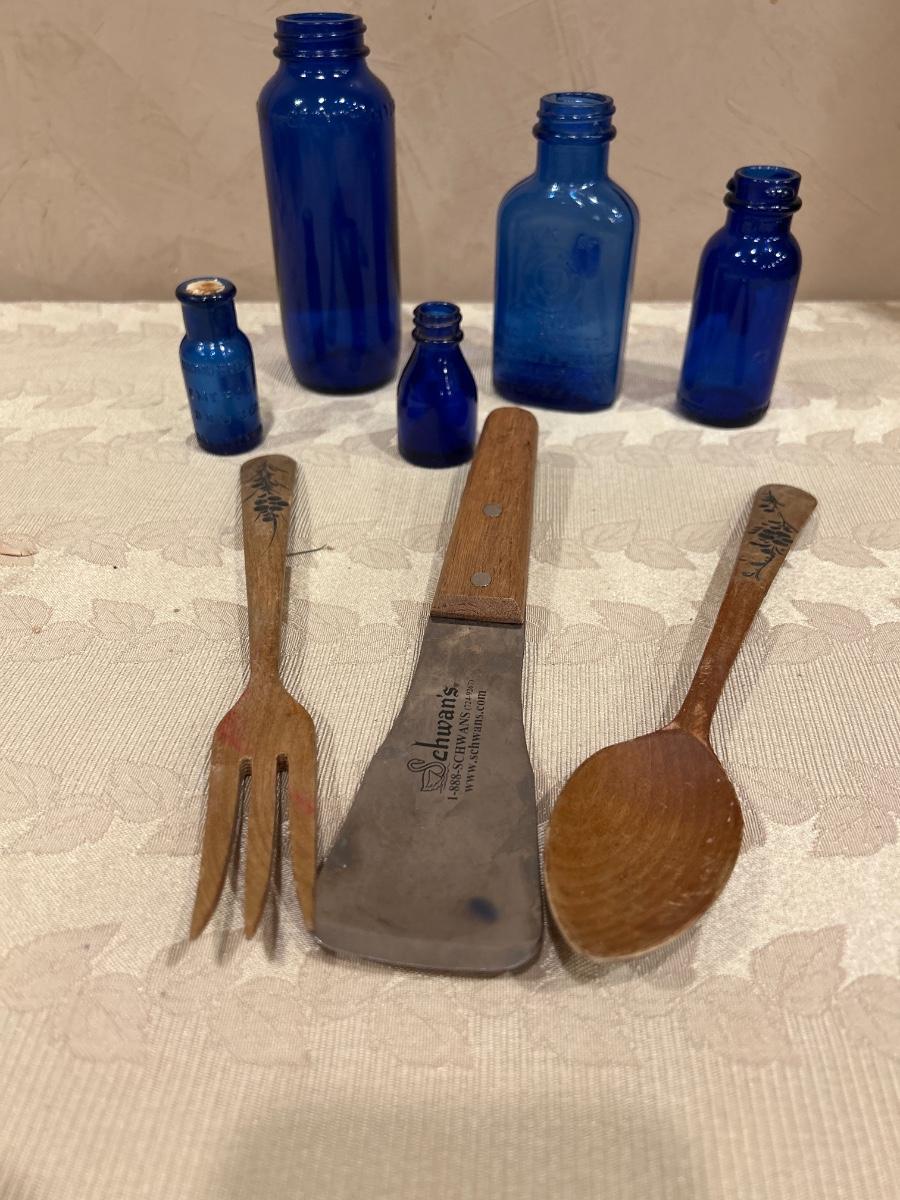 Milk of magnesia, bromo seltzer, wood spoon & fork & Schwan’s spatula