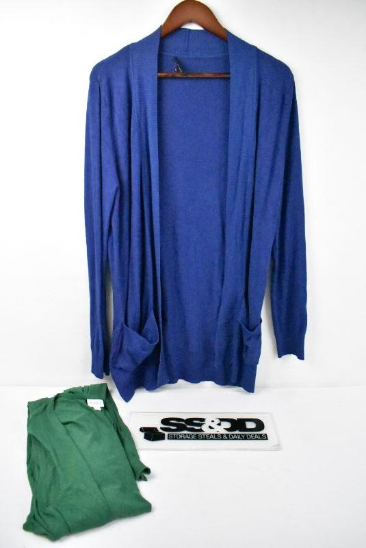 2 Piece Women's Clothing Size Large: Blue Cardigan (Staccato) & Green Duster Vest (LuLaRoe Joy)