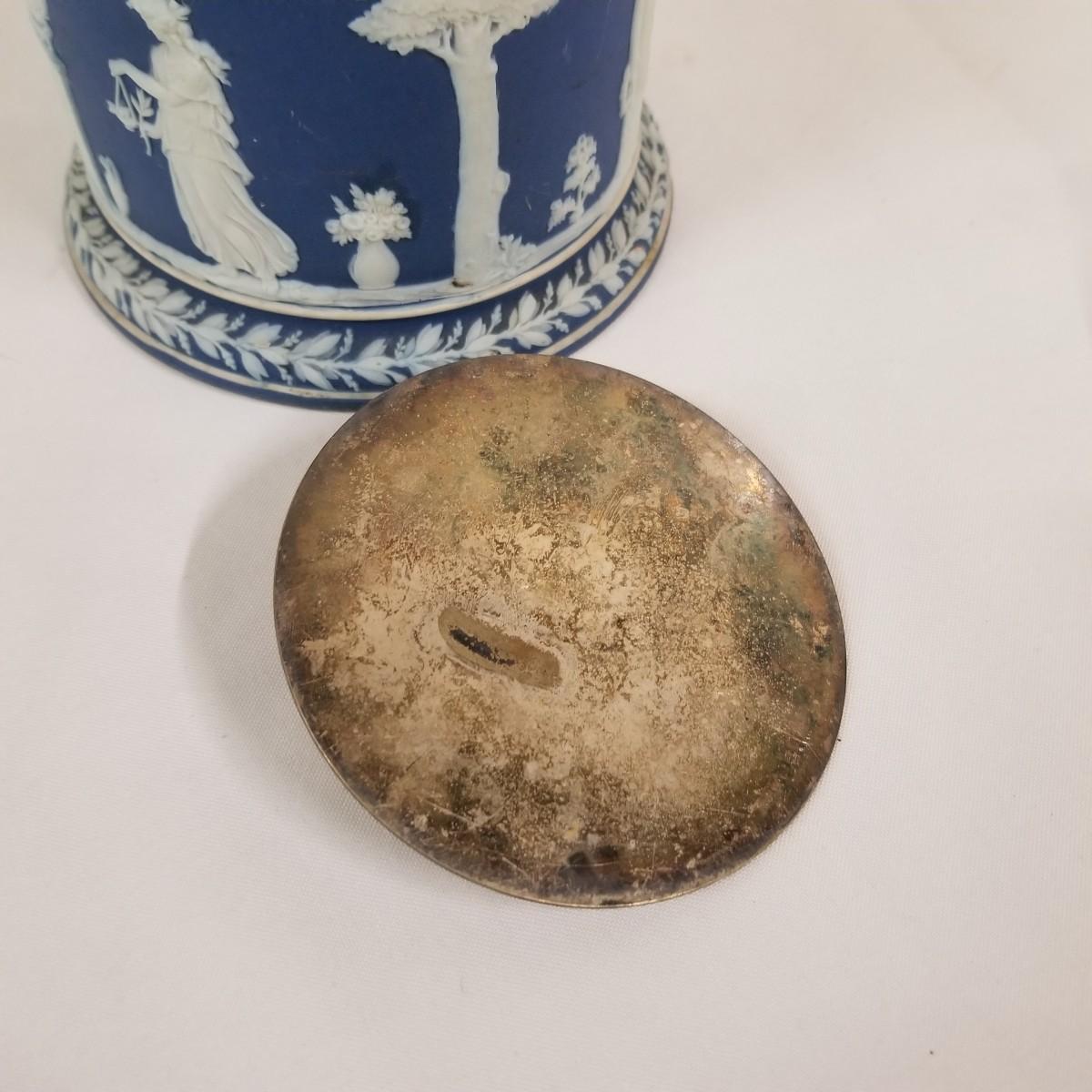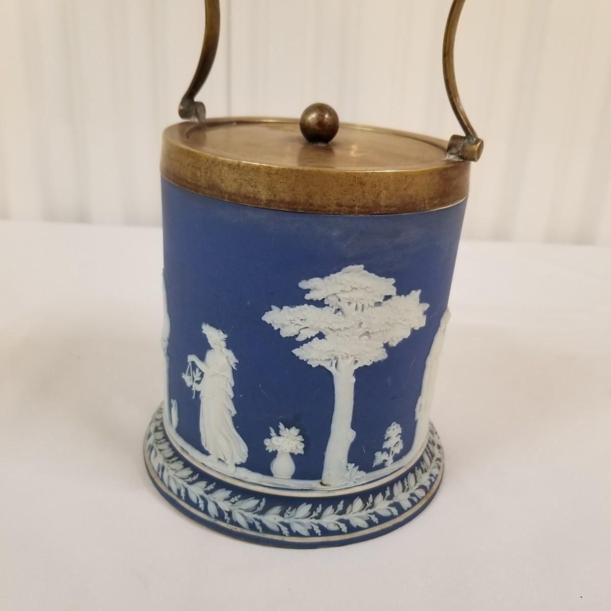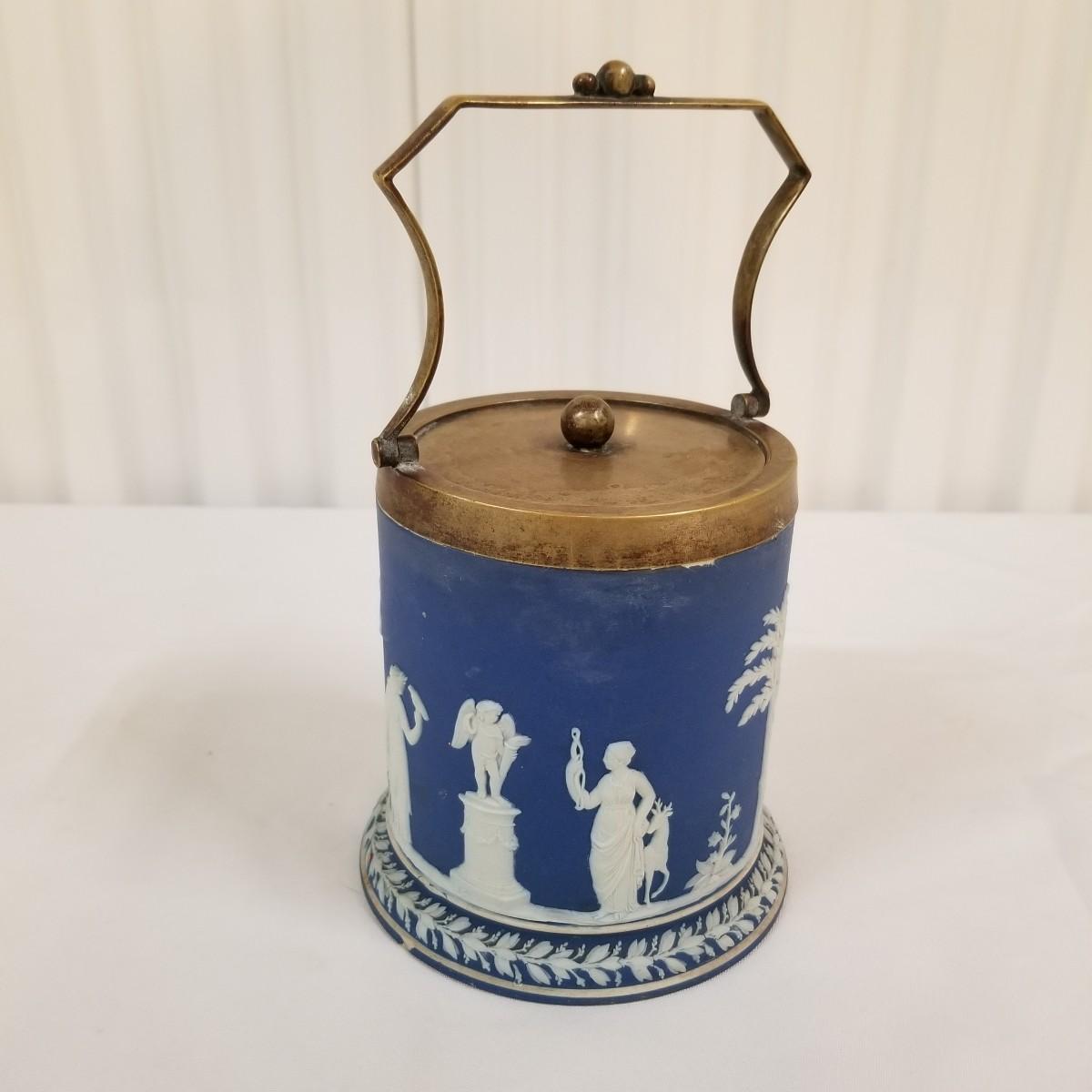 This vintage lidded tin in the Wedgwood style is most likely a biscuit/cookie tin.  We have been told by the owner of this estate, this is what is and that it came from England. Blue ceramic base with metal top and handle.  Item measures 6" d x10"h.  Some patina on handle and top, see photos for detail.   Shipping available.