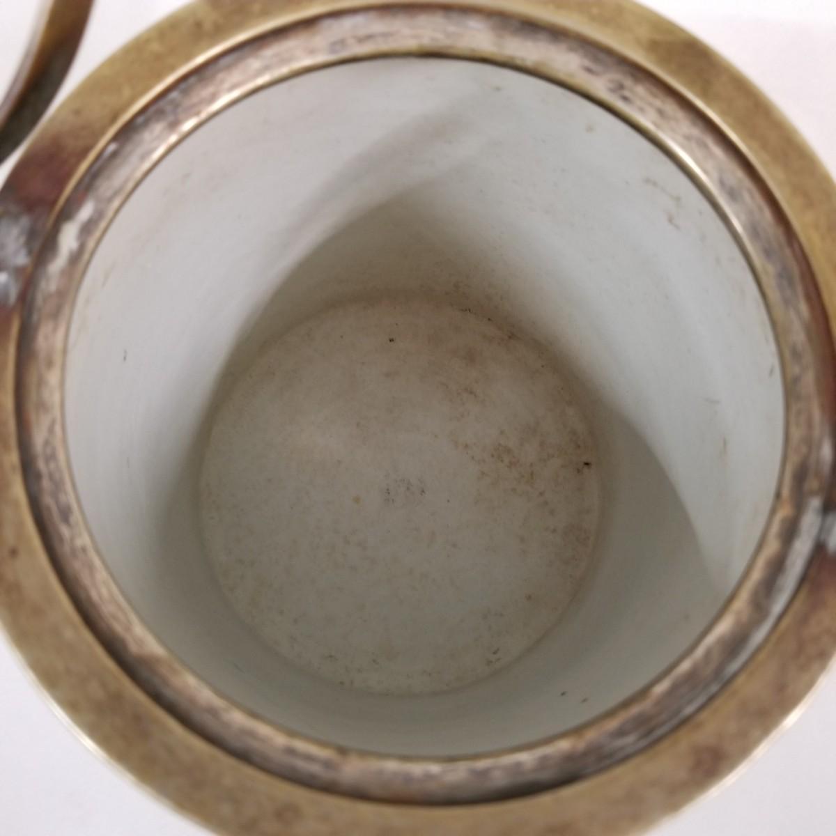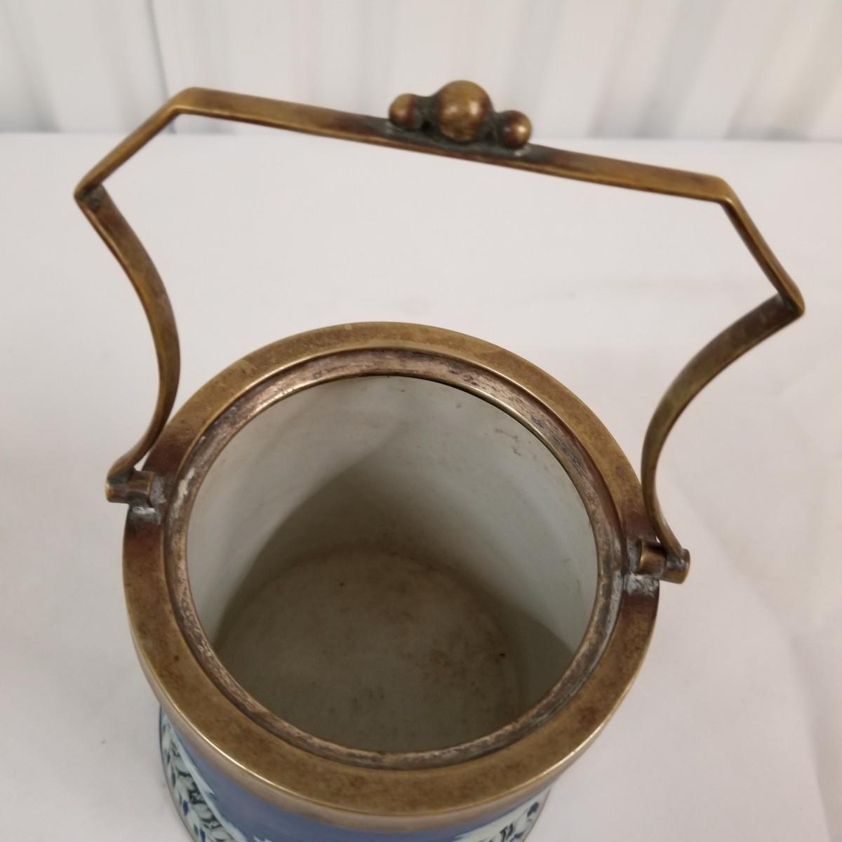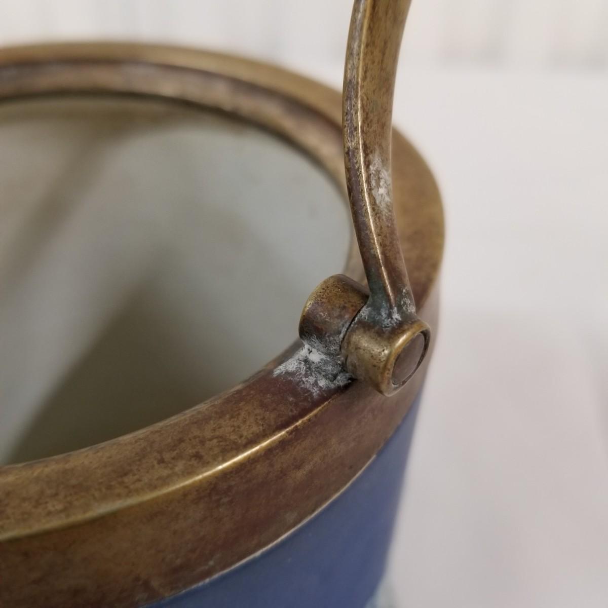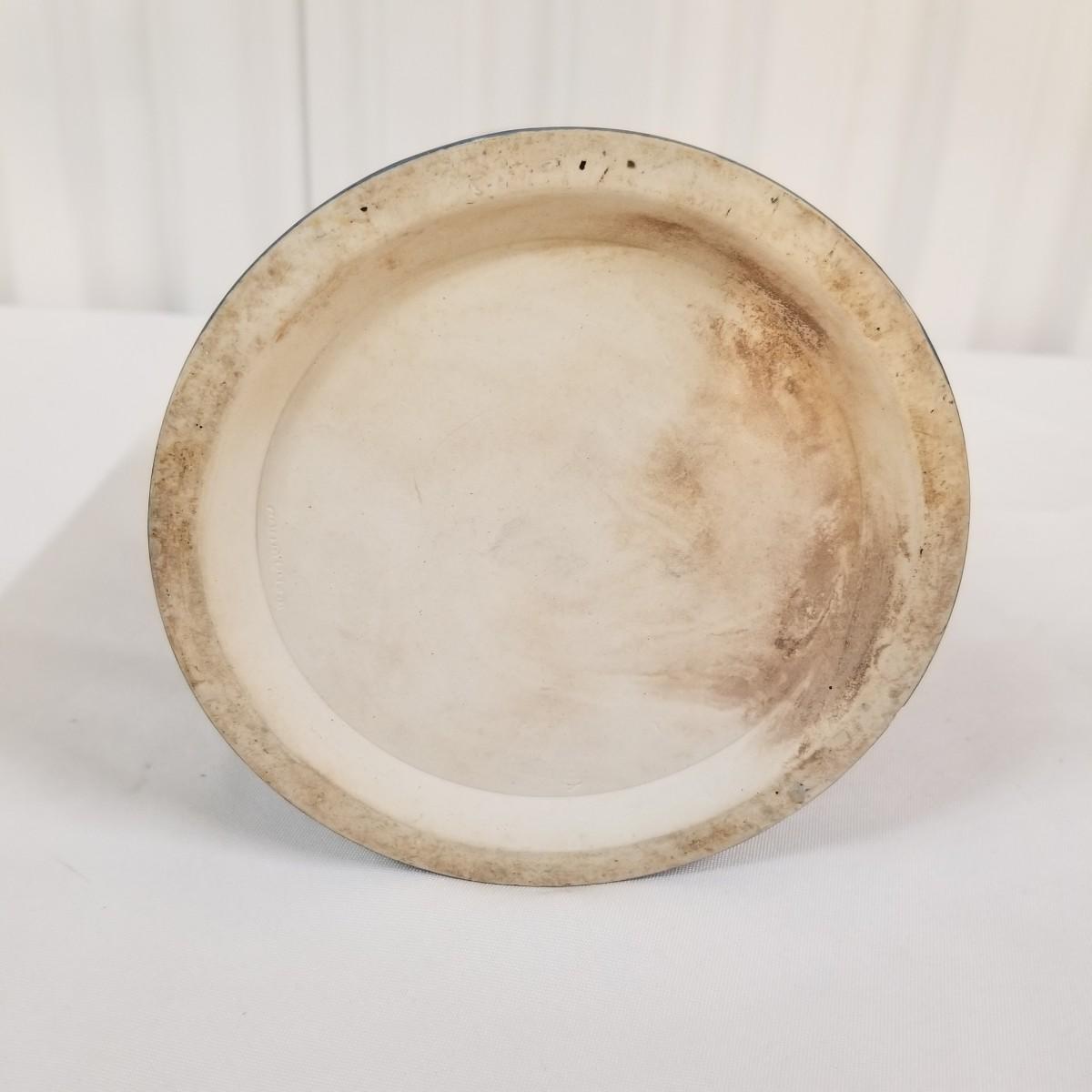 This vintage lidded tin in the Wedgwood style is most likely a biscuit/cookie tin.  We have been told by the owner of this estate, this is what is and that it came from England. Blue ceramic base with metal top and handle.  Item measures 6" d x10"h.  Some patina on handle and top, see photos for detail.   Shipping available.