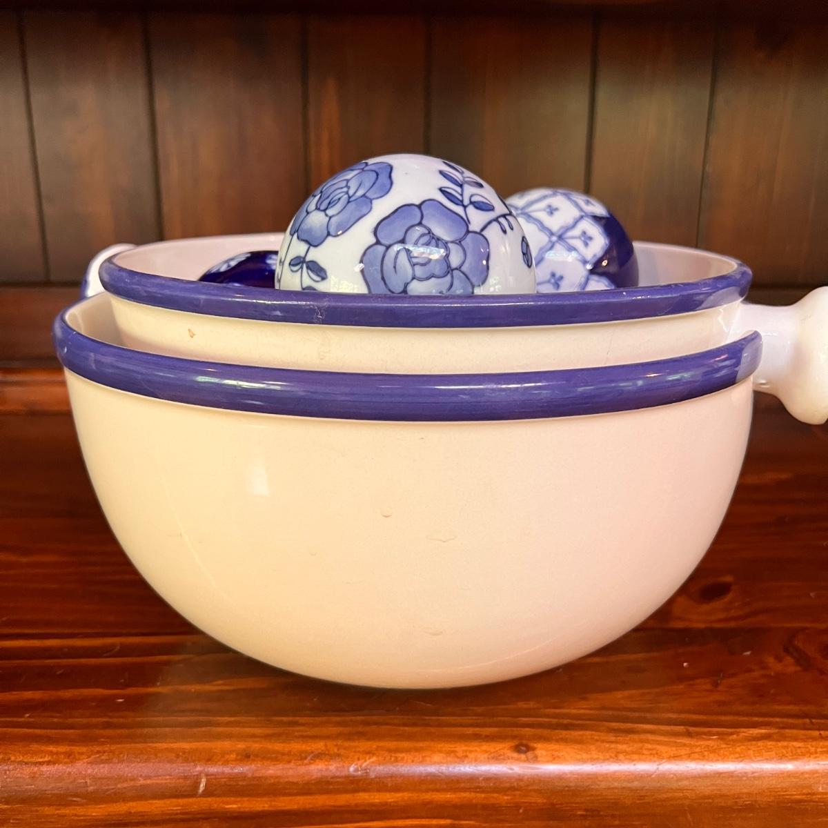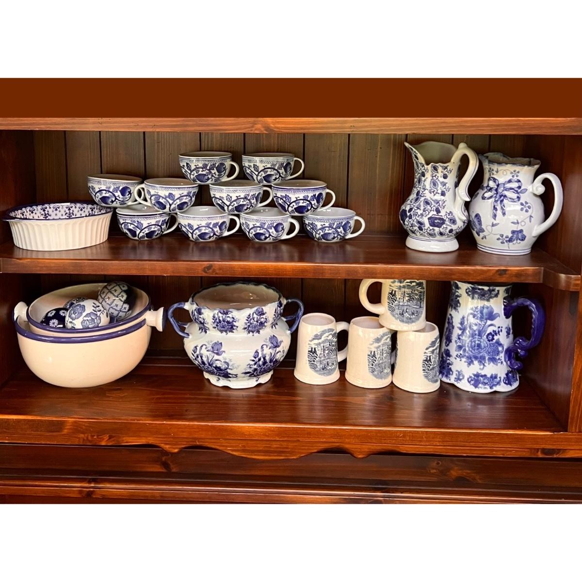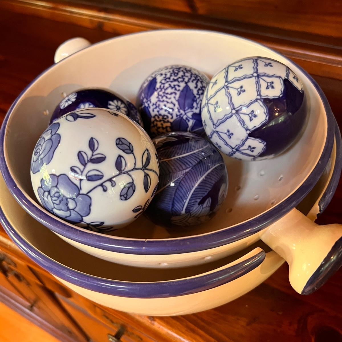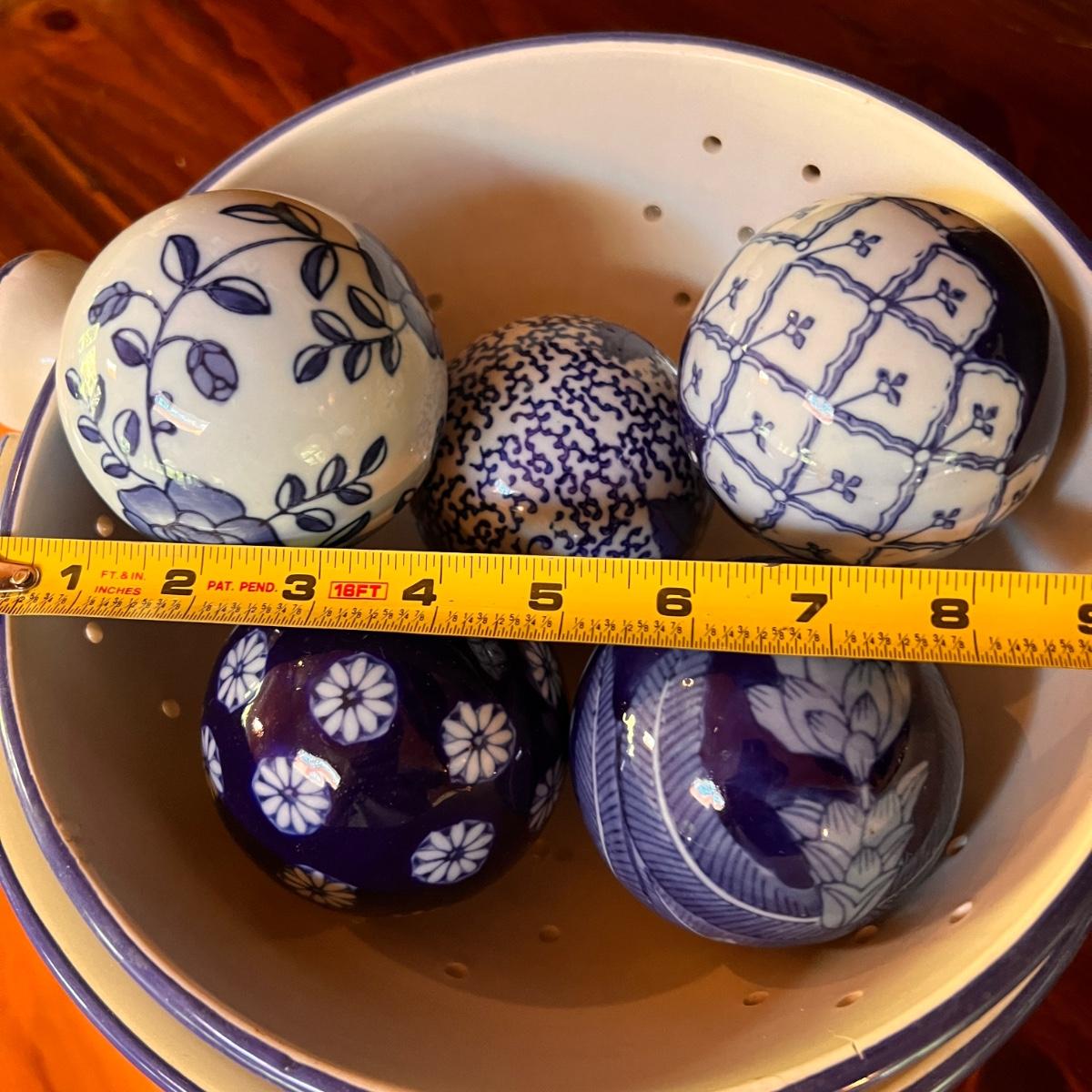 10 tea cups, 2 pitchers, 4 porcelain steins, 5 decorative ceramic balls, ceramic colander with handle rests inside bowl, and more.