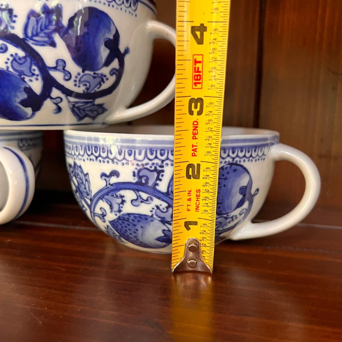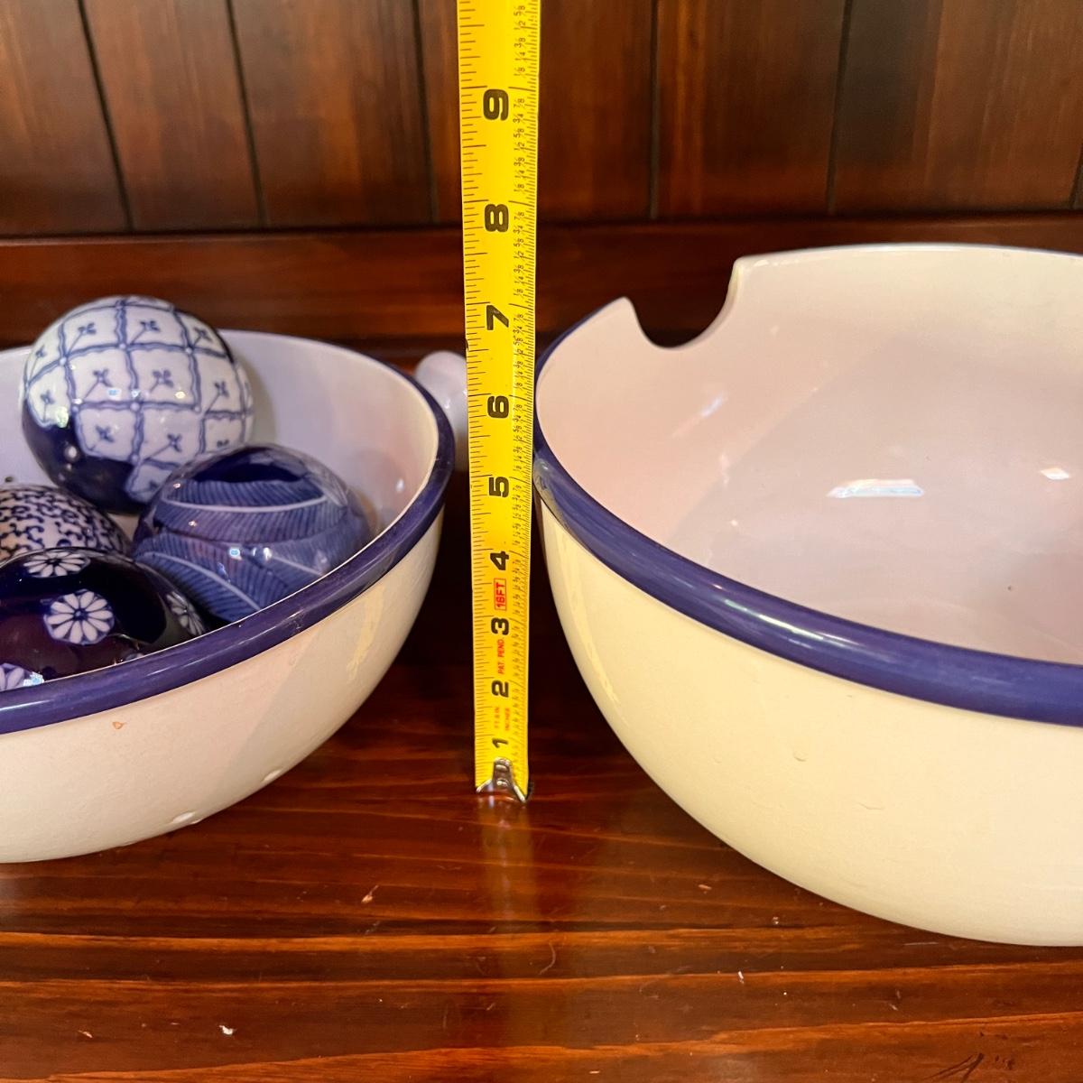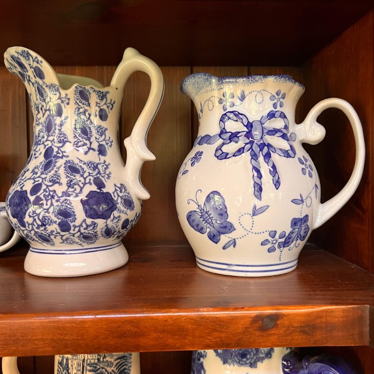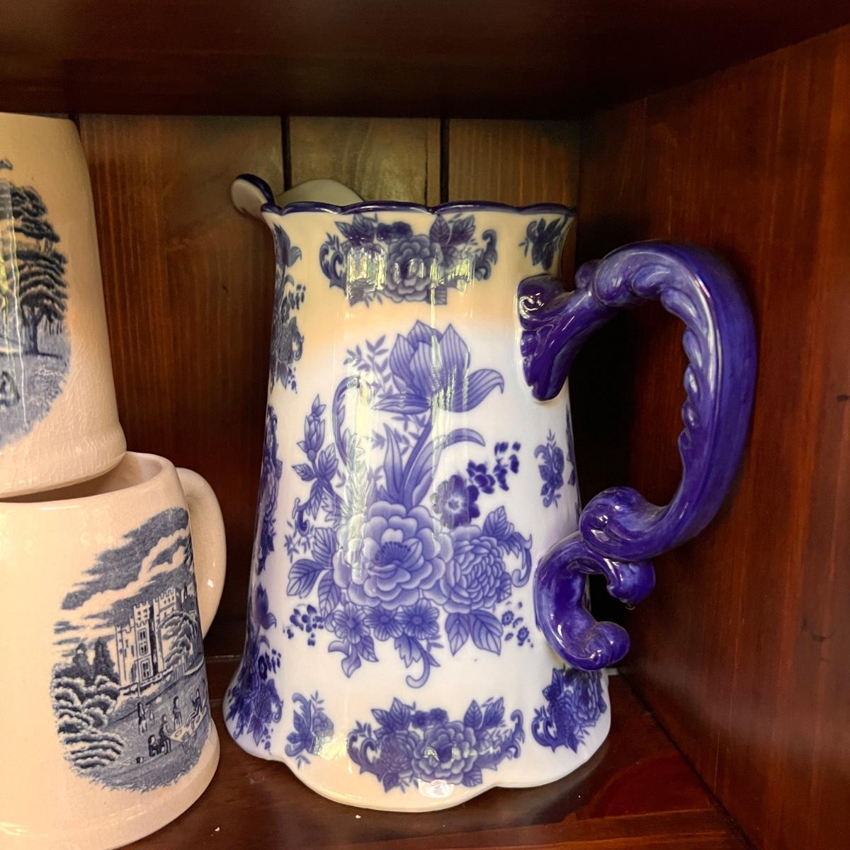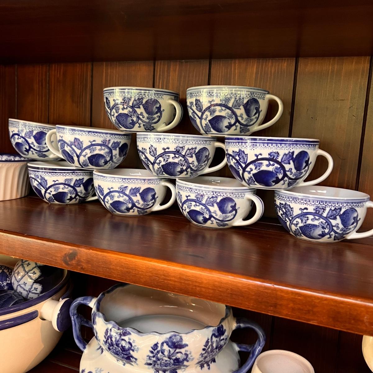 10 tea cups, 2 pitchers, 4 porcelain steins, 5 decorative ceramic balls, ceramic colander with handle rests inside bowl, and more.