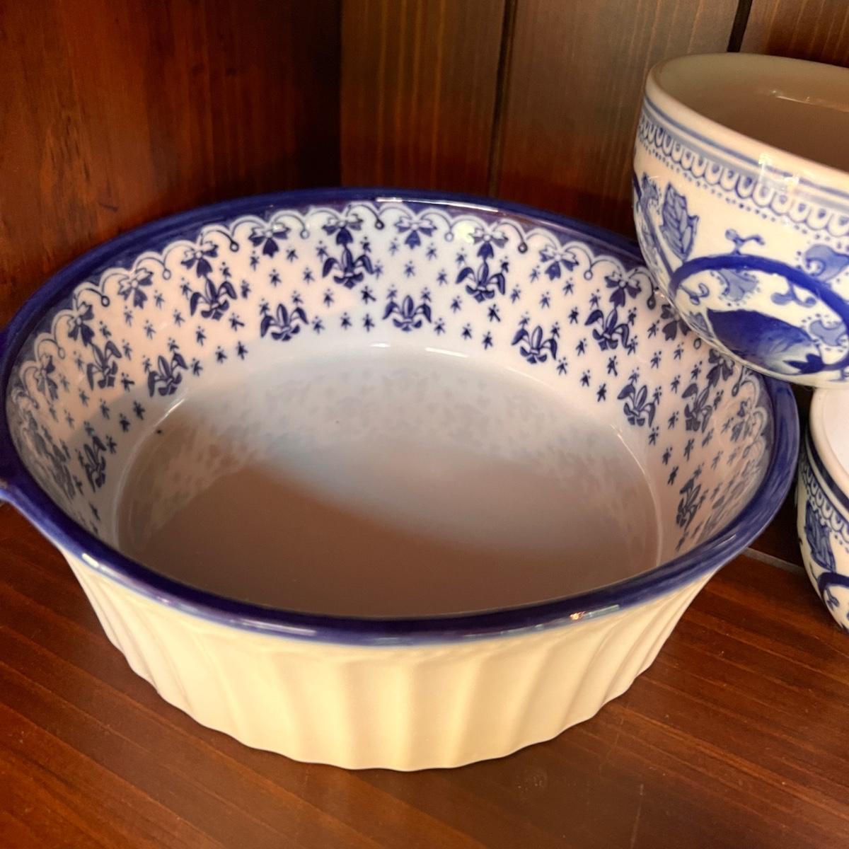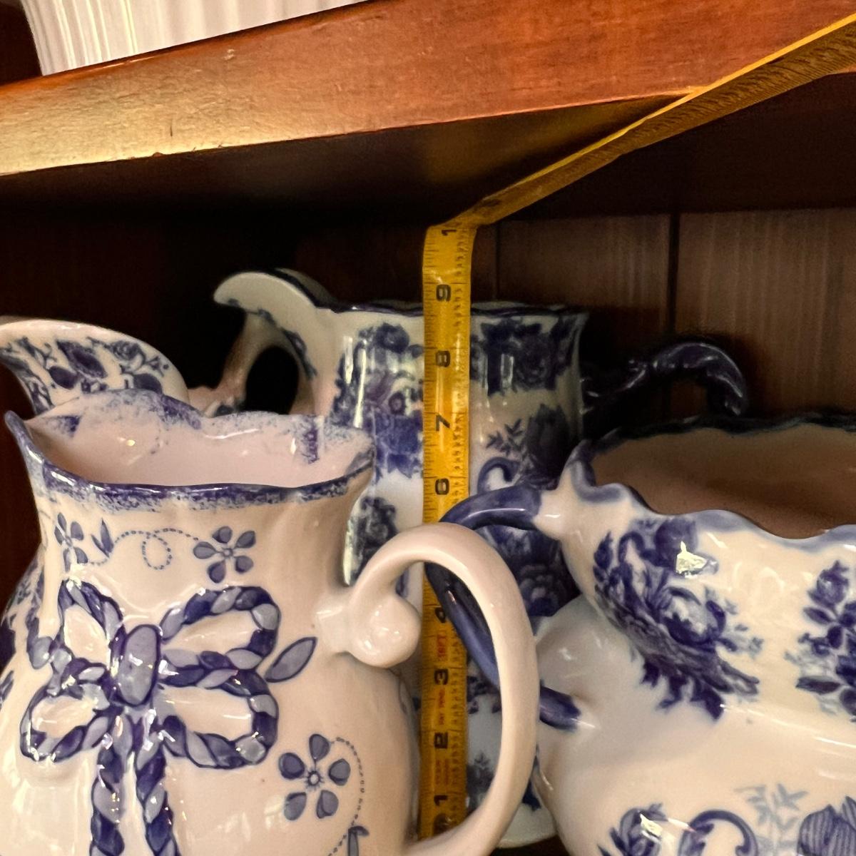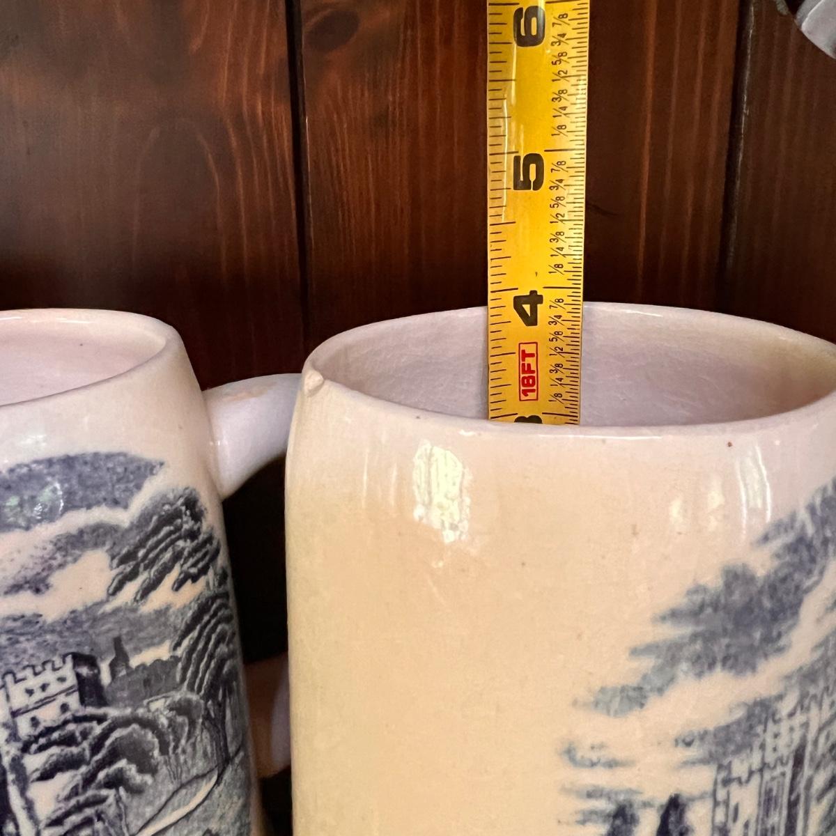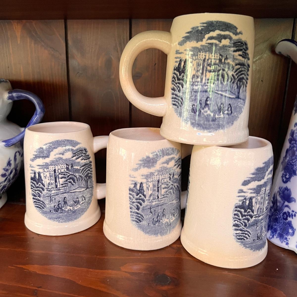 10 tea cups, 2 pitchers, 4 porcelain steins, 5 decorative ceramic balls, ceramic colander with handle rests inside bowl, and more.