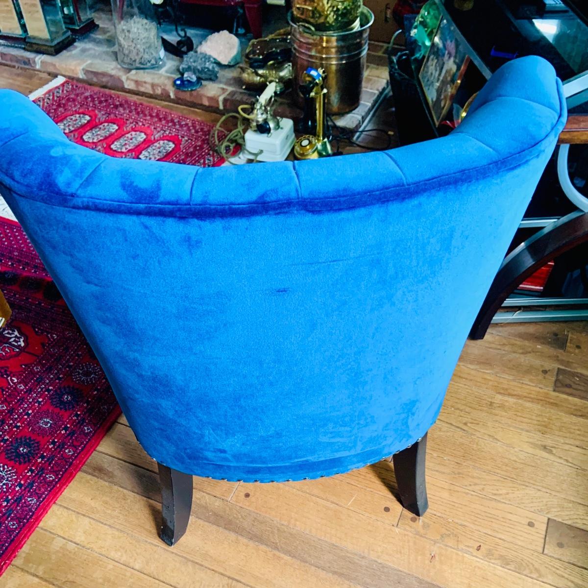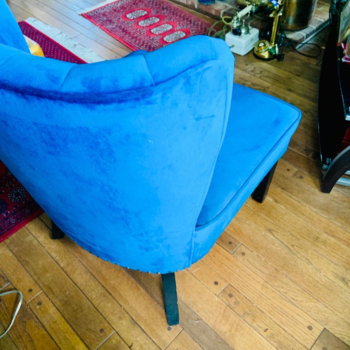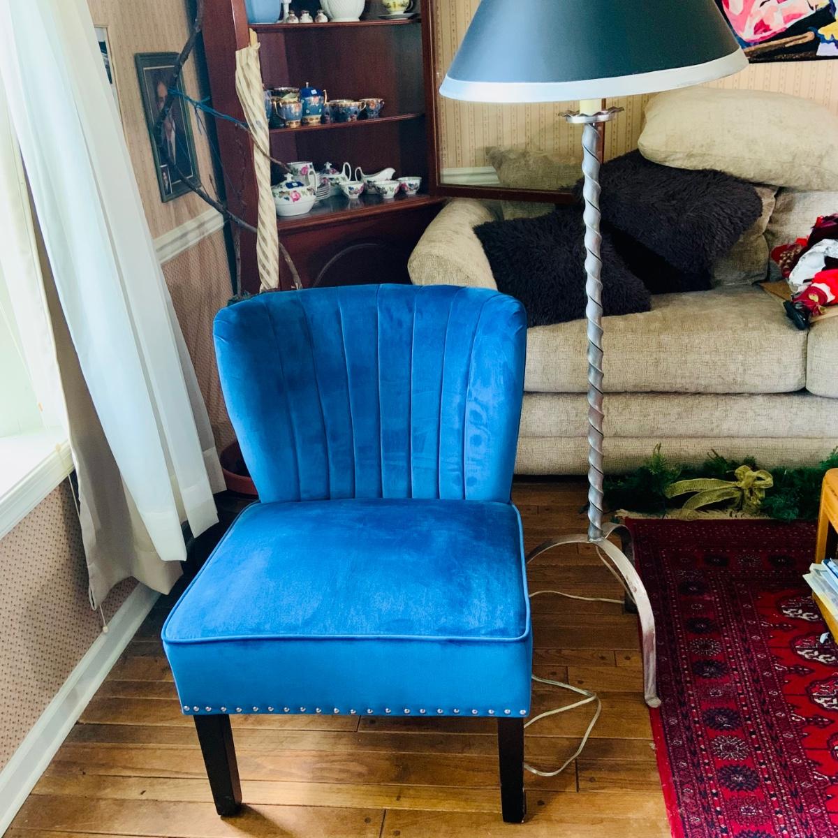 Lot 278: Blue Velvet Accent Chair and Lamp