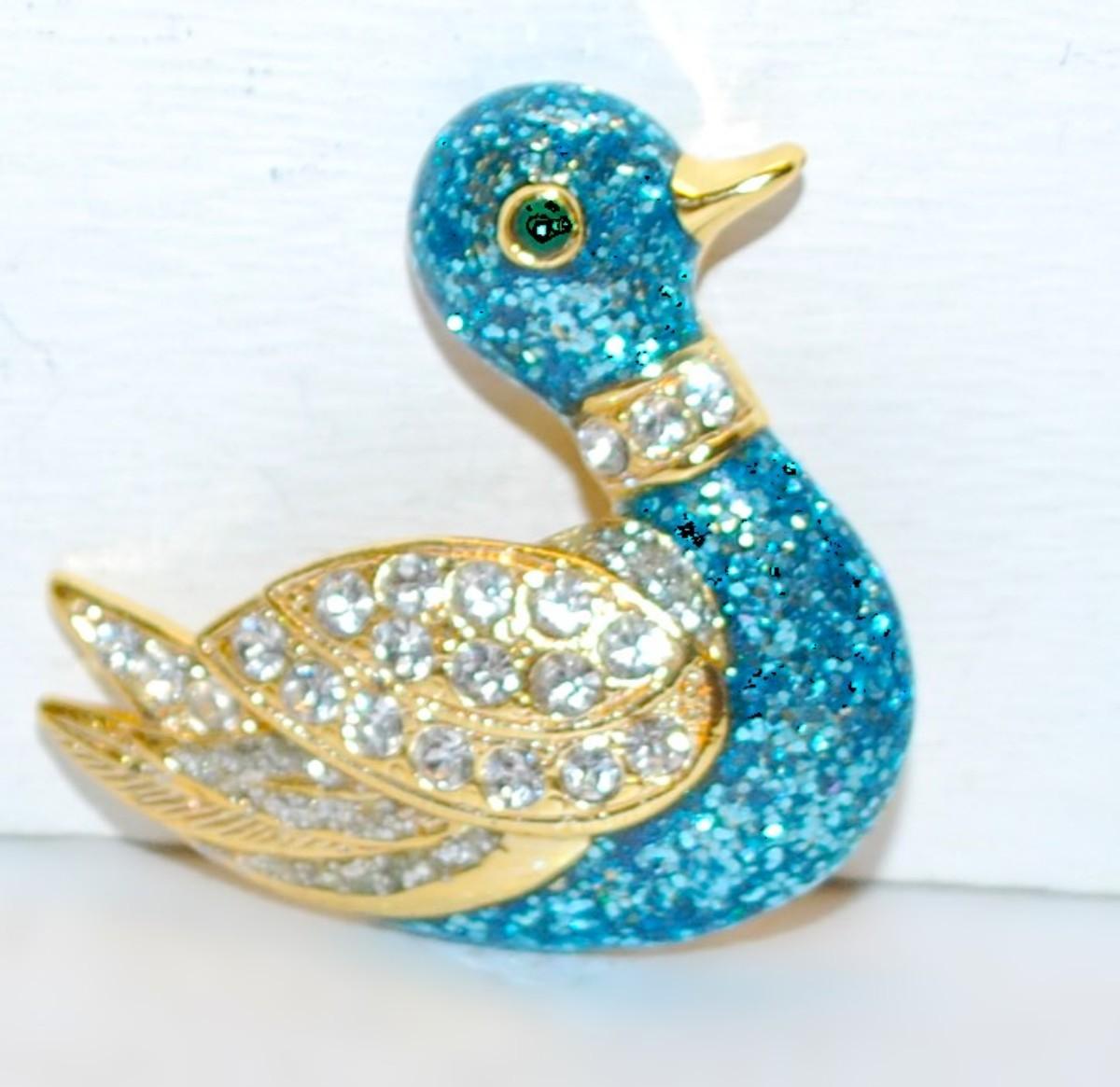 BLUE CLOISONNE' DUCK BROOCH (1½" x 1½") with Jeweled Gold Colored Wings, Collar & Beak on a Gold Tone Setting