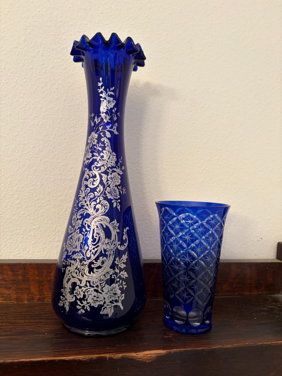 Blue cobalt with silver overlay vase & cobalt blue water glass