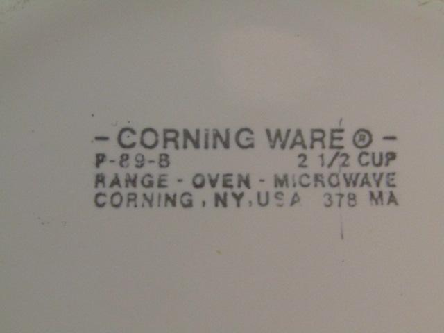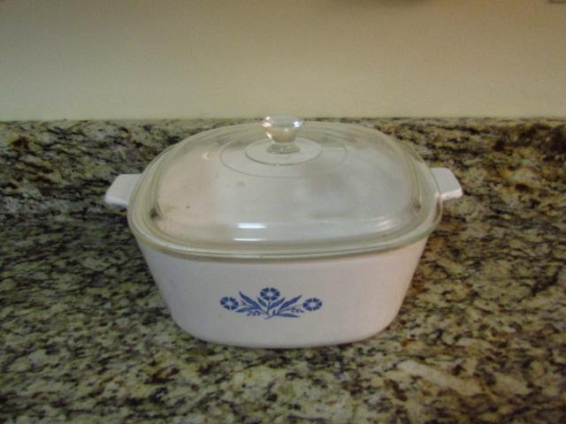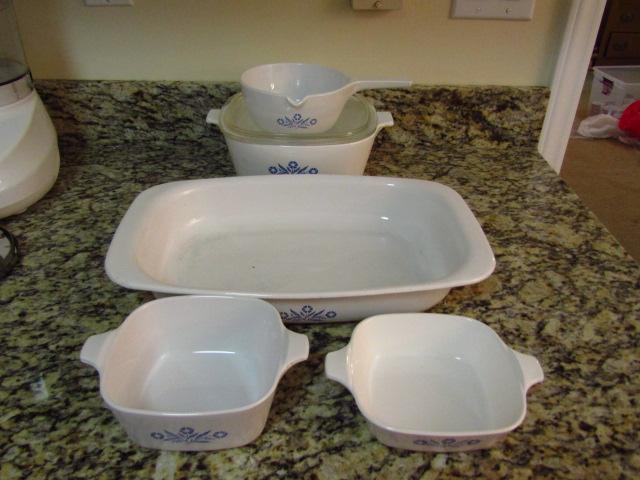 Blue Cornflower by Corning Ware- 5 Dishes, 1 Lid. 1- 2 3/4 Cup Size, 1- Petite Pan, 1- Roaster Size, 1- 2 1/2 Cup Size, 1- 2 1/2 Quart Size.