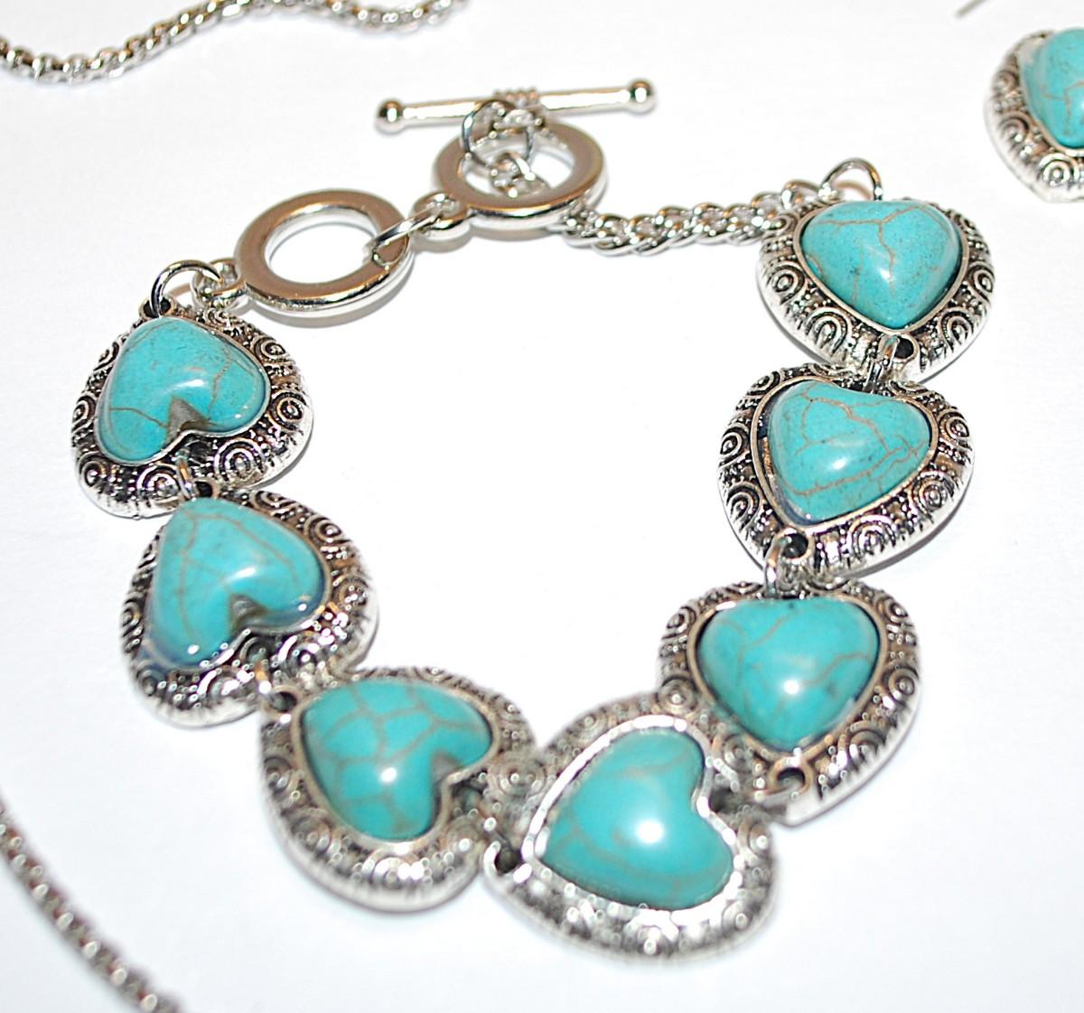 Blue "Cracked Heart" JADE-STYLE Combo PENDANT/ NECKLACE (24" L) & BRACELET (Toggle) & EARRINGS JEWELRY SET with Silver Tone Setting, Lobster Clasp + Matching Earrings Pair with Wire Hook Clasp