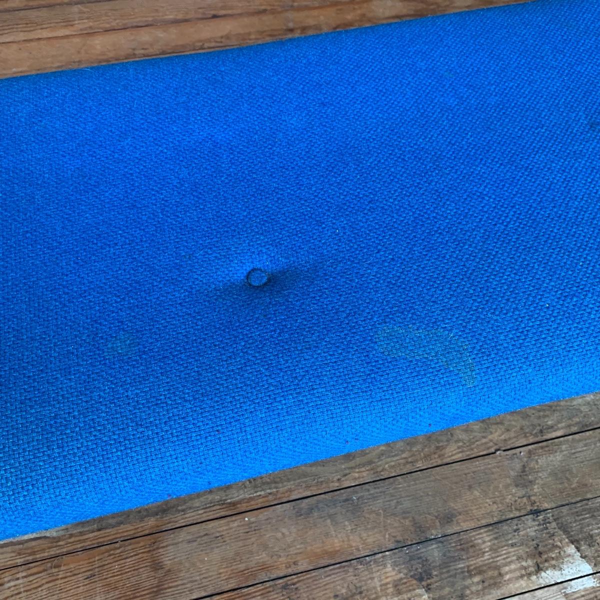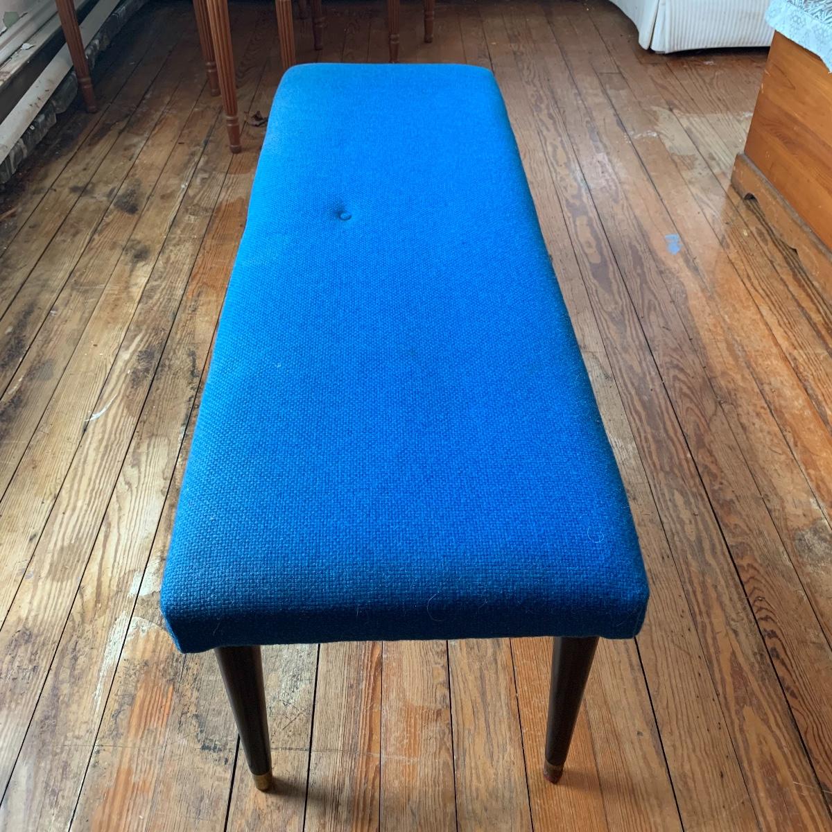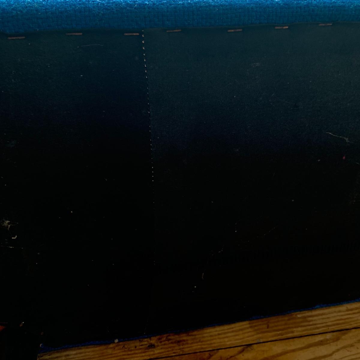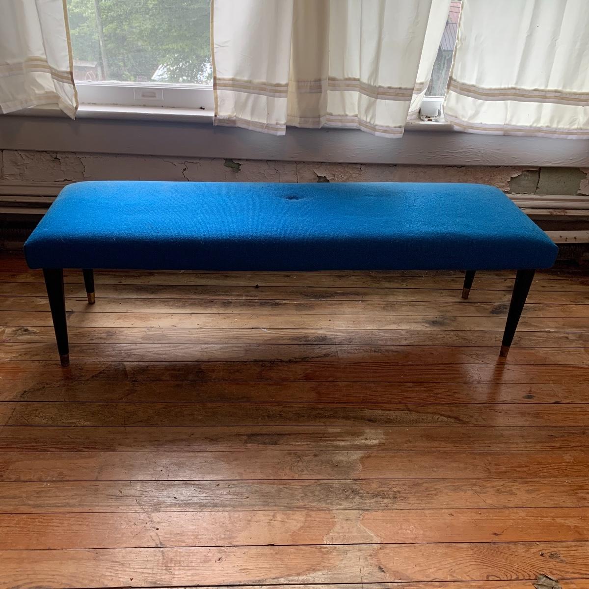 This lot is an upholstered cushioned blue bench. It stands on four painted wooden legs. The legs are slightly loose, but the bench feels sturdy when sat on. There is a small stain on the bench that appears cleanable. It measures 51.5” x 17” x 15.5”. It is quite lightweight. Local Pickup Only